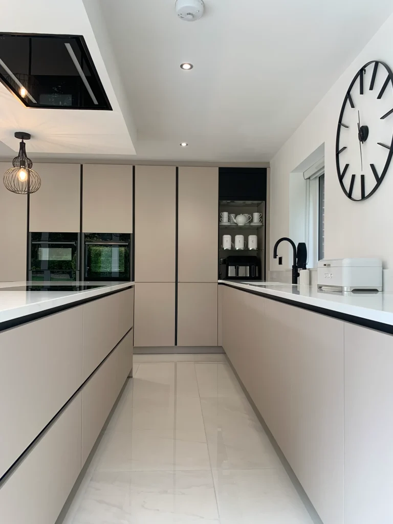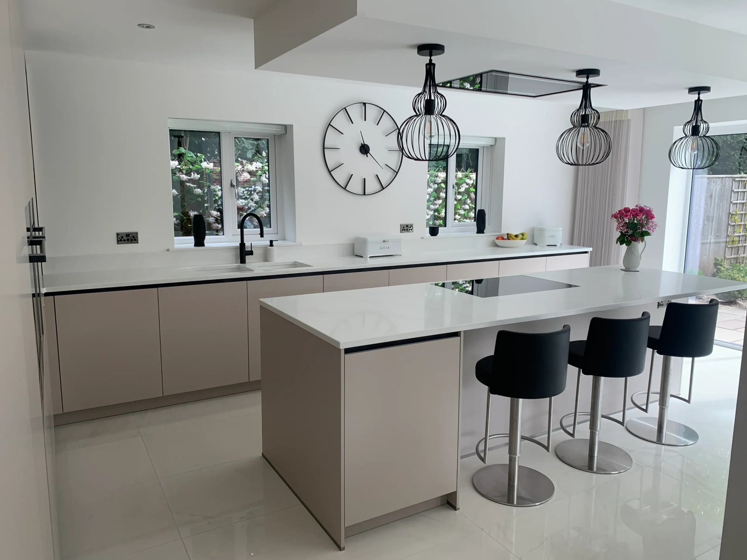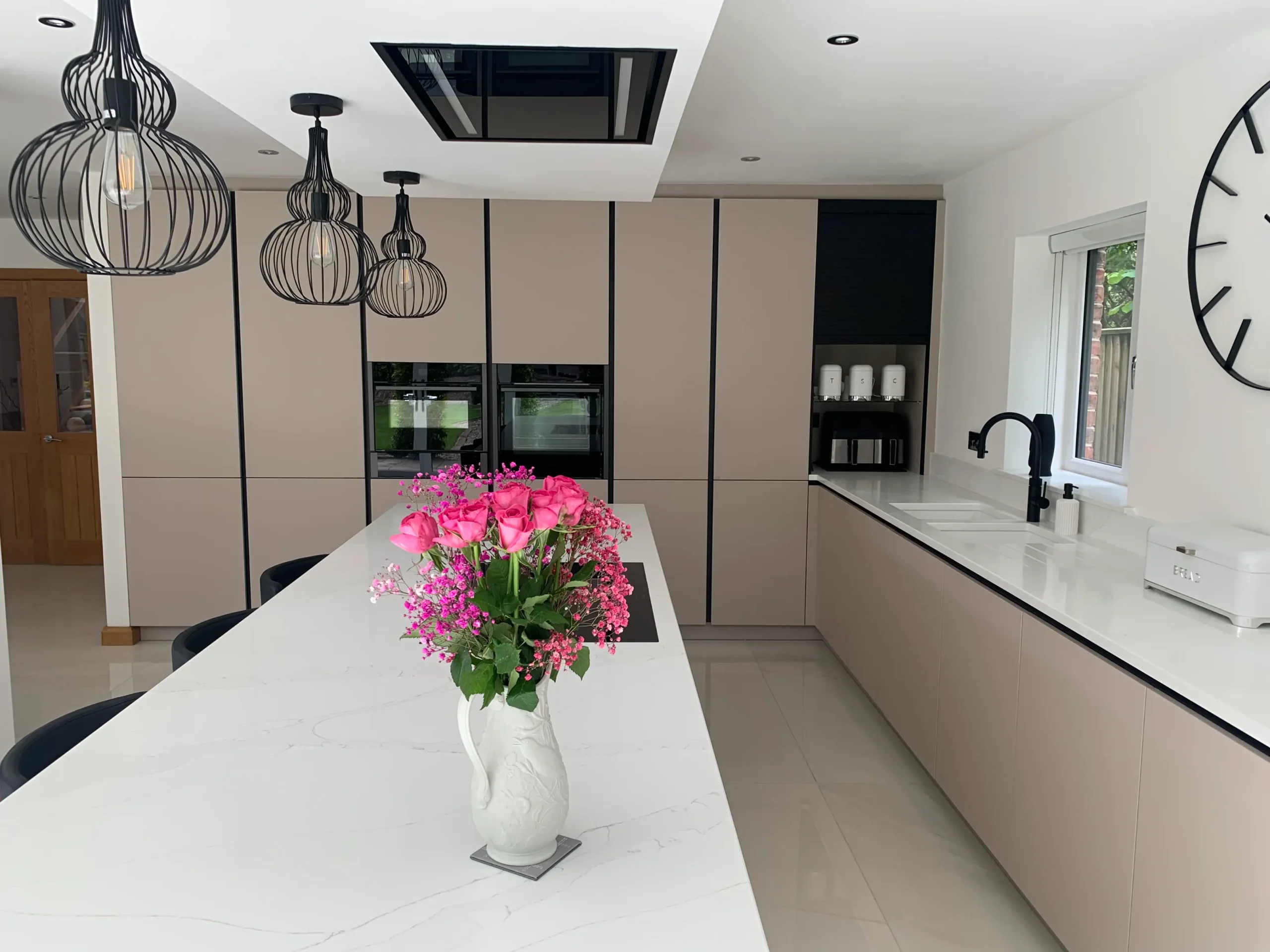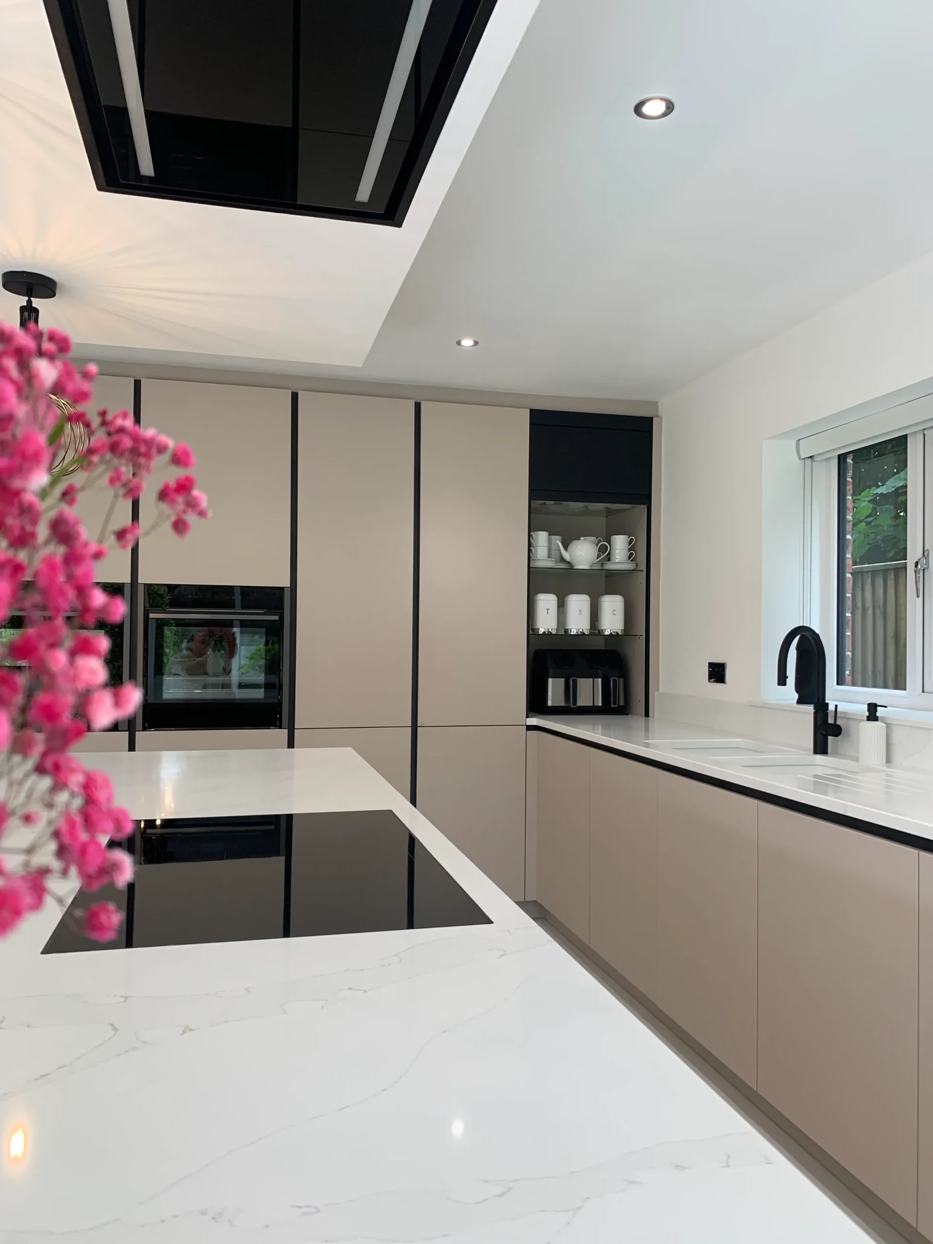This contemporary Häcker kitchen brings together the best of German craftsmanship and modern style, using a soft neutral palette and bold black accents to create a welcoming yet refined space. The layout centres on a feature island topped with luxury quartz, providing a practical social hub with plenty of seating and an integrated Siemens induction hob. Designed for both daily life and effortless entertaining, the kitchen is equipped with premium Neff ovens and a Quooker instant boiling water tap in a matching black finish, while a ceiling-mounted extractor maintains the room’s open, airy feel. This design offers a thoughtful balance of clean lines and high-quality finishes, making it a comfortable and functional heart of the home.