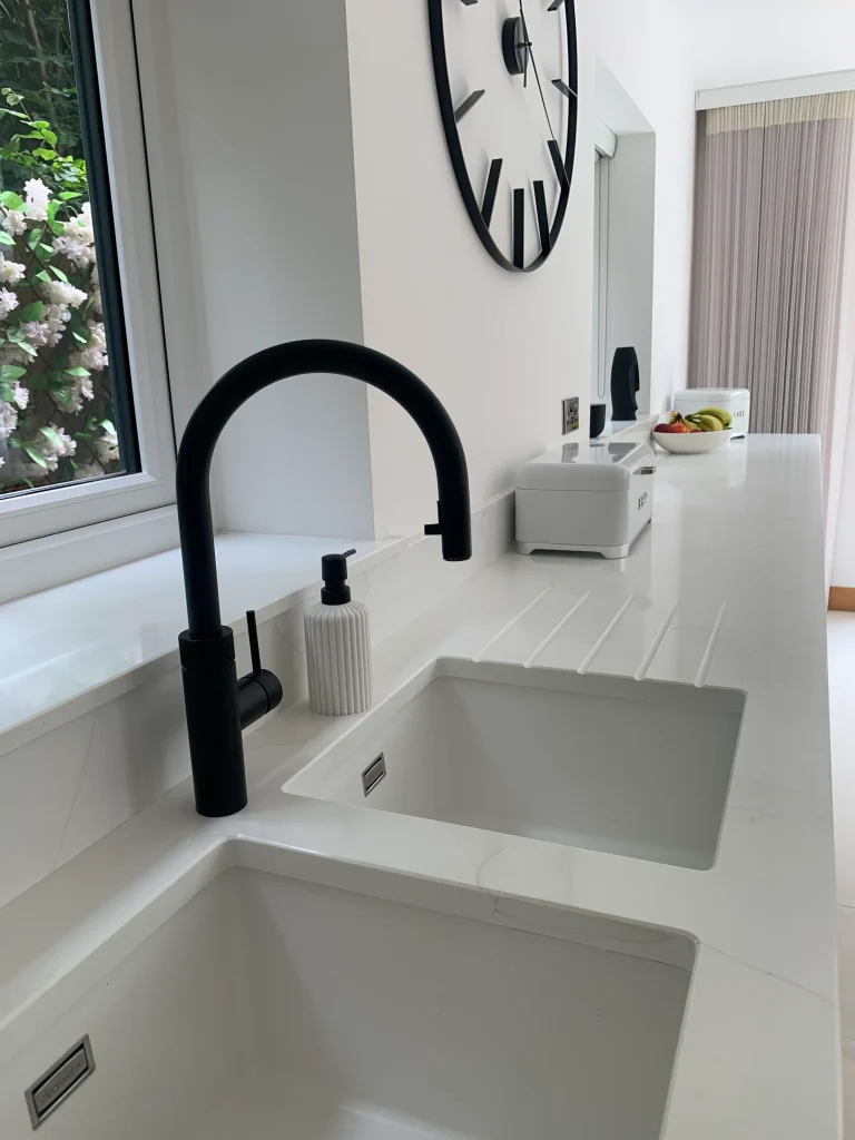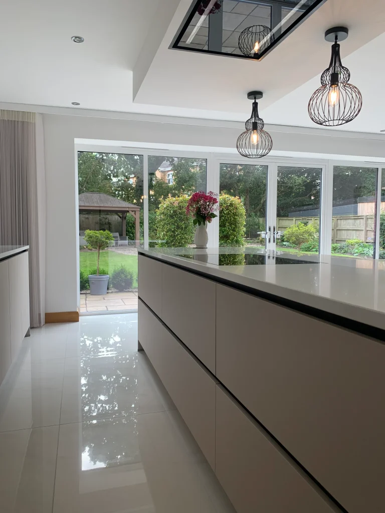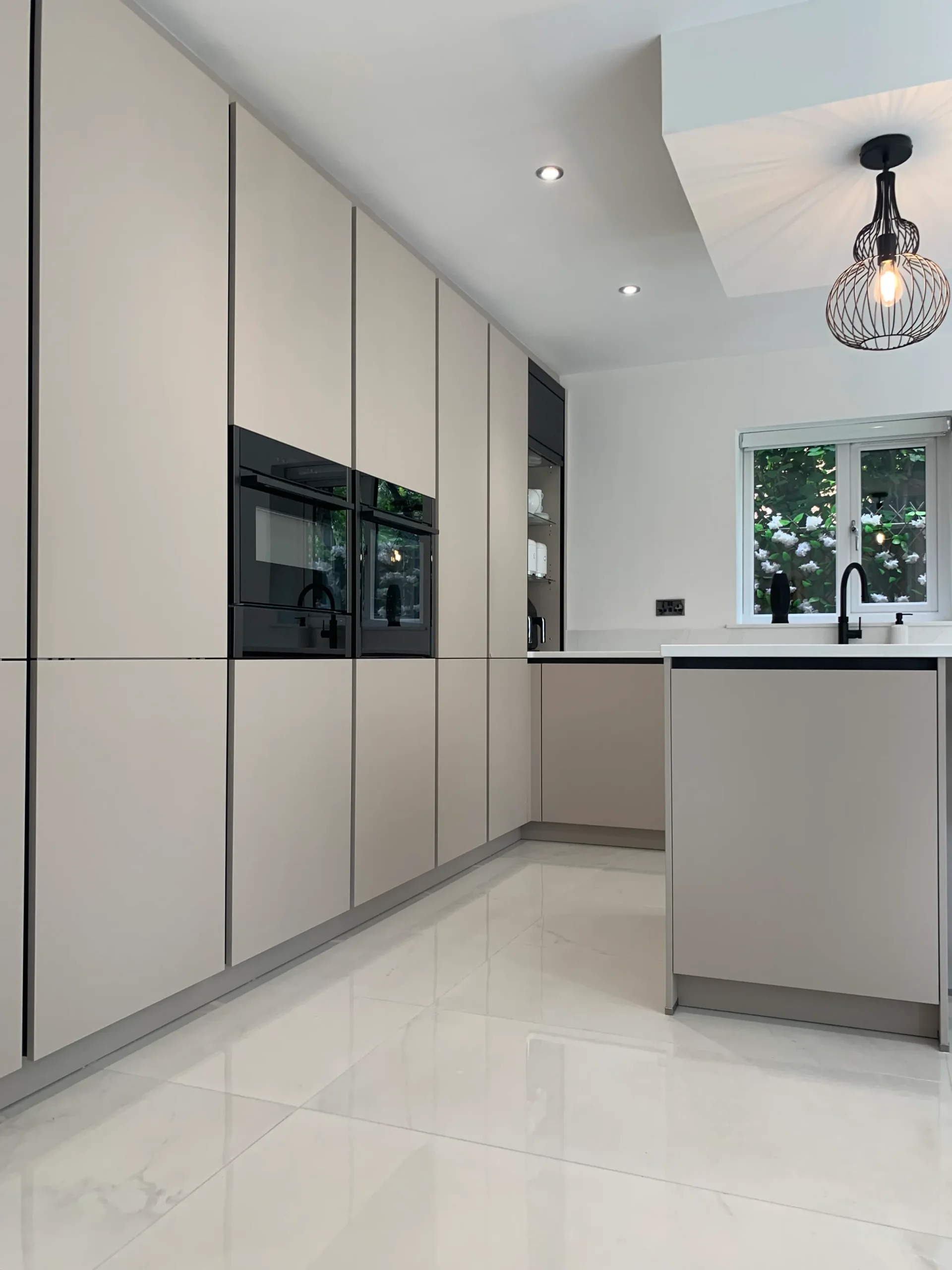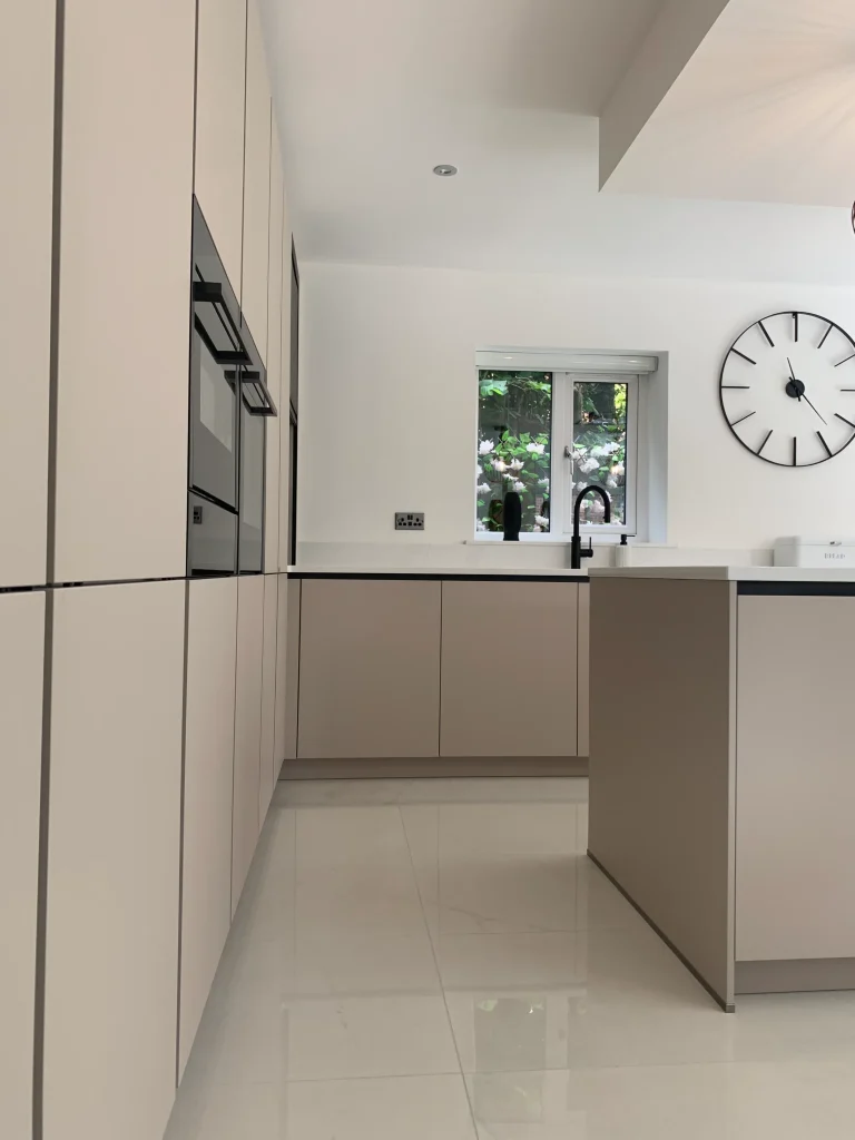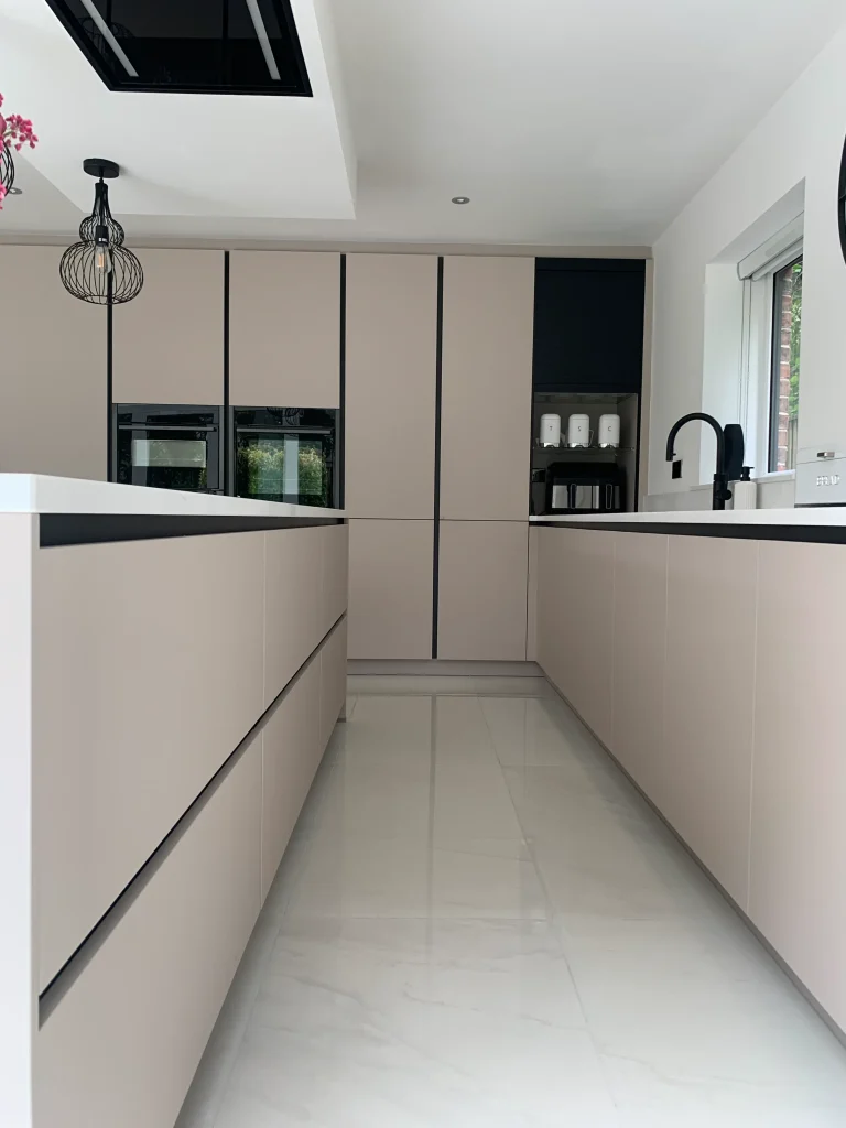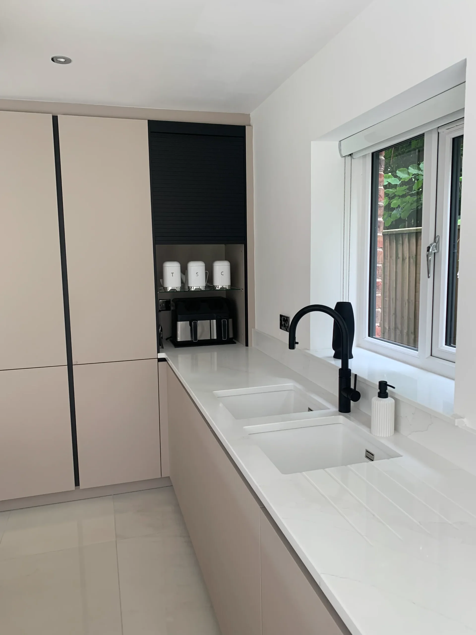 This contemporary Häcker kitchen brings together the best of German craftsmanship and modern style, using a soft neutral palette and bold black accents to create a welcoming yet refined space. The layout centres on a feature island topped with luxury quartz, providing a practical social hub with plenty of seating and an integrated Siemens induction hob. Designed for both daily life and effortless entertaining, the kitchen is equipped with premium Neff ovens and a Quooker instant boiling water tap in a matching black finish, while a ceiling-mounted extractor maintains the room’s open, airy feel. This design offers a thoughtful balance of clean lines and high-quality finishes, making it a comfortable and functional heart of the home.