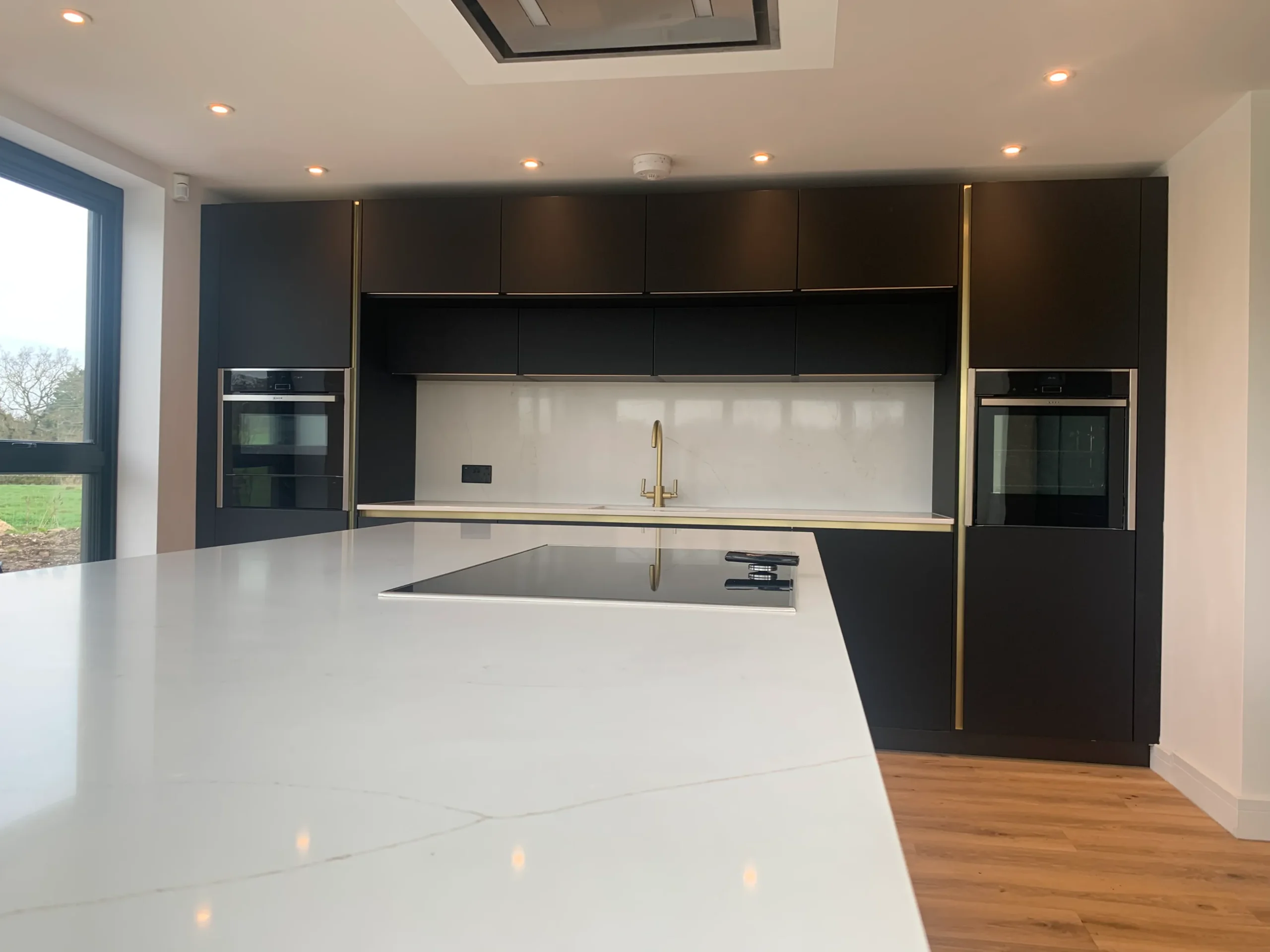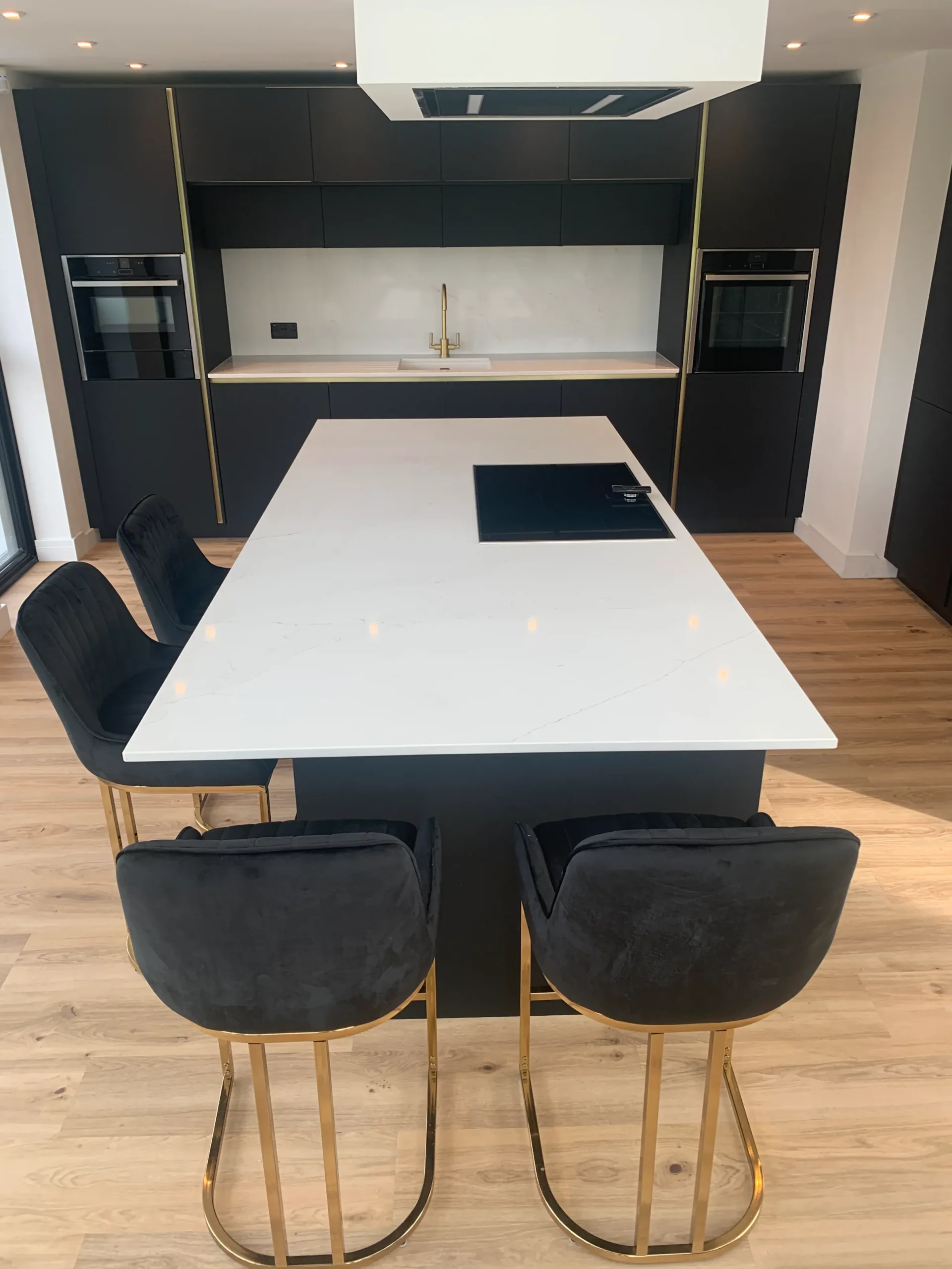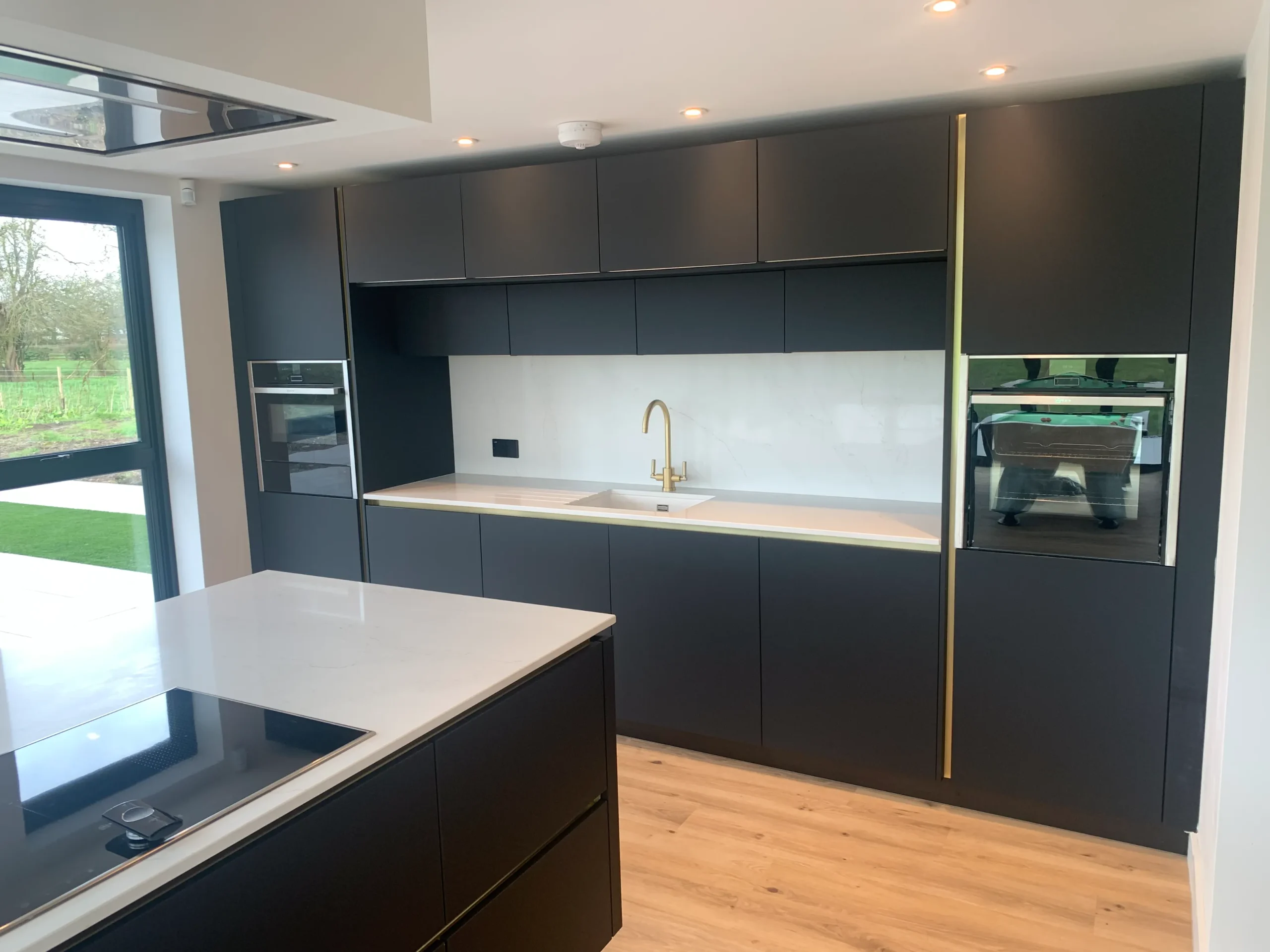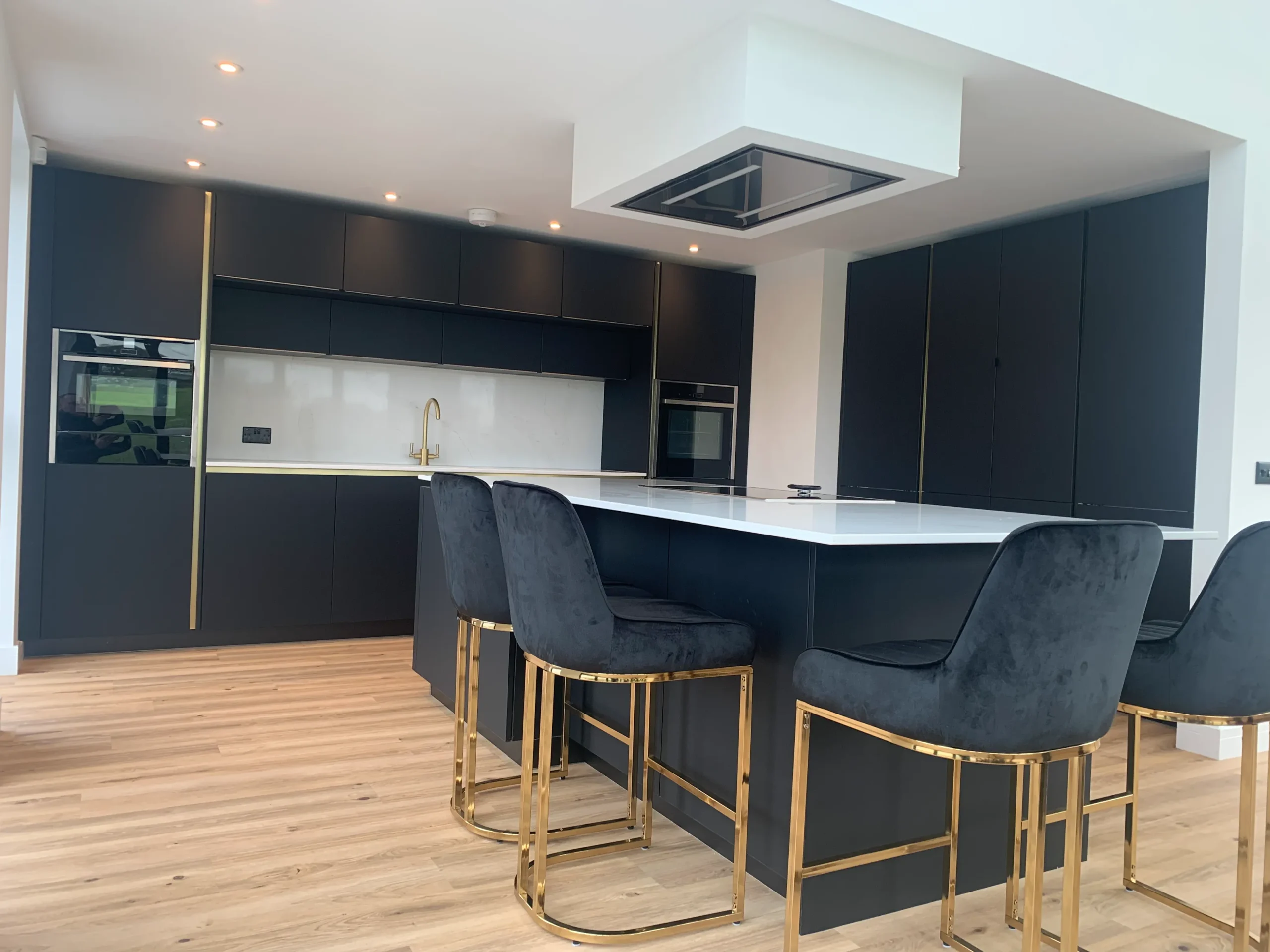 This striking Häcker German kitchen is the epitome of modern luxury, featuring a sophisticated flat matt black finish that achieves the perfectly minimalist aesthetic the clients desired. The design is masterfully elevated by elegant gold trims and accessories, which provide a stunning contrast against the dark cabinetry.