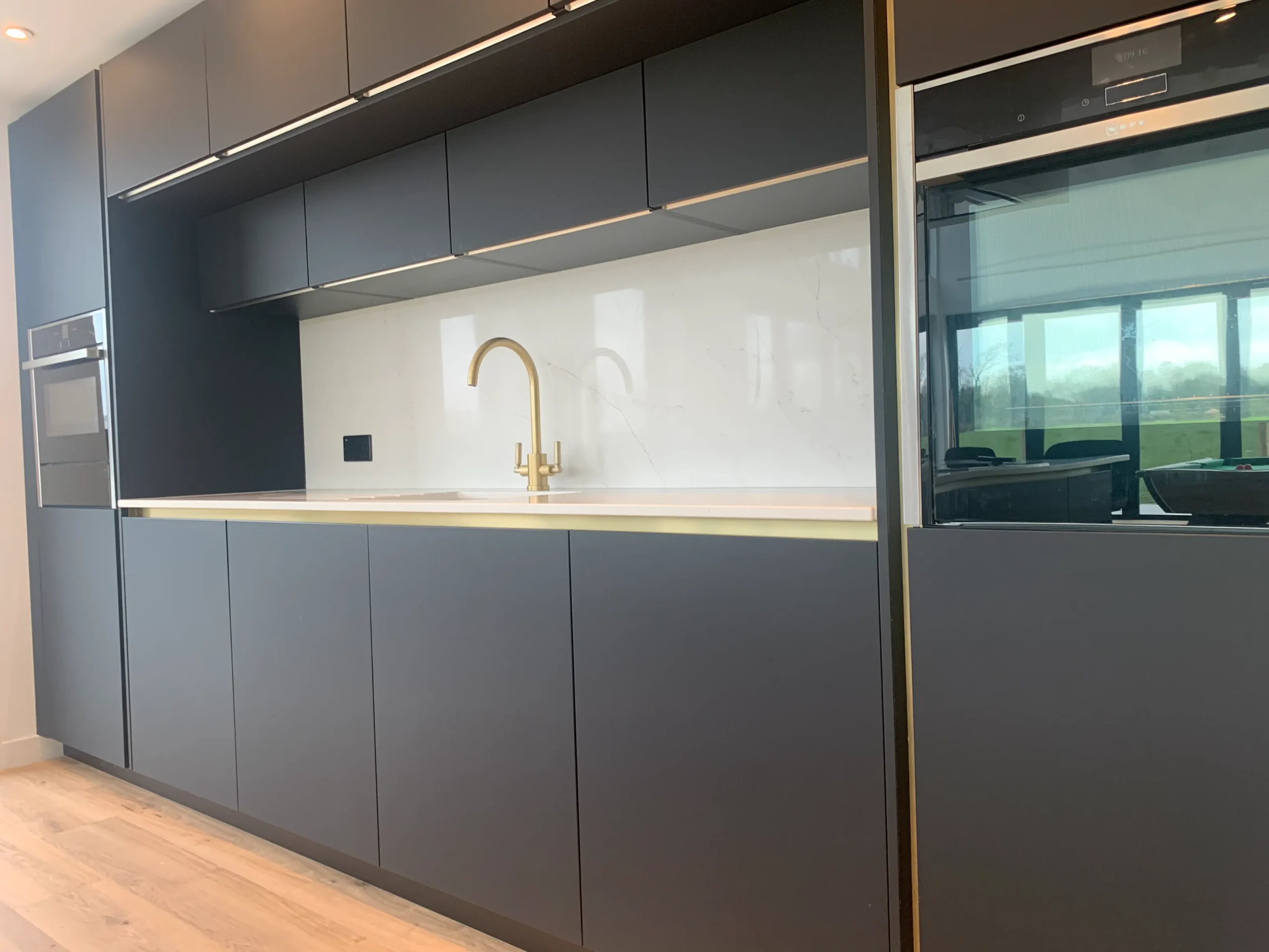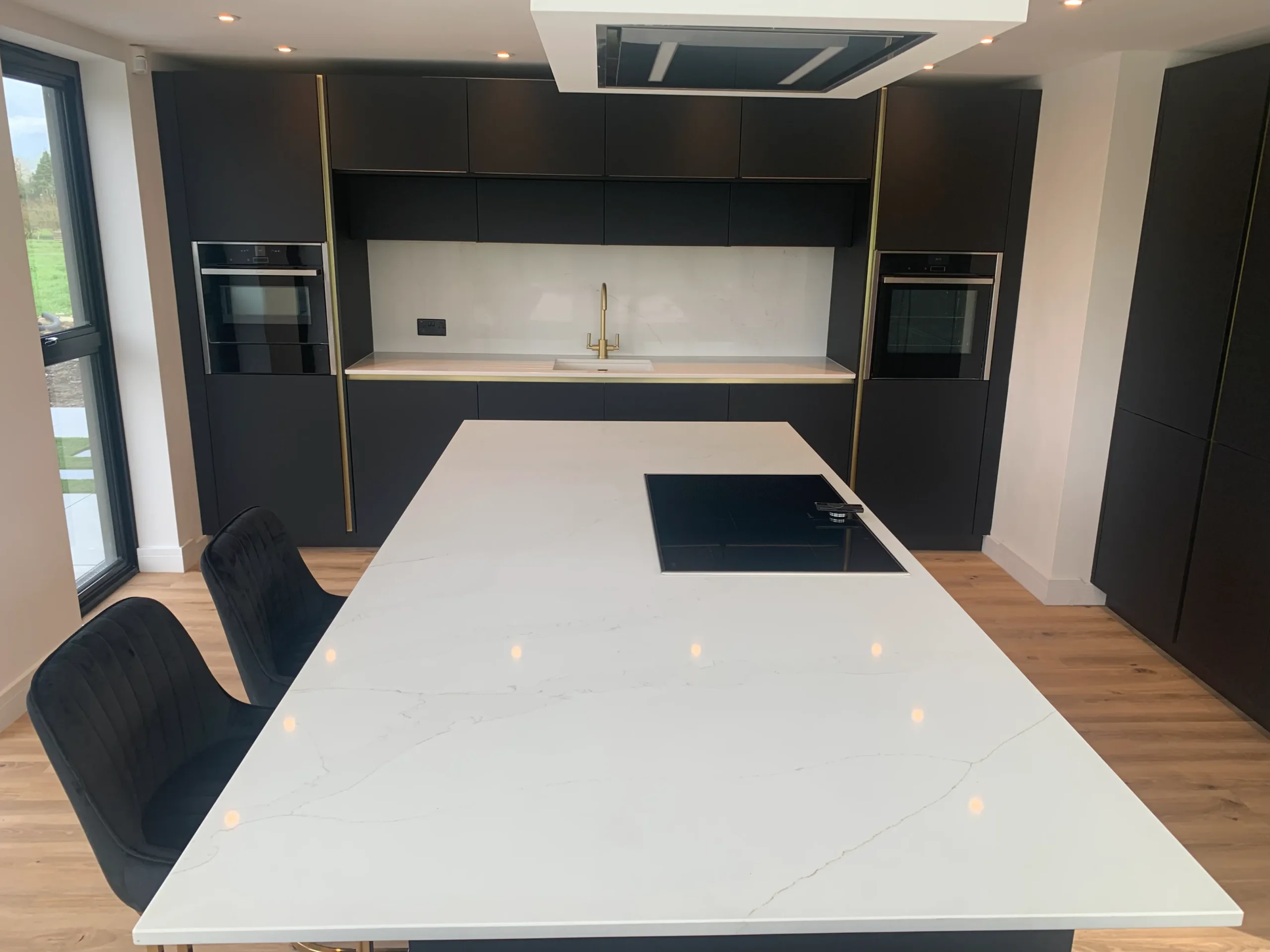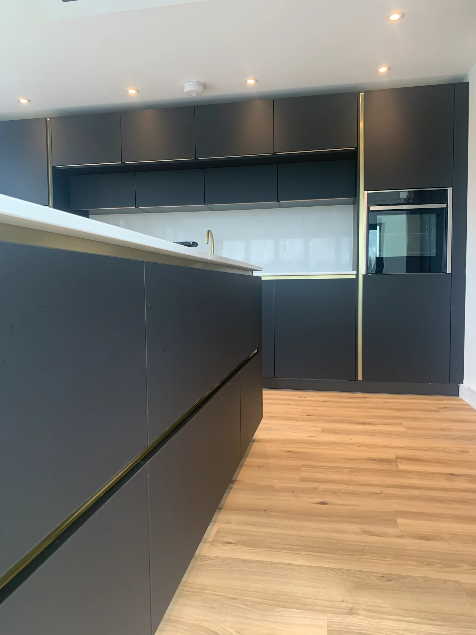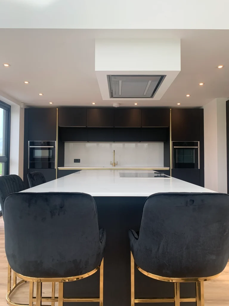This striking Häcker German kitchen is the epitome of modern luxury, featuring a sophisticated flat matt black finish that achieves the perfectly minimalist aesthetic the clients desired. The design is masterfully elevated by elegant gold trims and accessories, which provide a stunning contrast against the dark cabinetry.