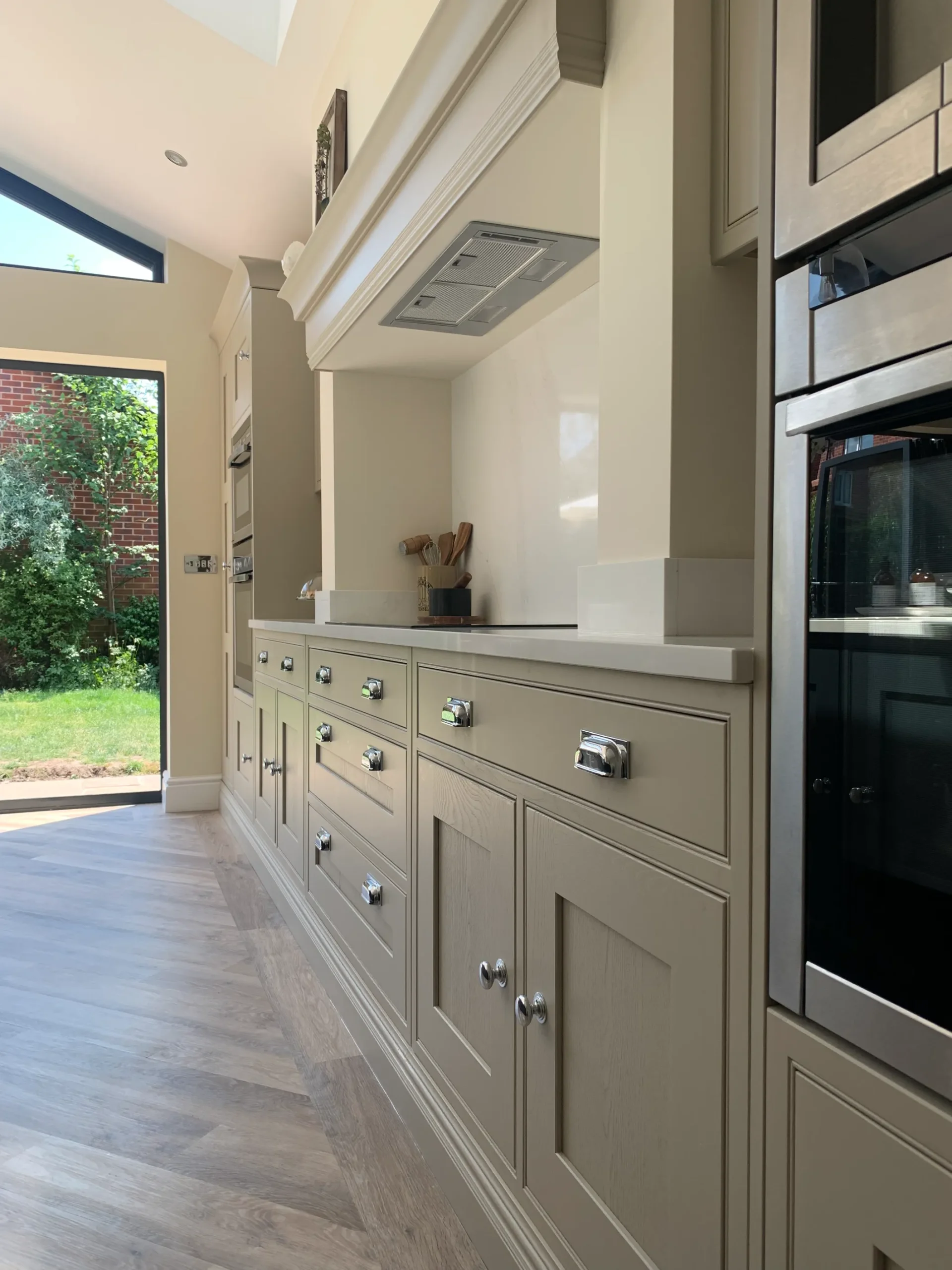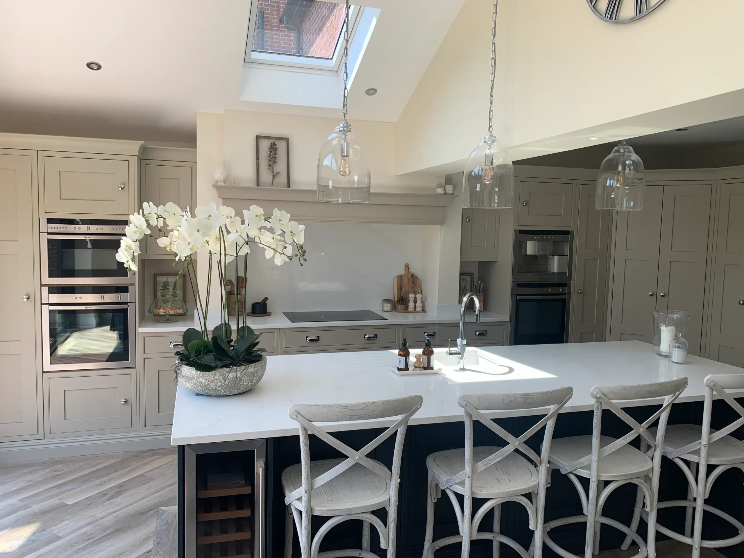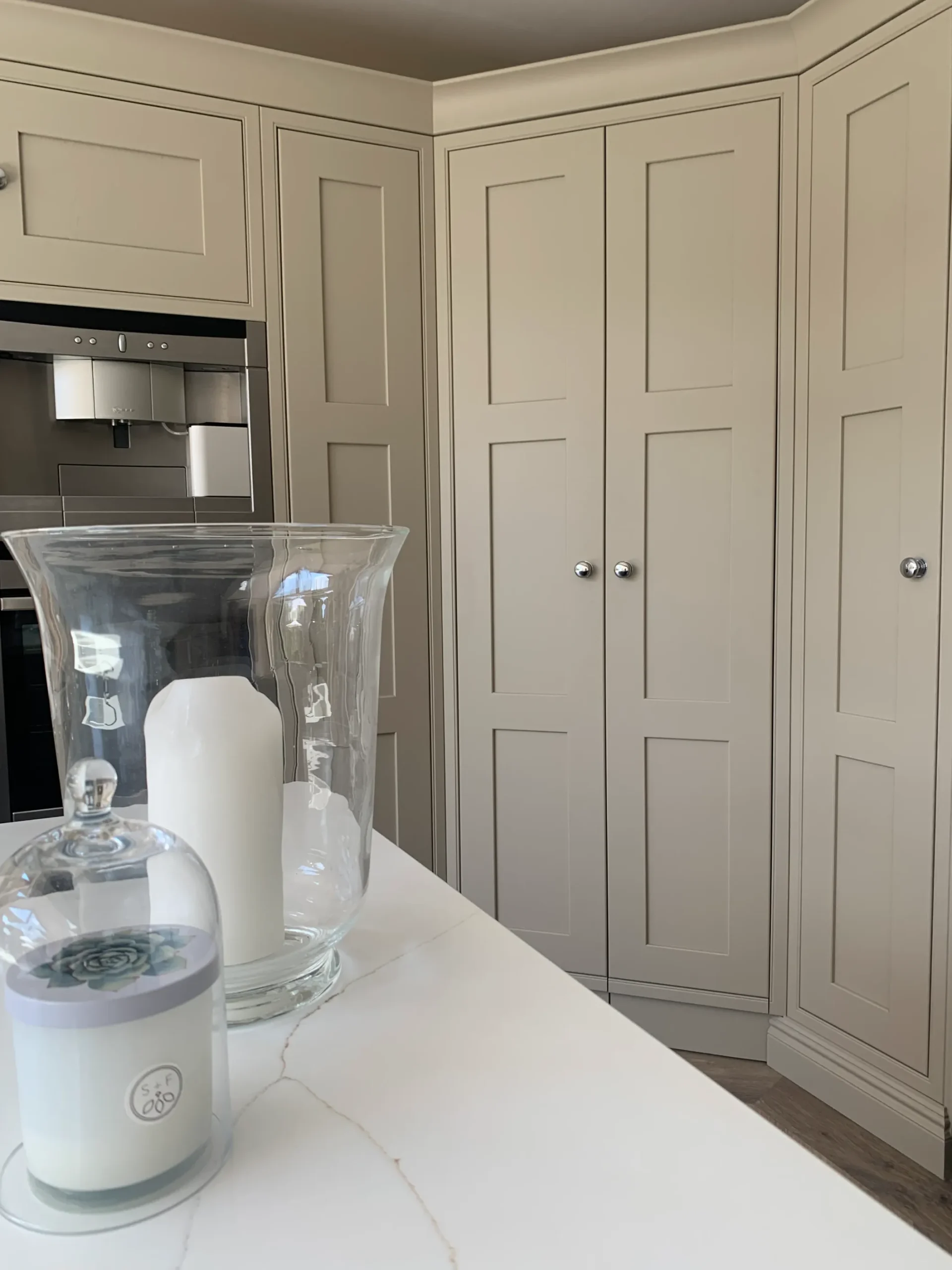 This sophisticated timber in-frame kitchen combine’s traditional craftsmanship with a bespoke hand-painted finish to create a timeless aesthetic tailored for the modern family. The design prioritizes organization, offering an expansive walk-in pantry and a suite of deep-format drawers that provide effortless storage for a busy household. By seamlessly integrating existing high-performance Neff appliances, the space balances professional functionality with a warm, lived-in feel.