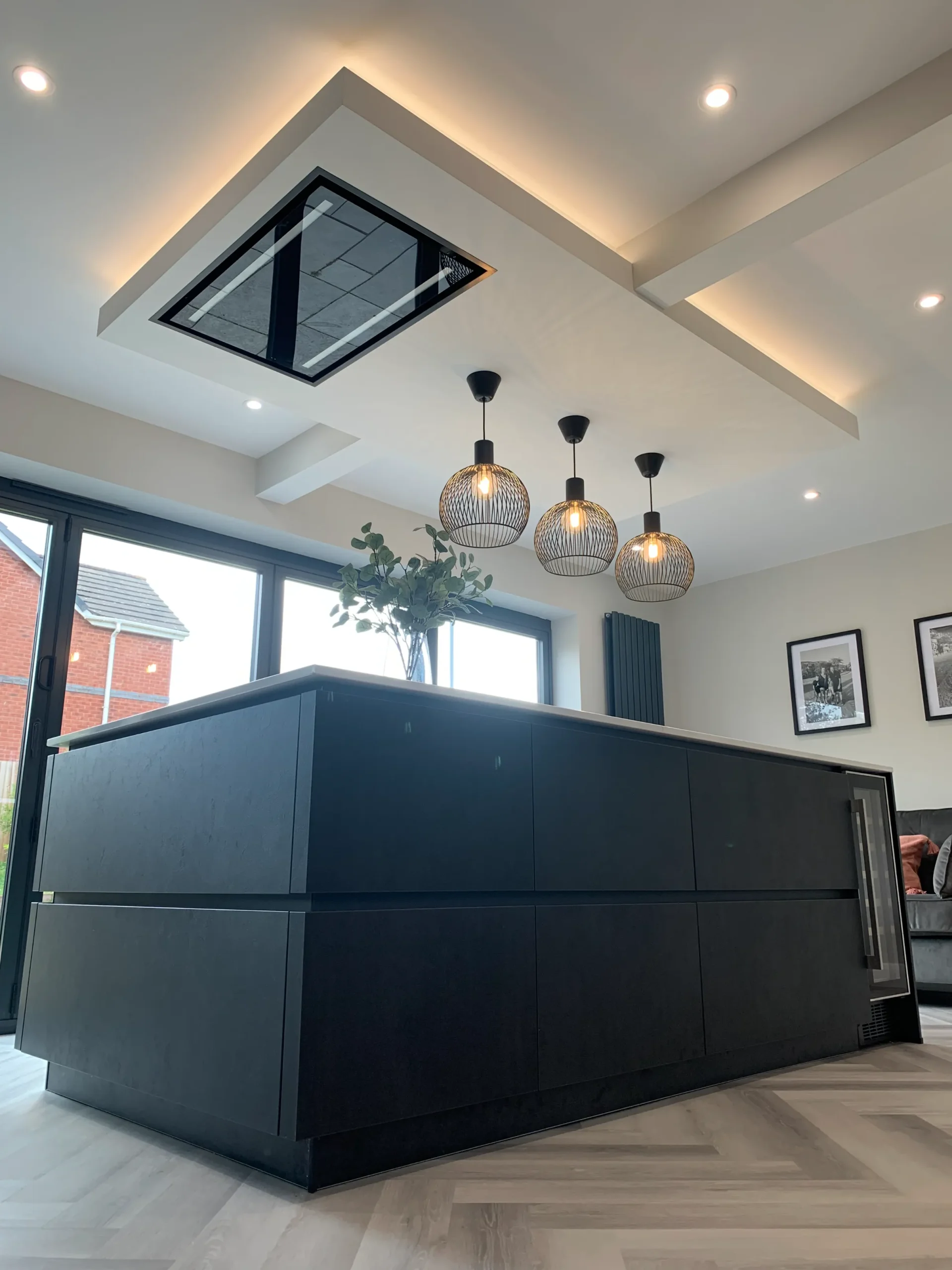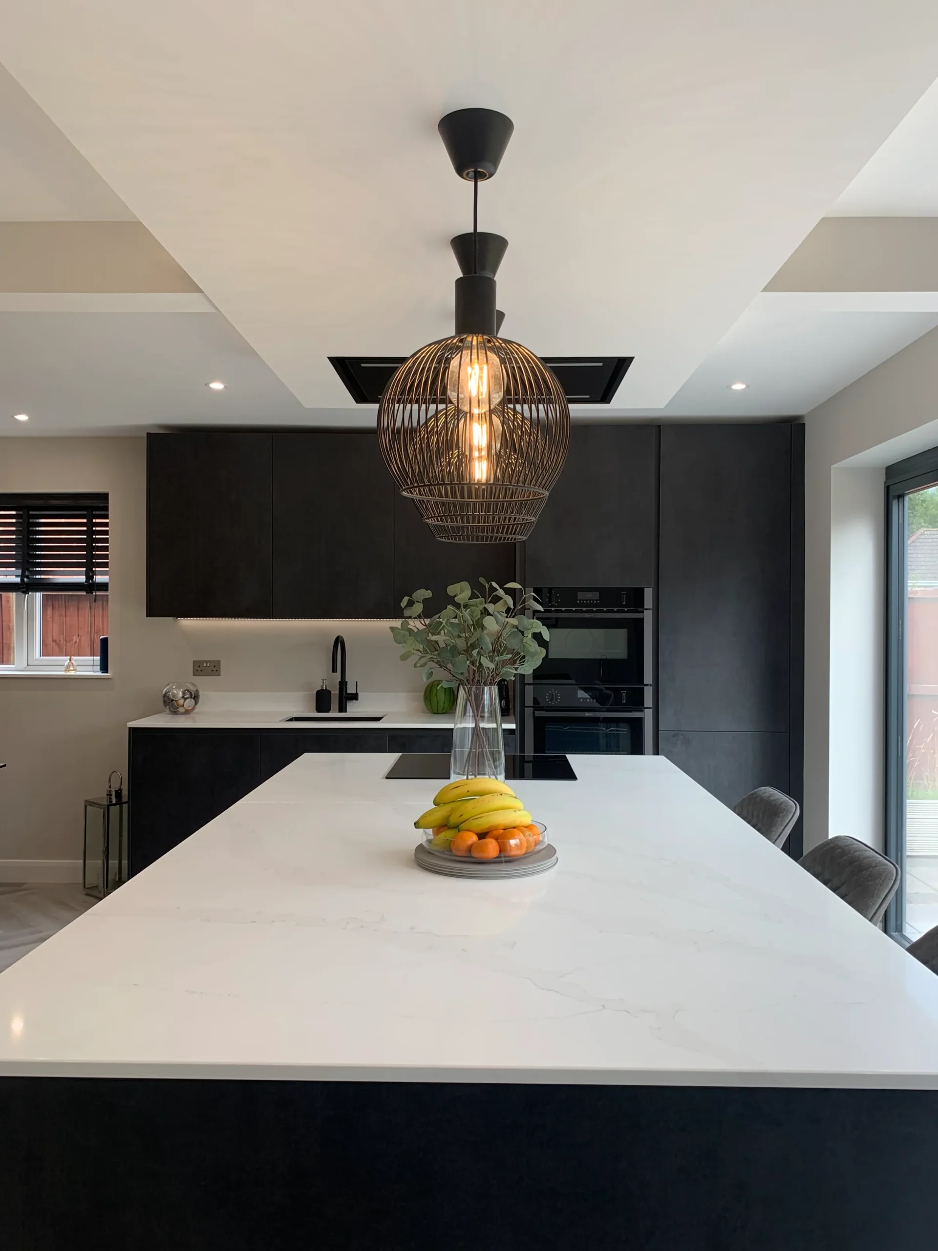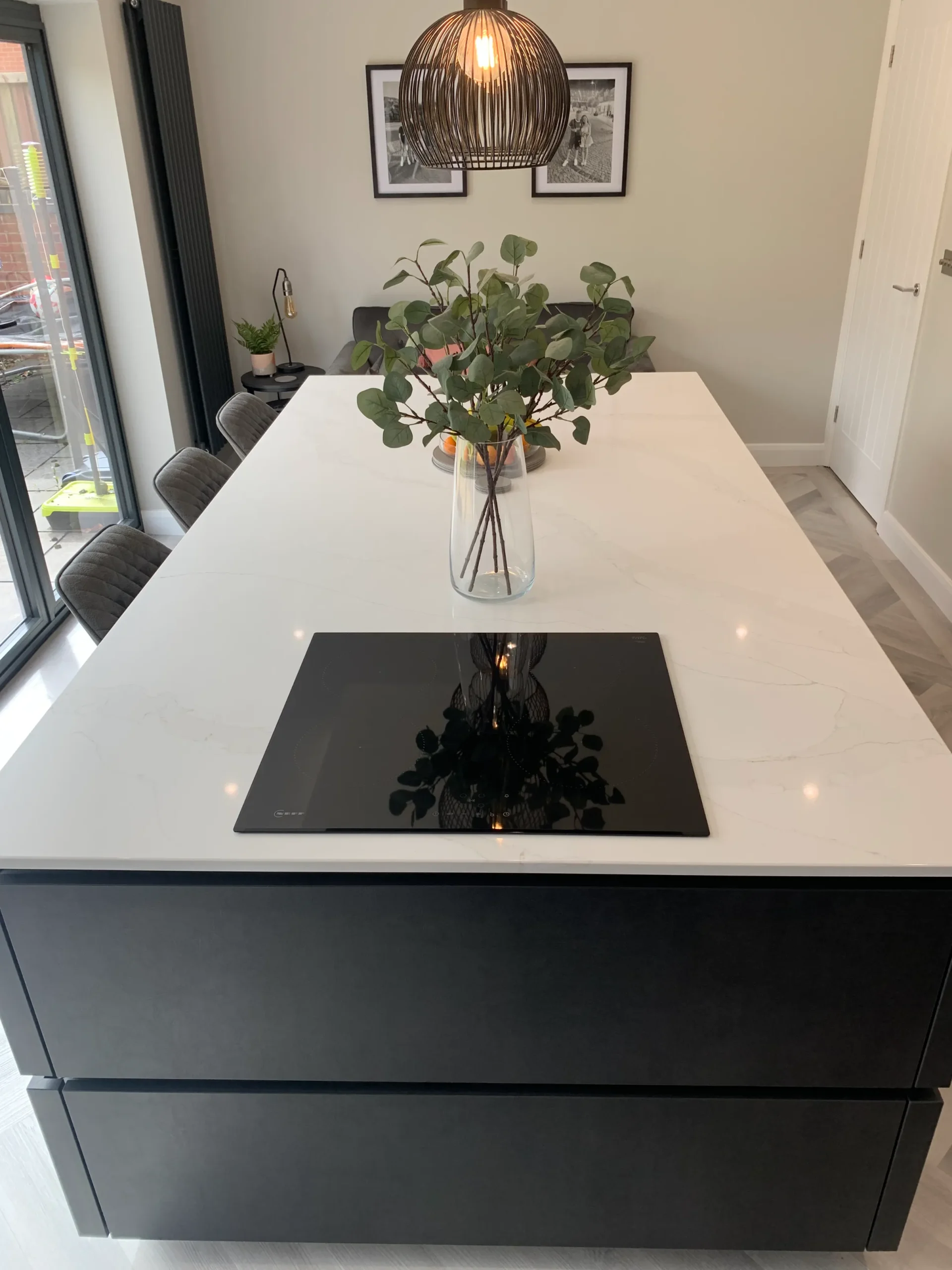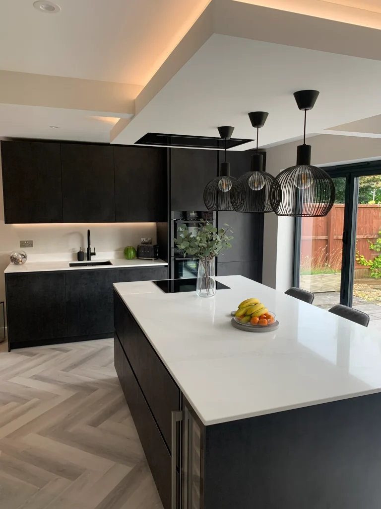 This contemporary Häcker German kitchen makes a bold statement with dark, industrial-textured cabinetry that is as tactile as it is visually stunning. The heart of the home is a feature island housing a Neff induction hob, positioned beneath a purpose-built bulkhead that integrates both a ceiling-mounted extractor and elegant feature lighting. Every detail is designed for effortless flow, from the dedicated Neff oven cooking zone to the striking presence of a Quooker instant boiling hot water tap, beautifully finished in black. Topped with luxury quartz work surfaces, the space transitions harmoniously into an inviting dining area, creating a sophisticated environment that is truly a dream for both cooking and entertaining.