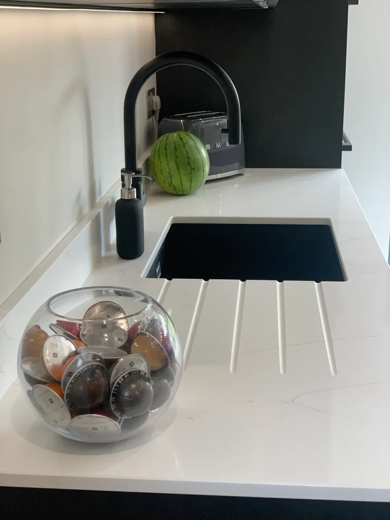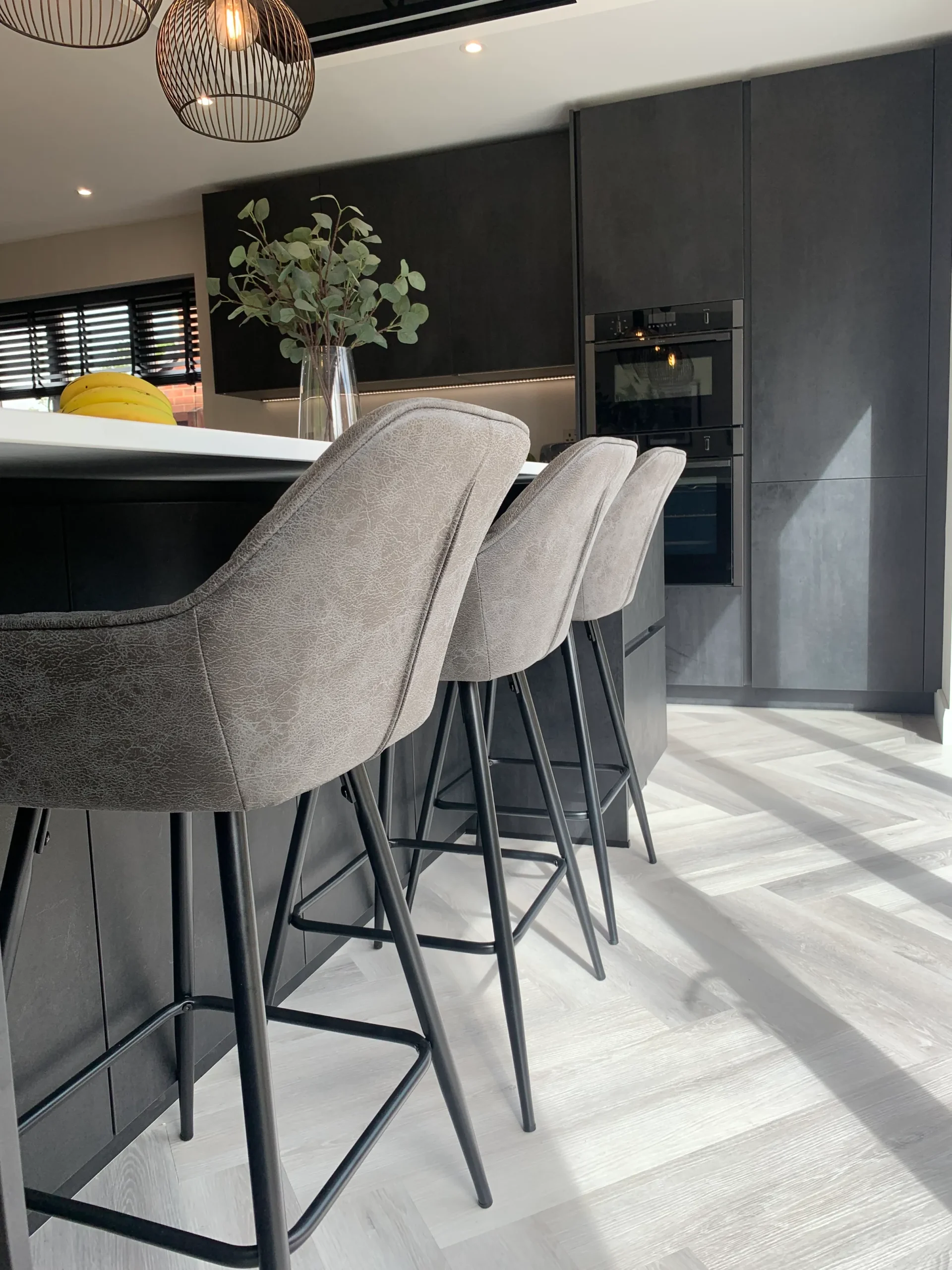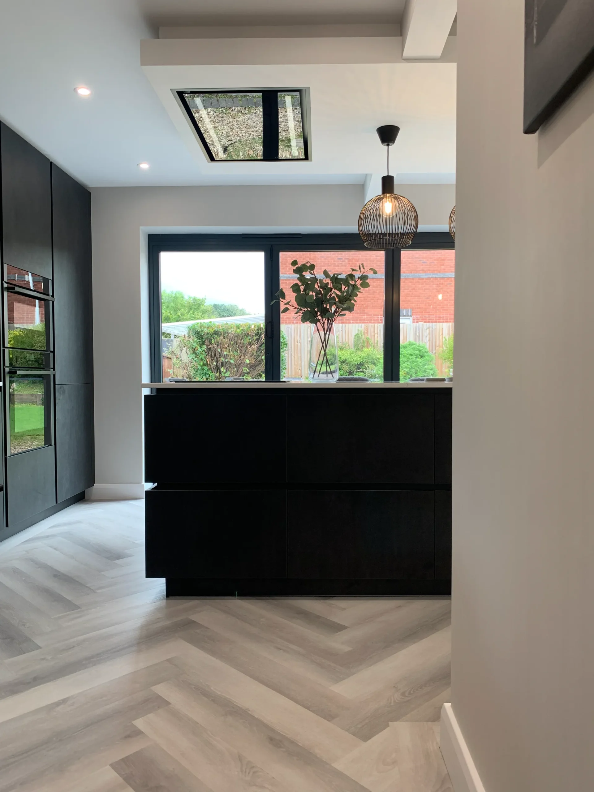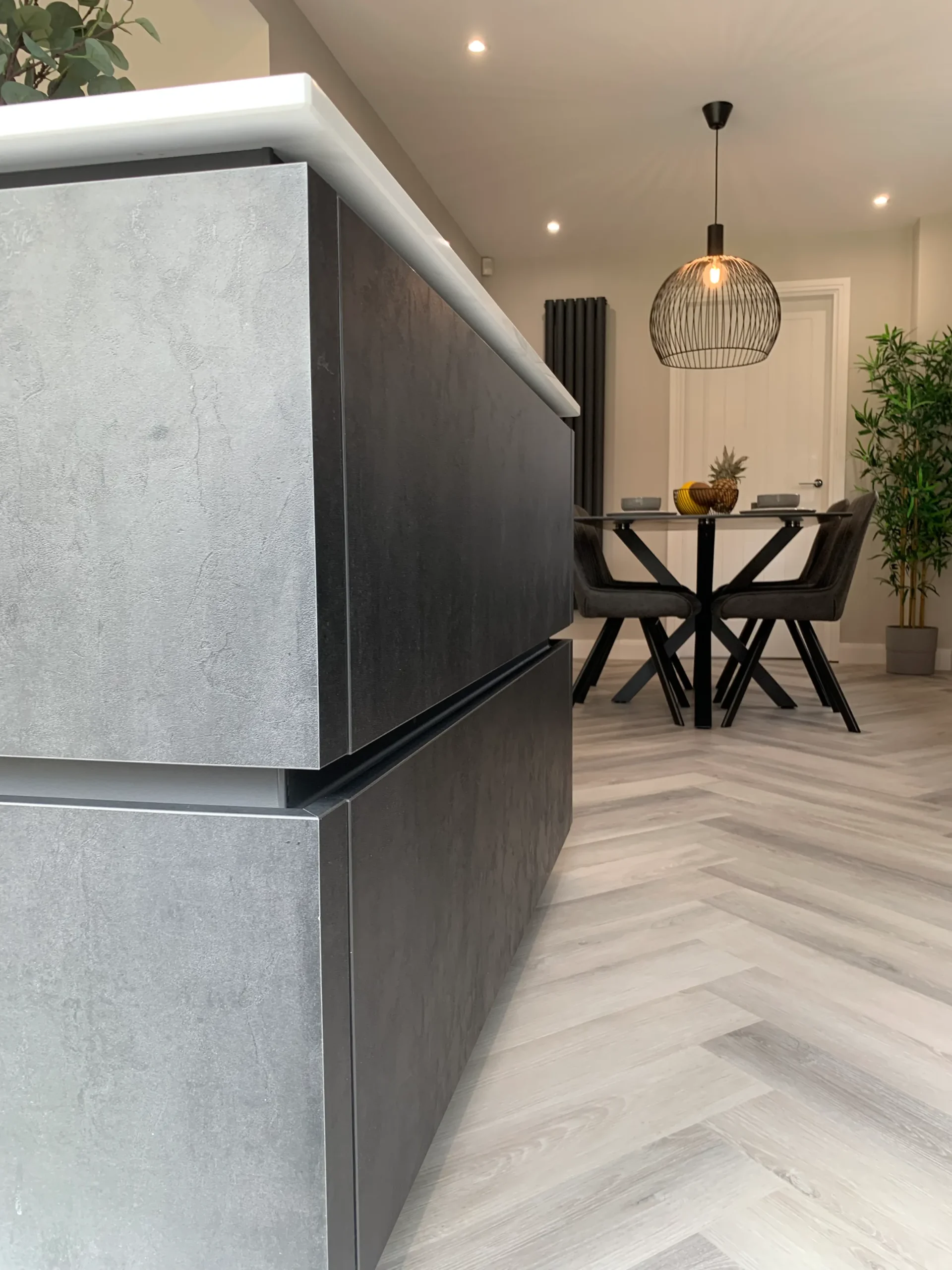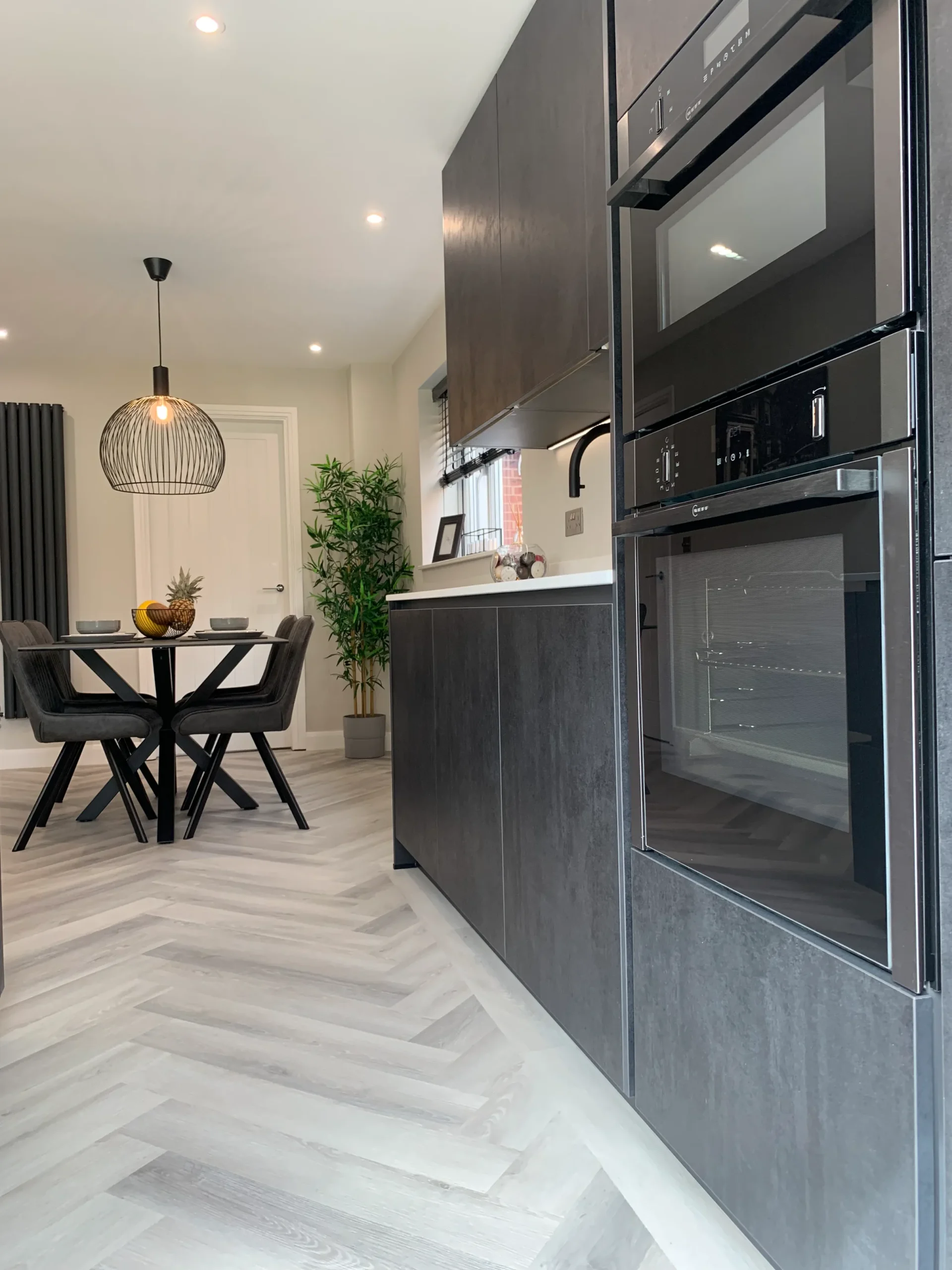 This contemporary Häcker German kitchen makes a bold statement with dark, industrial-textured cabinetry that is as tactile as it is visually stunning. The heart of the home is a feature island housing a Neff induction hob, positioned beneath a purpose-built bulkhead that integrates both a ceiling-mounted extractor and elegant feature lighting. Every detail is designed for effortless flow, from the dedicated Neff oven cooking zone to the striking presence of a Quooker instant boiling hot water tap, beautifully finished in black. Topped with luxury quartz work surfaces, the space transitions harmoniously into an inviting dining area, creating a sophisticated environment that is truly a dream for both cooking and entertaining.
