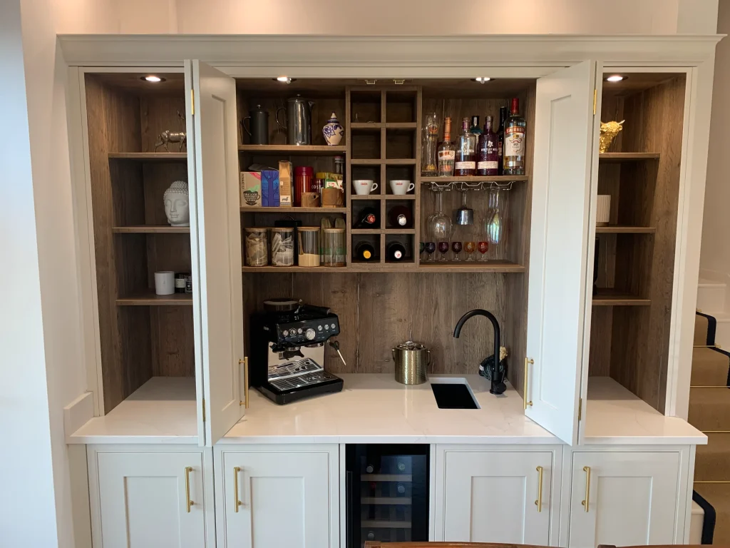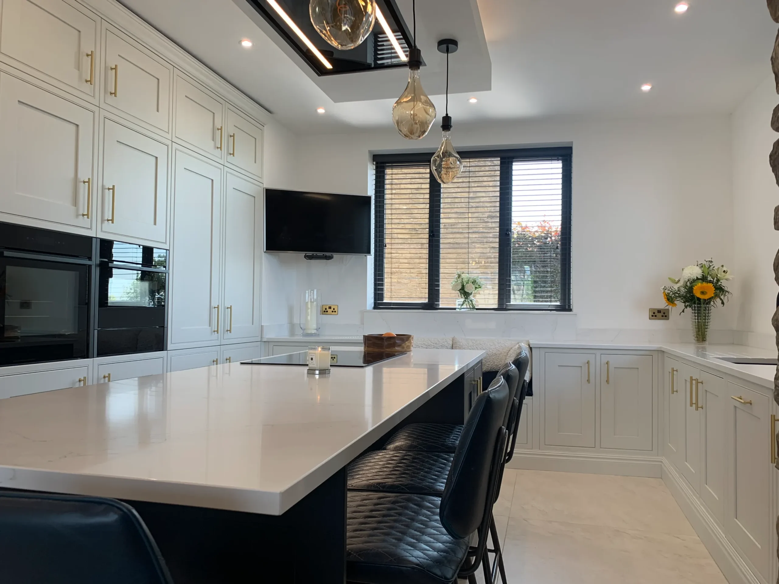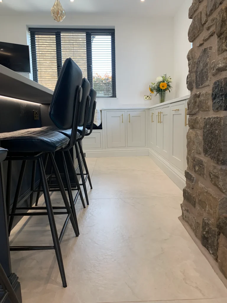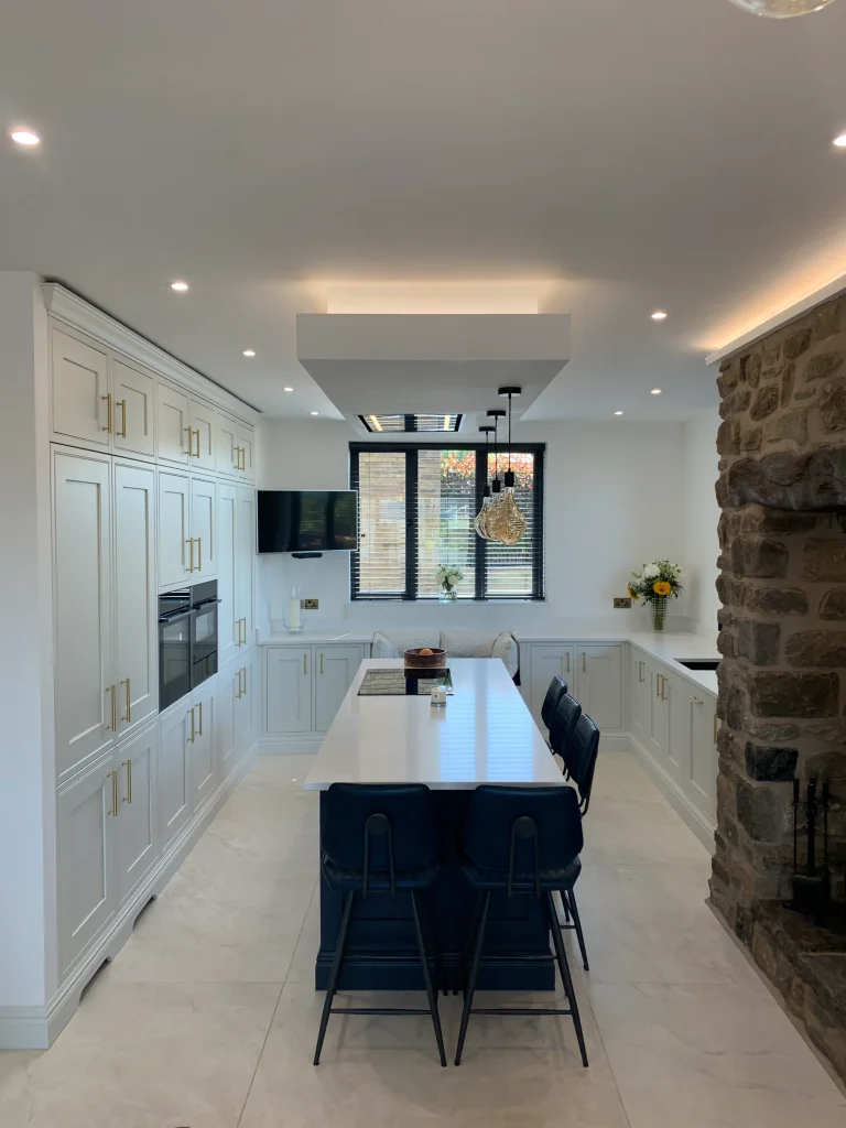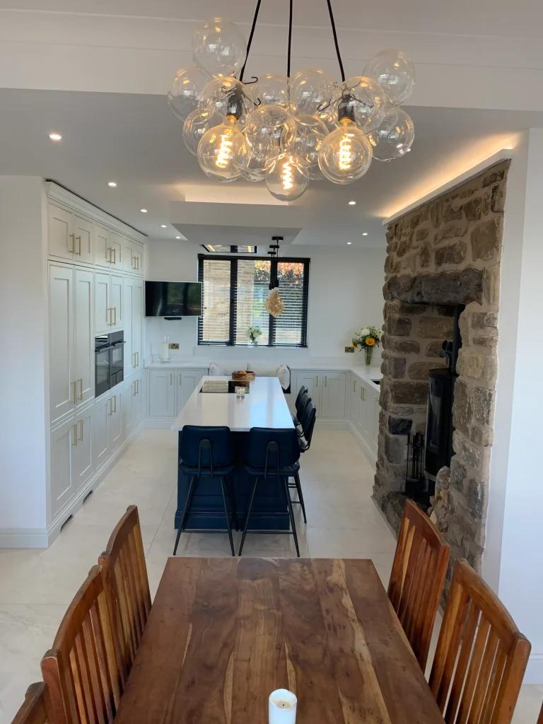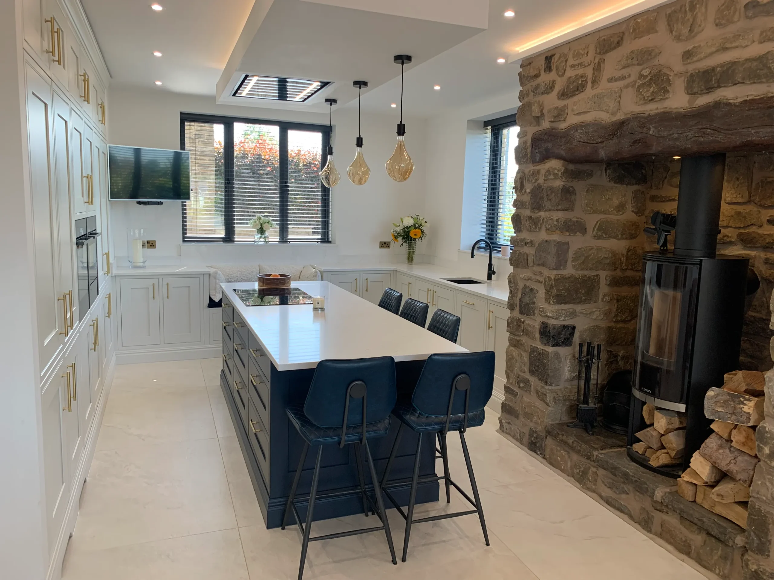 Above the island, a bespoke feature bulkhead incorporates both powerful ceiling extraction and ambient lighting, creating a seamless architectural look. The room’s original character is celebrated by a magnificent stone fireplace, perfectly complemented by a dedicated bench seating area—ideal for slow mornings or evening conversation. This is more than a kitchen; it is a meticulously curated living space designed for those who love to host.