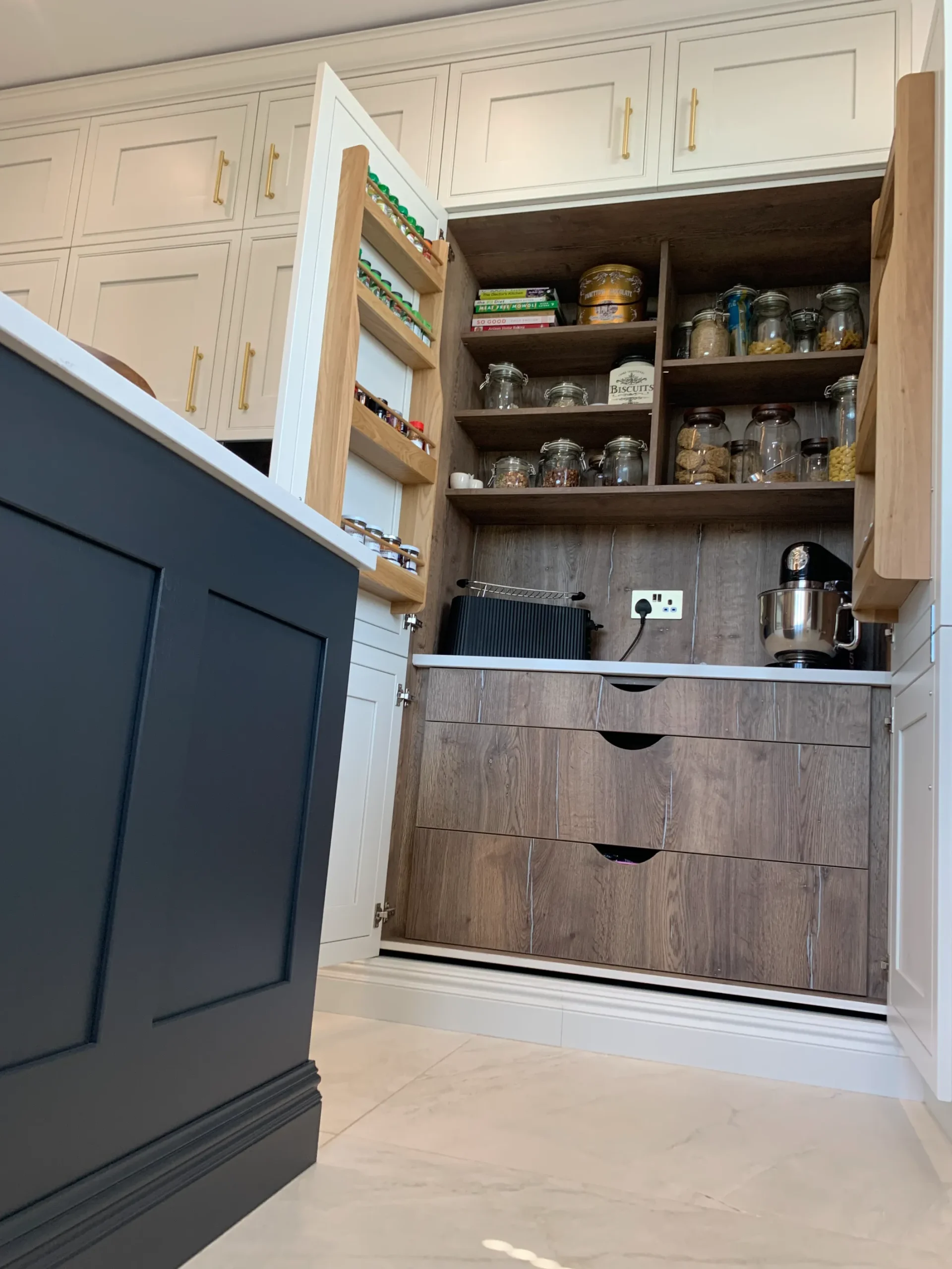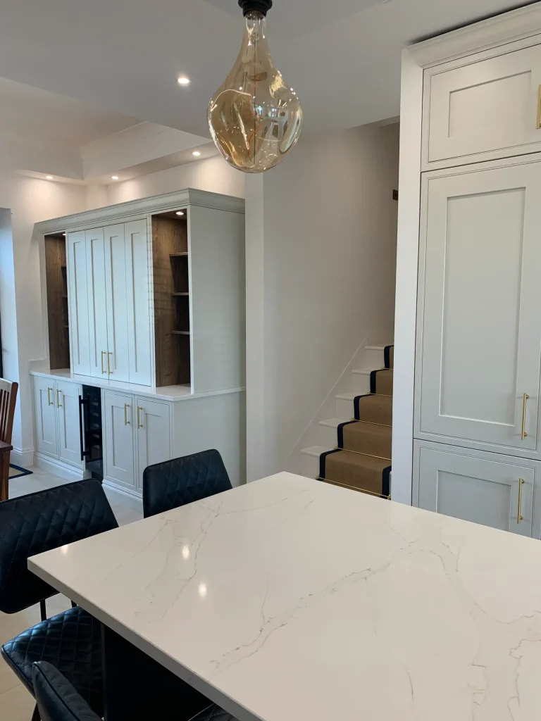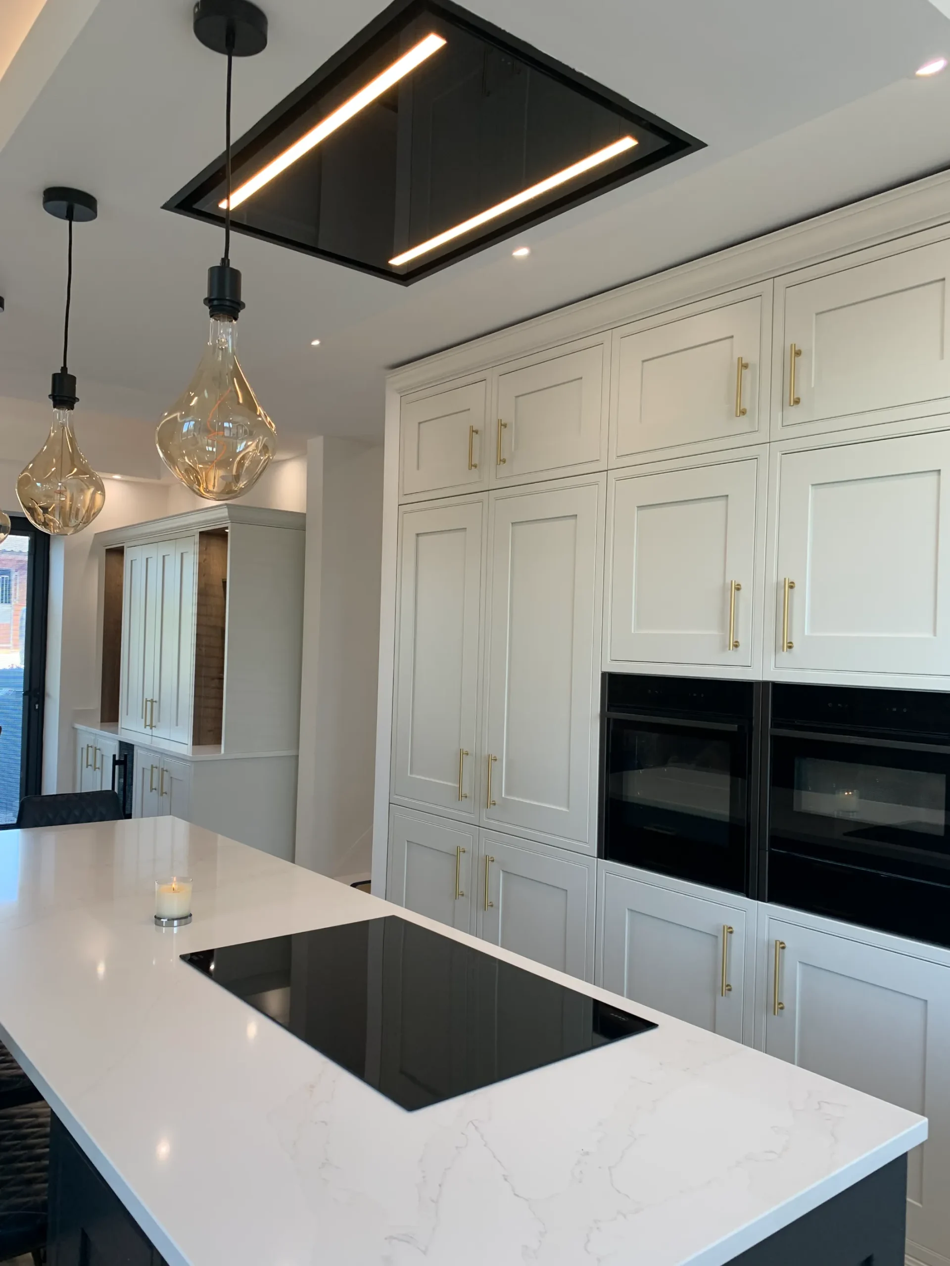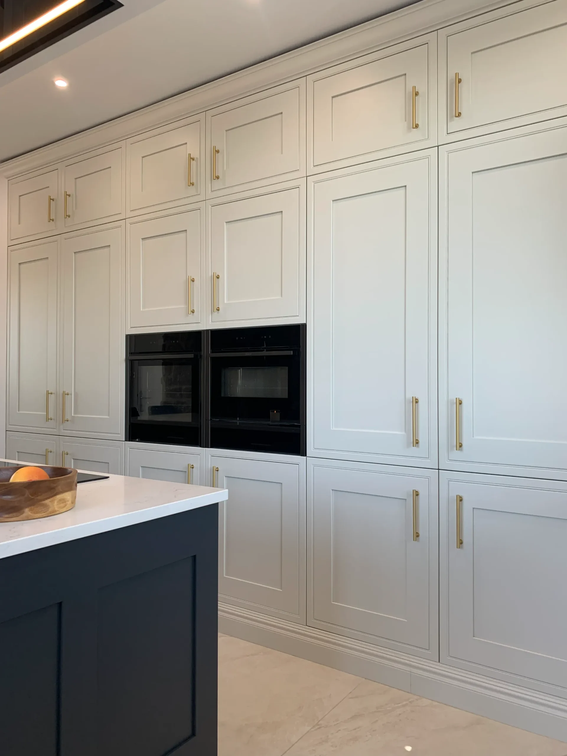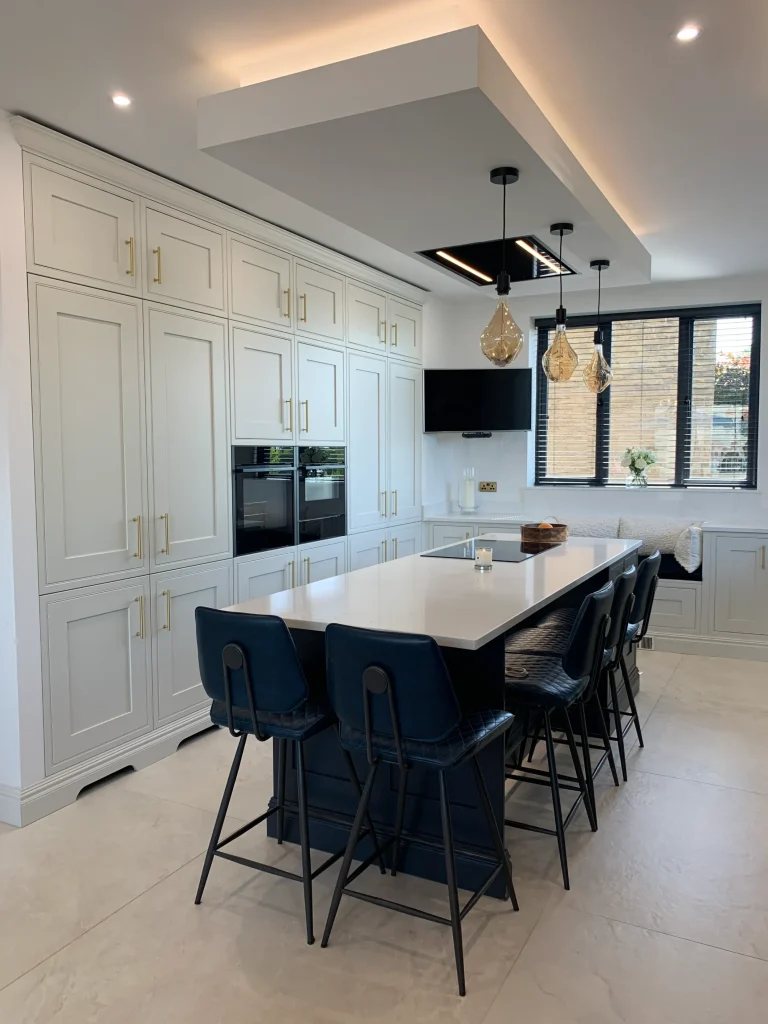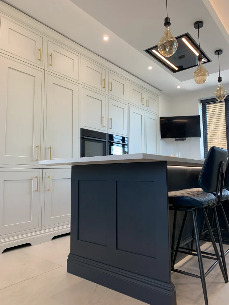 Step into a space where traditional elegance meets bold, contemporary design. This bespoke, solid-painted in-frame kitchen is defined by its meticulous attention to detail and grand proportions. At its heart sits a striking kitchen island, finished in a deep, sophisticated blue-black hue that anchors the room and provides a social hub with integrated seating and a high-performance Neff induction hob.