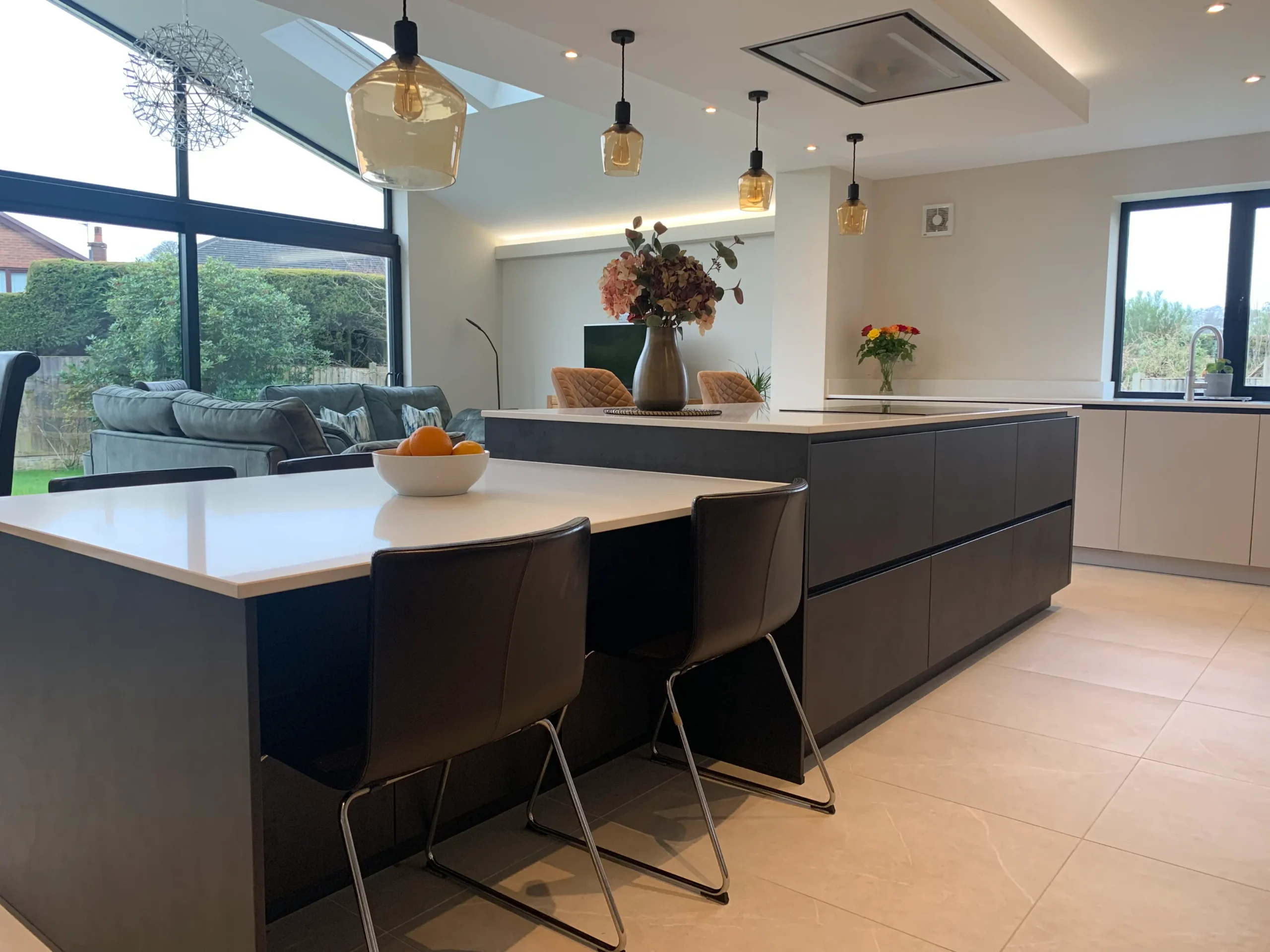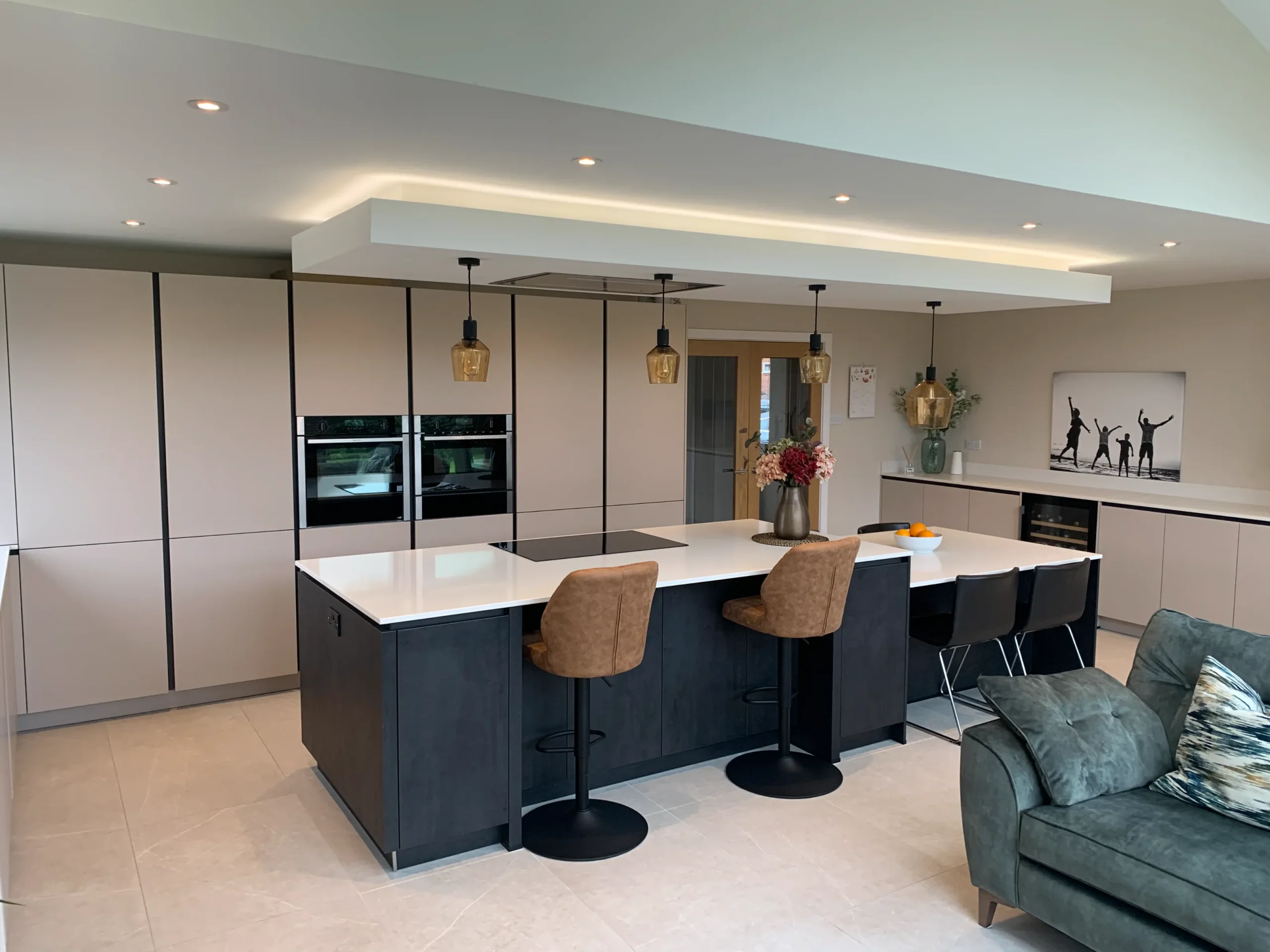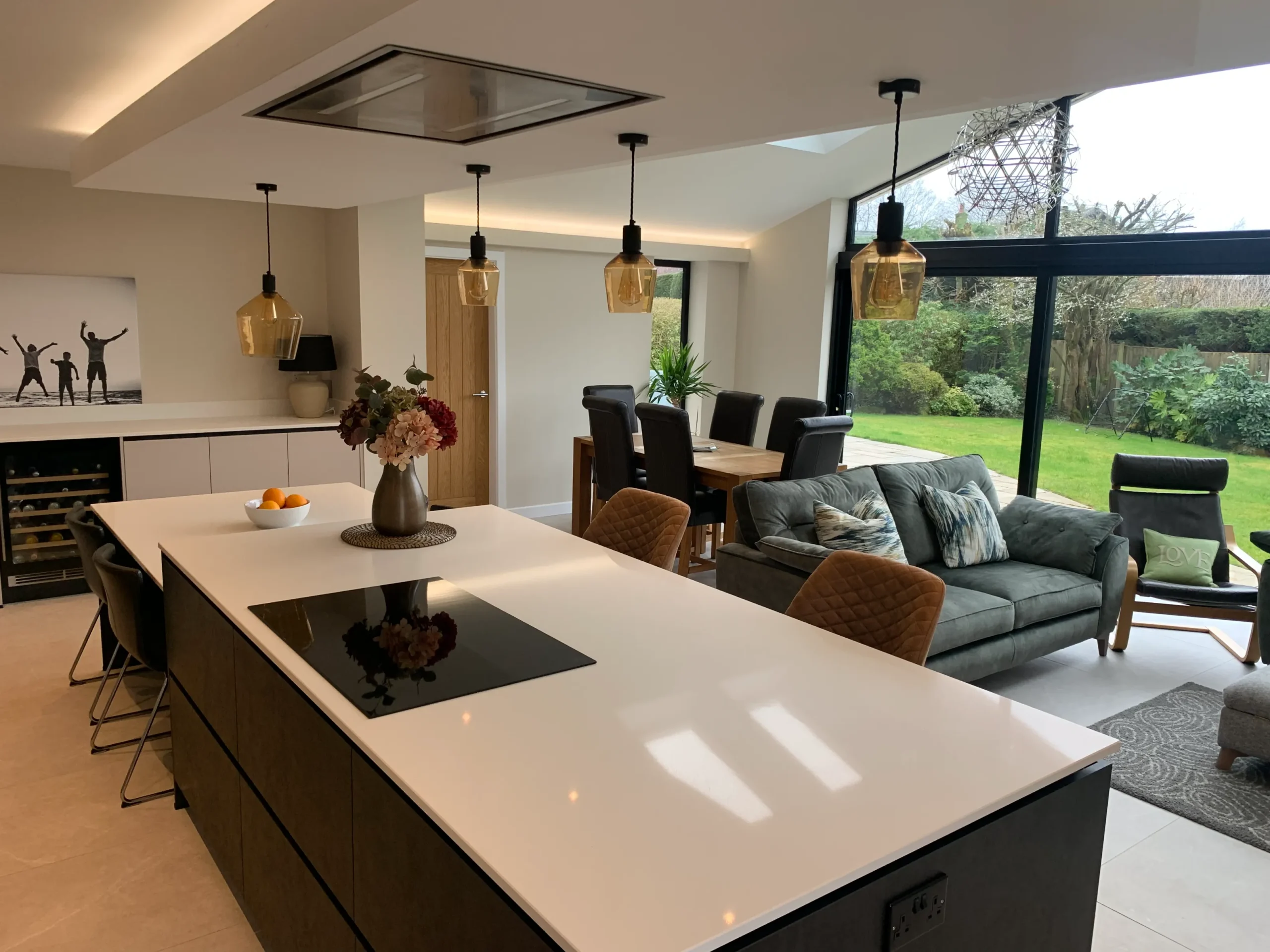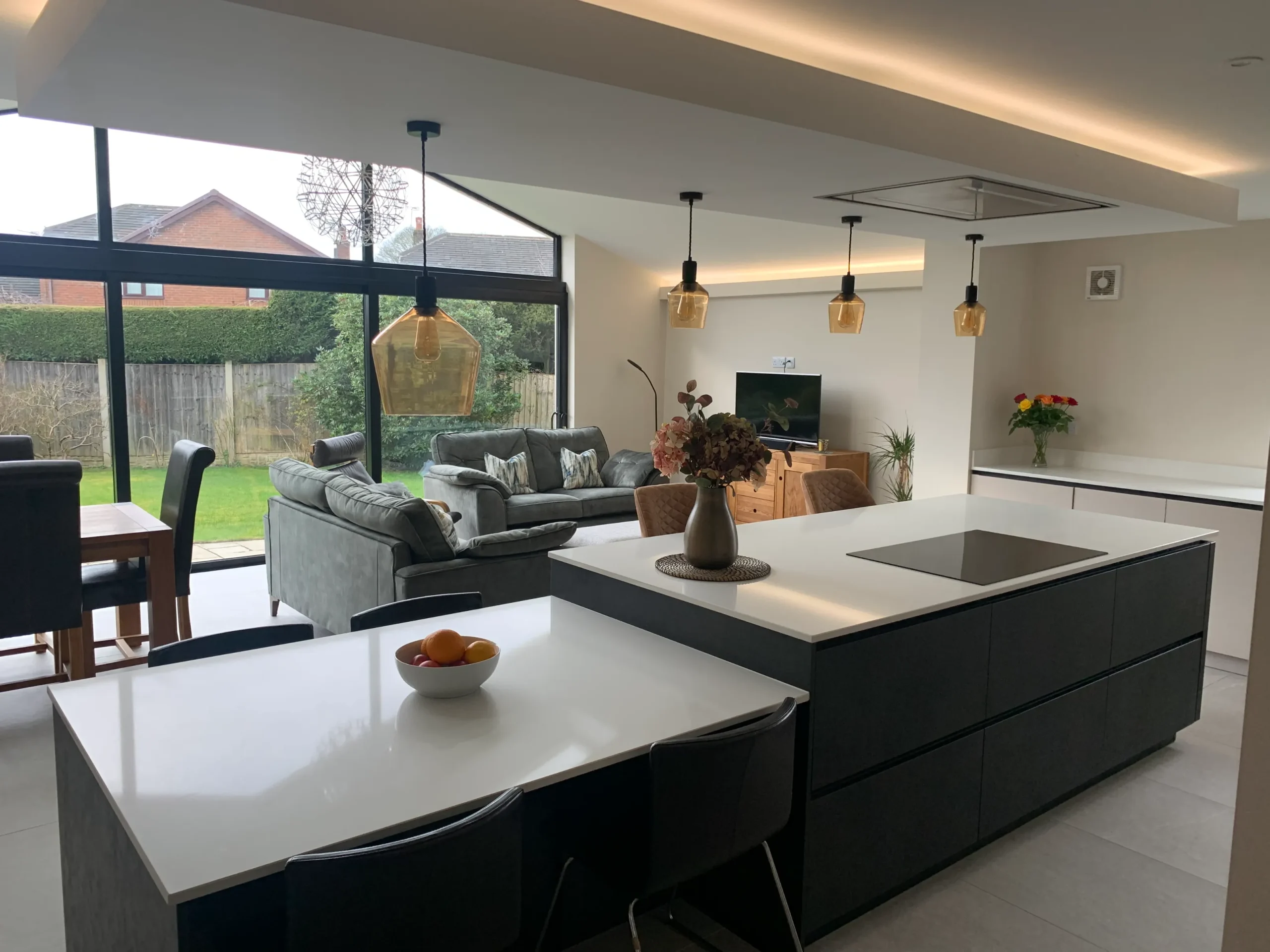 Perfectly set up for daily life, the island features a Neff induction hob situated beneath a custom-built bulkhead, which neatly houses a ceiling-mounted extractor and integrated feature lighting. This space is a dream for busy families and entertainers alike, boasting a full suite of modern Neff appliances and the effortless convenience of a Quooker instant boiling hot water tap. More than just a place to cook, this design seamlessly integrates into the home to provide a complete, multifunctional living space.