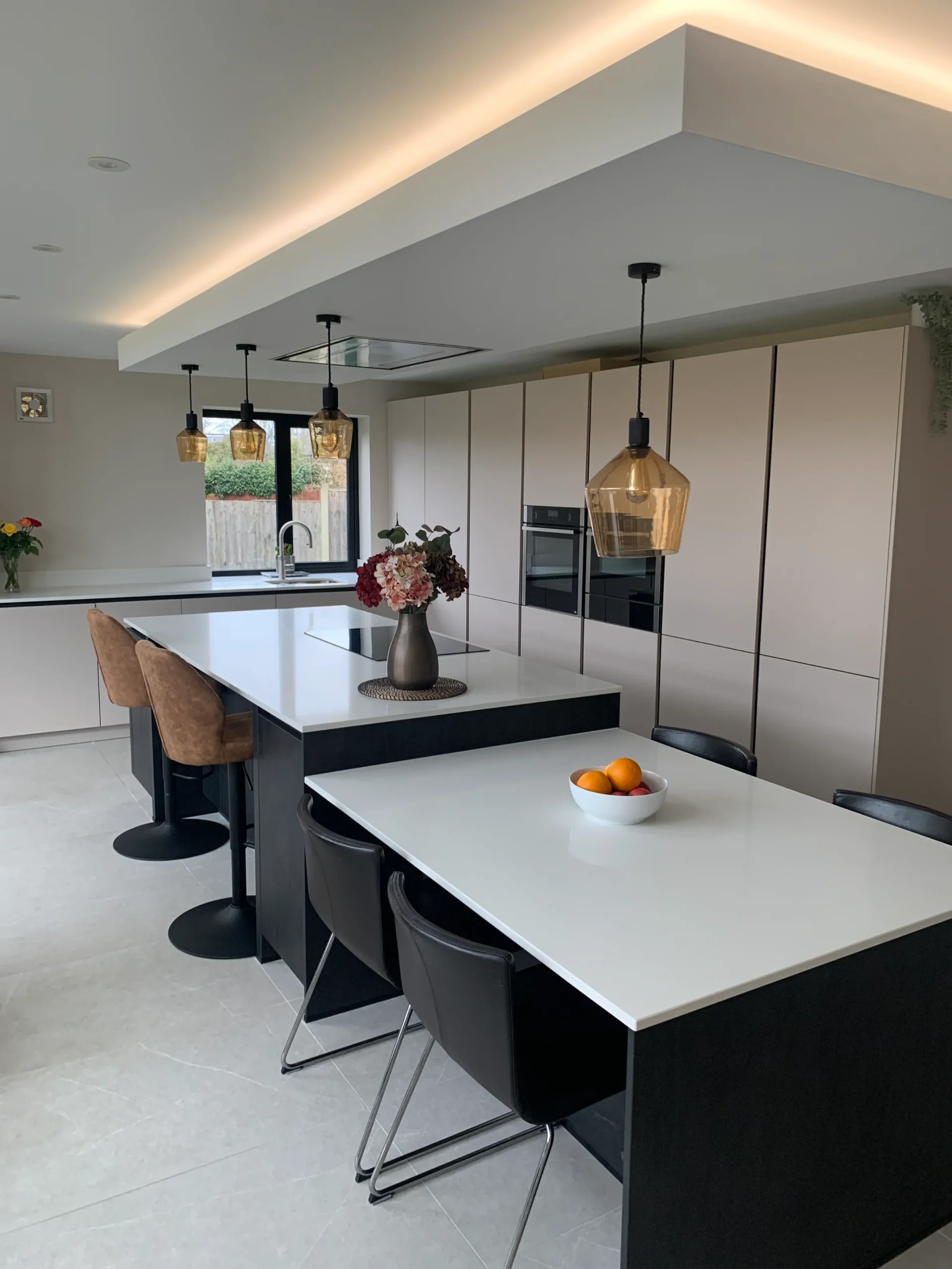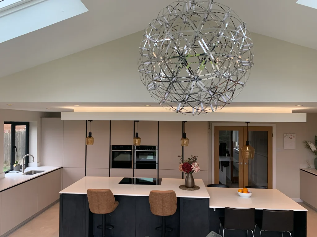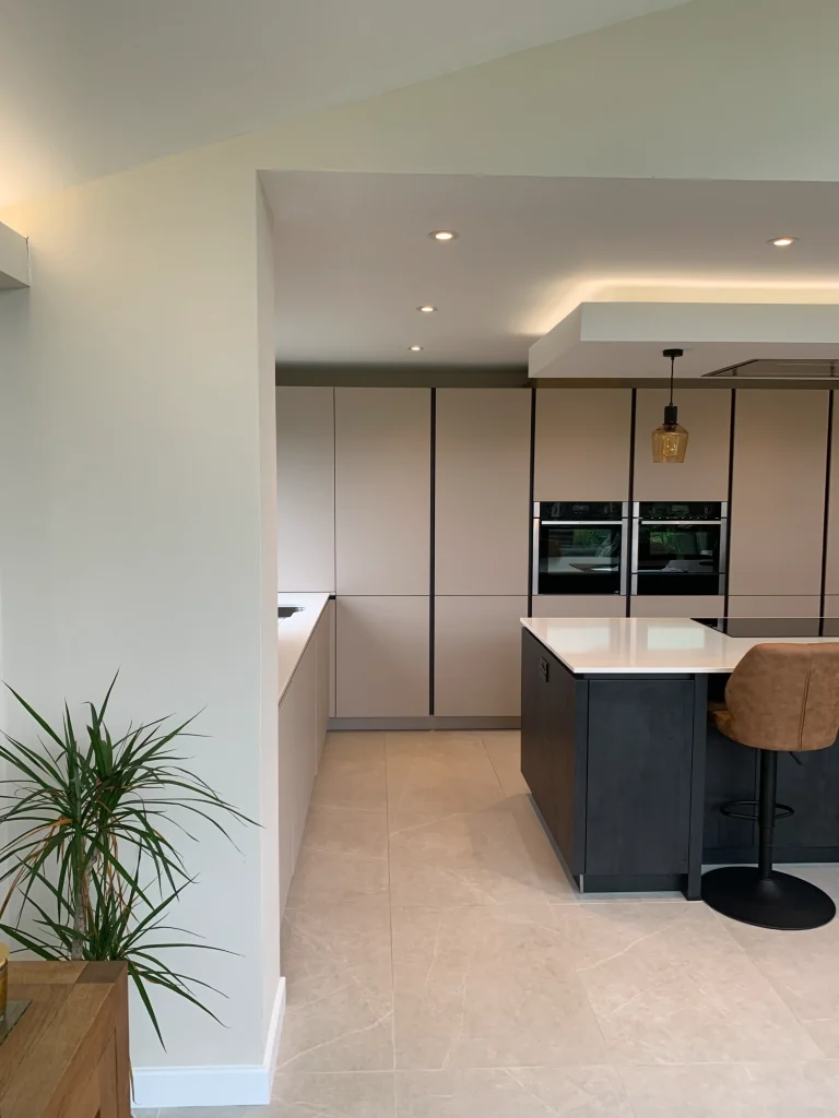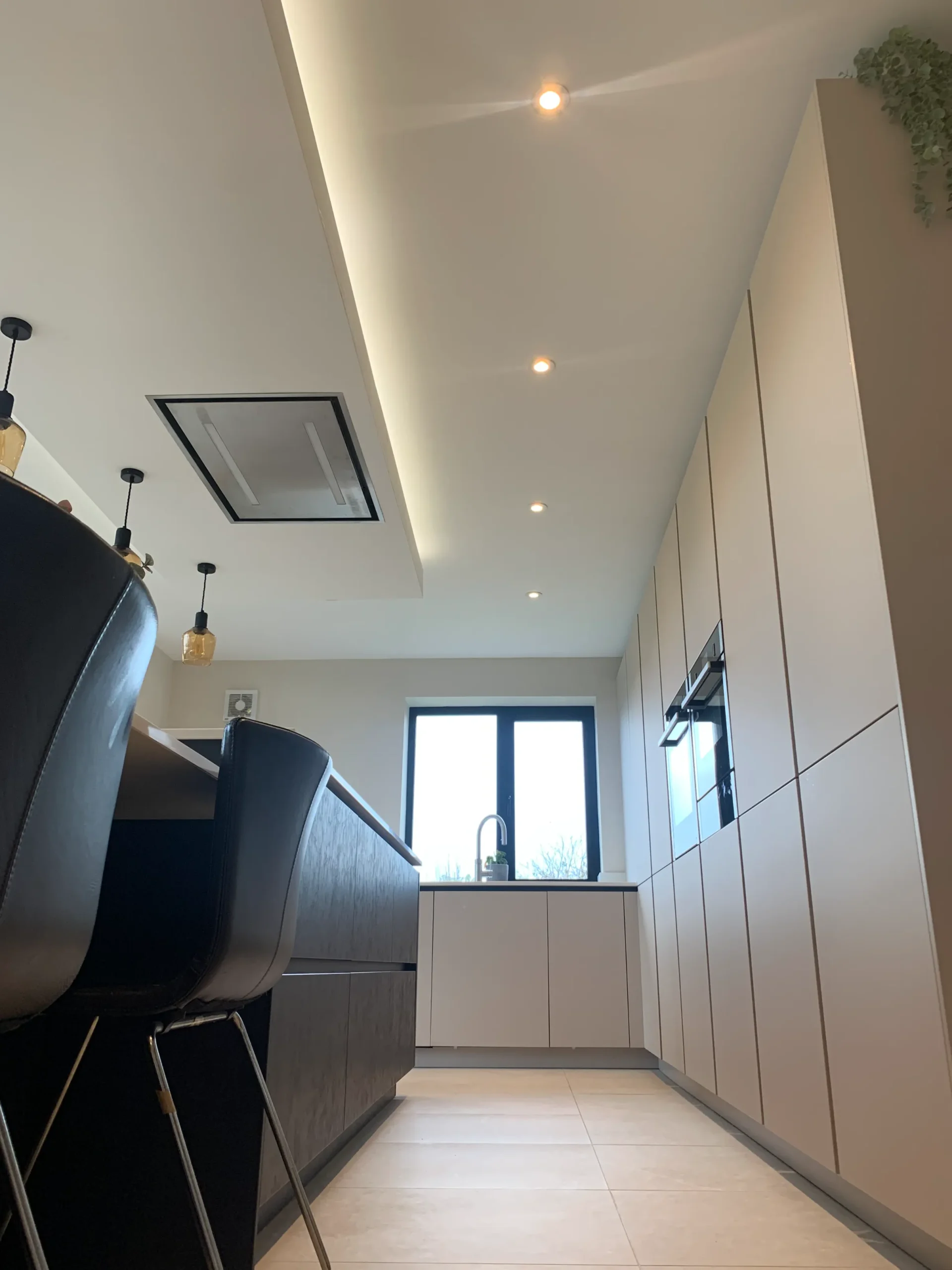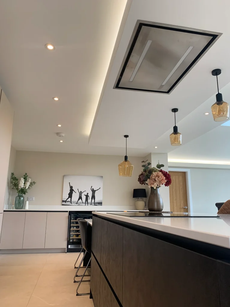 Perfectly set up for daily life, the island features a Neff induction hob situated beneath a custom-built bulkhead, which neatly houses a ceiling-mounted extractor and integrated feature lighting. This space is a dream for busy families and entertainers alike, boasting a full suite of modern Neff appliances and the effortless convenience of a Quooker instant boiling hot water tap. More than just a place to cook, this design seamlessly integrates into the home to provide a complete, multifunctional living space.