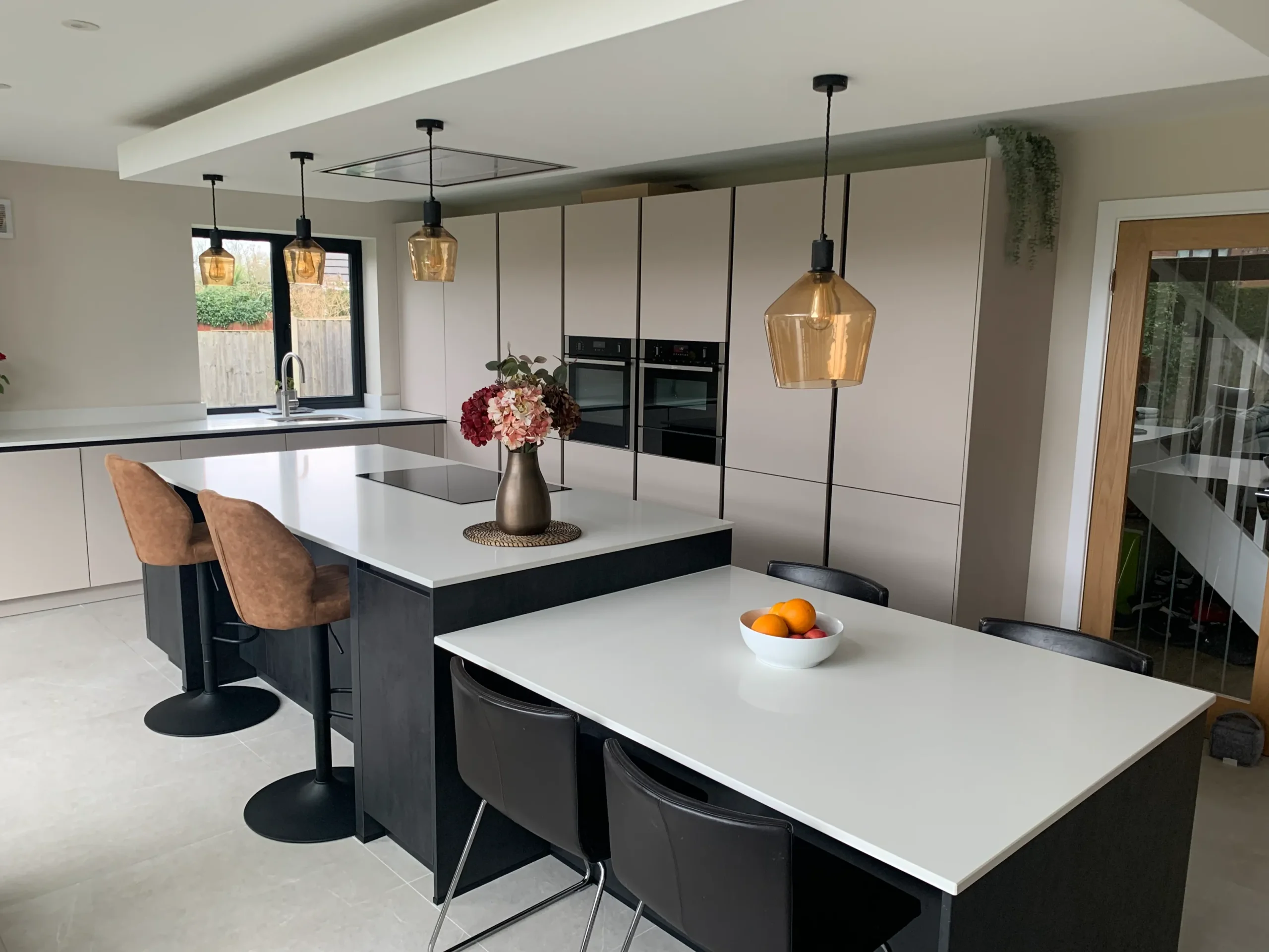 This German-made Häcker kitchen is a master-class in modern living, blending warm tones with sophisticated textures to create a truly inviting atmosphere. The centre-piece is a tactile island in dark putty, thoughtfully designed to be the ultimate social hub with both a dedicated dining area and casual bar stool seating.