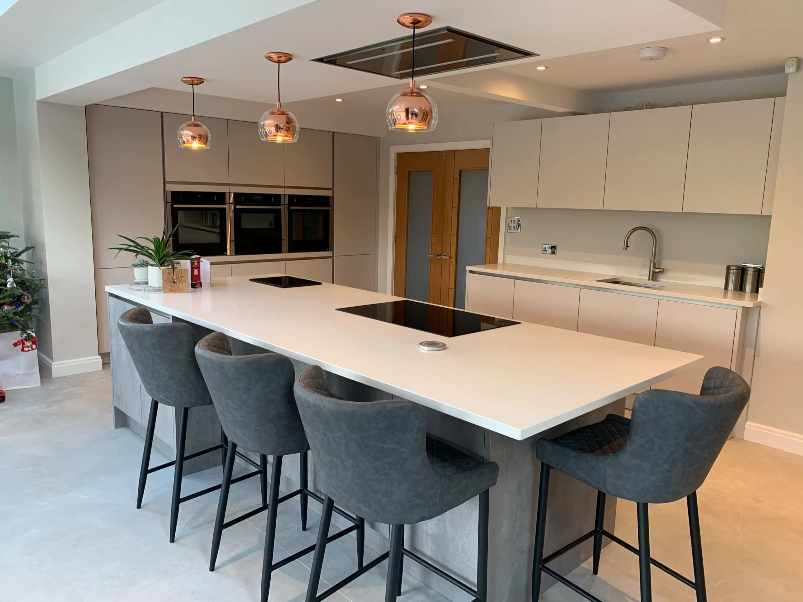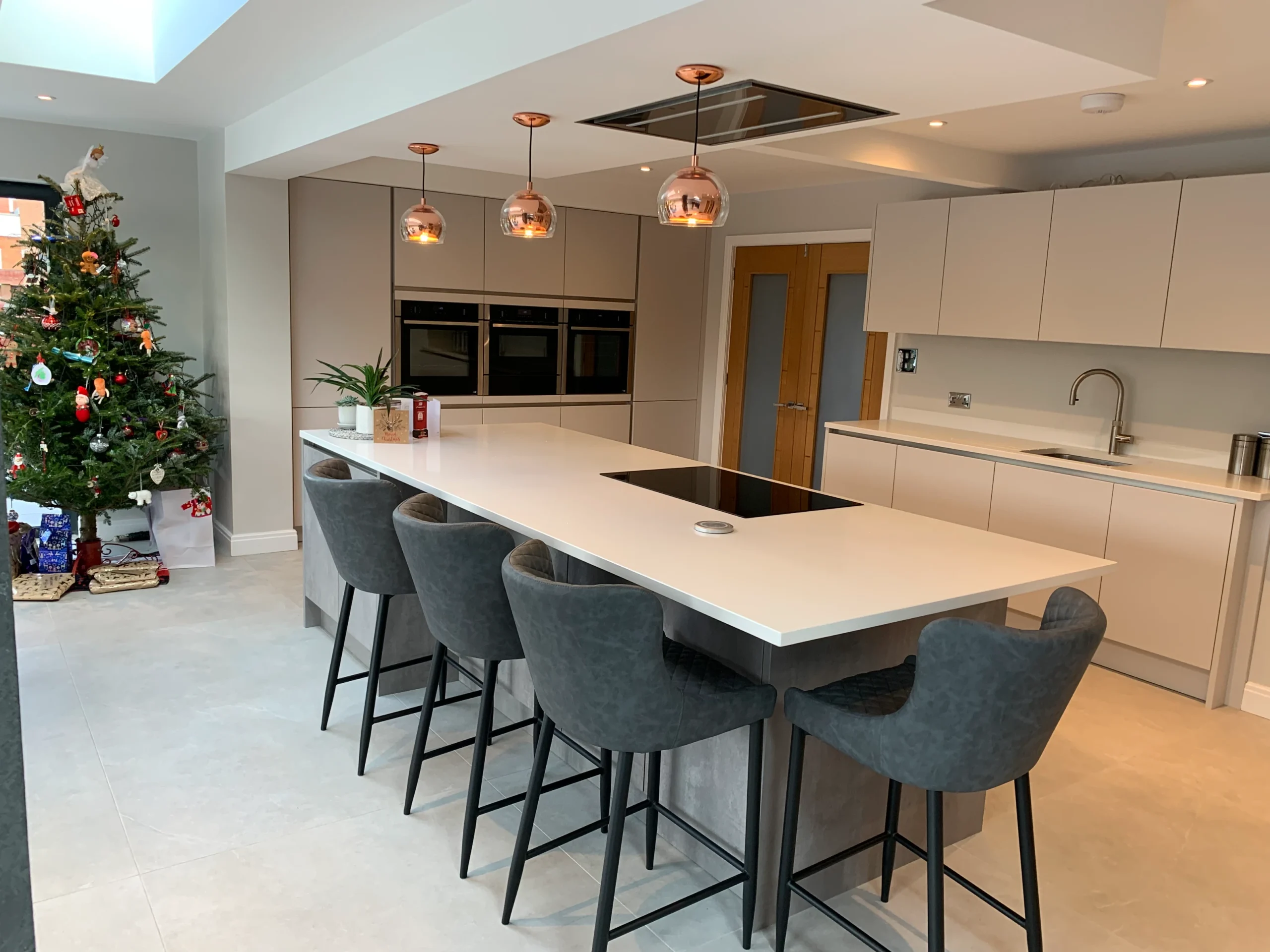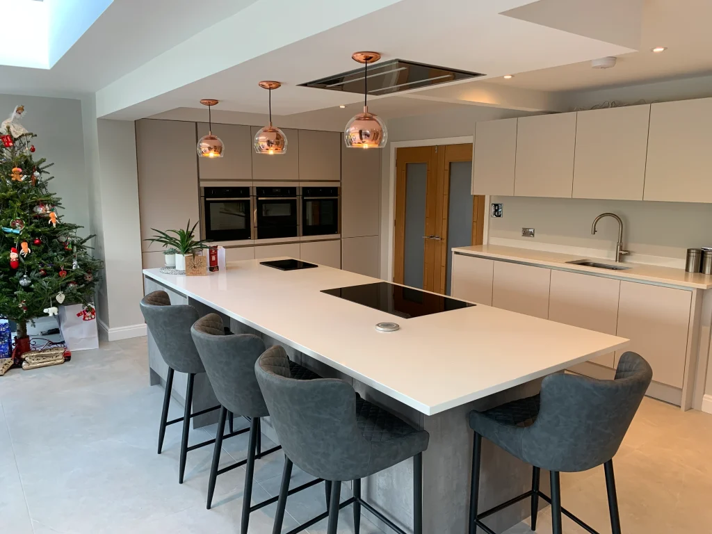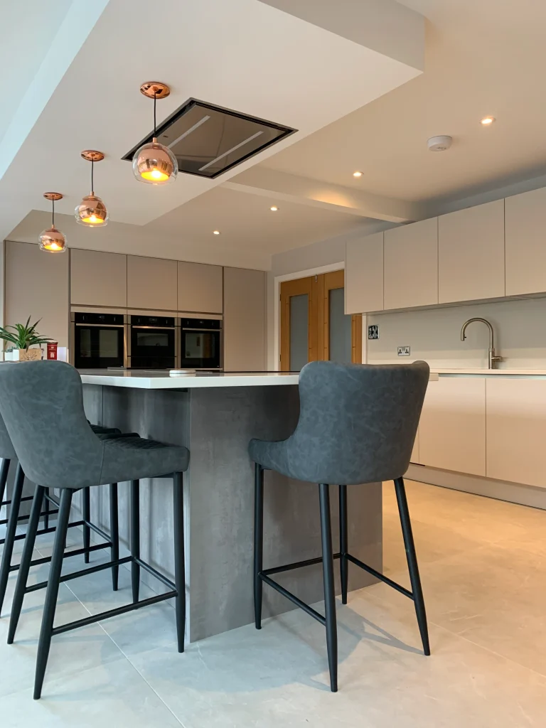 The space is equipped with premium Neff appliances to provide all the practical essentials, while exclusive quartz work surfaces ensure a beautiful finish that will truly stand the test of time. To keep up with the demands of a busy family life, the addition of an instant boiling hot water tap provides effortless convenience at the touch of a button. Overall, this design achieves a perfect synergy between aesthetic beauty and everyday functionality, creating a complete living space tailored for the modern family.