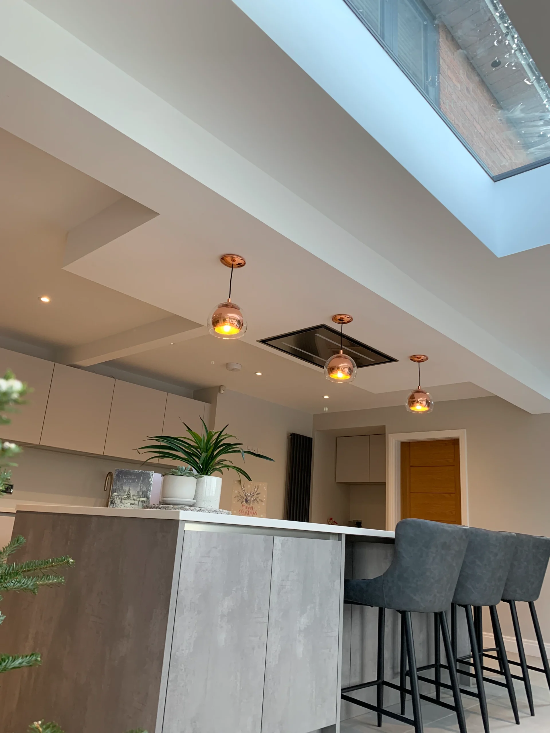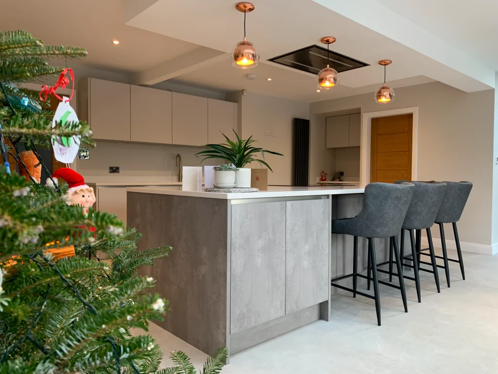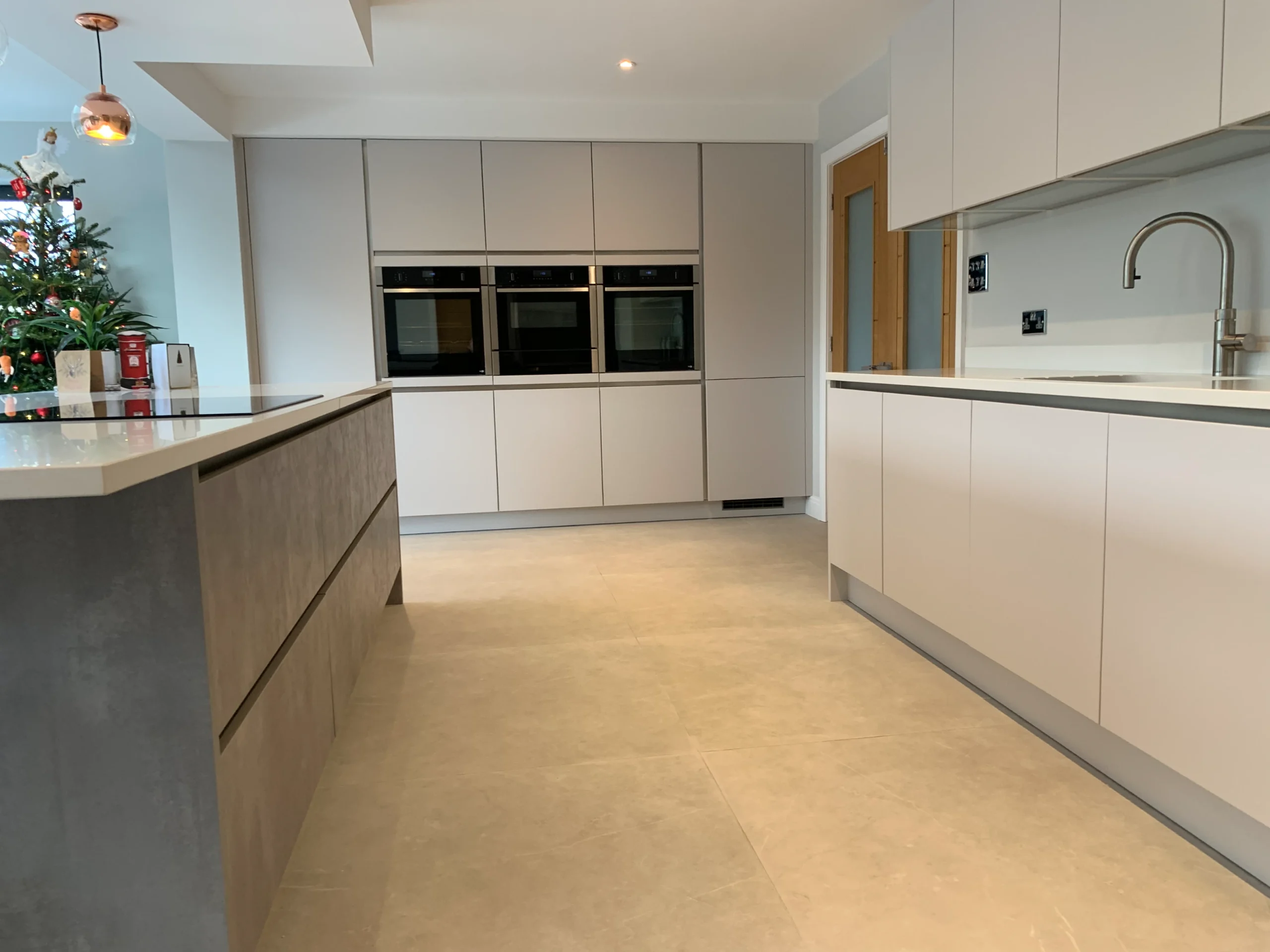 The space is equipped with premium Neff appliances to provide all the practical essentials, while exclusive quartz work surfaces ensure a beautiful finish that will truly stand the test of time. To keep up with the demands of a busy family life, the addition of an instant boiling hot water tap provides effortless convenience at the touch of a button. Overall, this design achieves a perfect synergy between aesthetic beauty and everyday functionality, creating a complete living space tailored for the modern family.