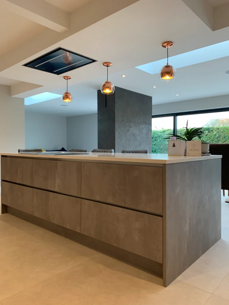 This Häcker German kitchen is an excellent design in contemporary elegance, pairing neutral warm tones with a large, statement island in a tactile light grey putty concrete finish. This combination creates a sophisticated, modern look that remains welcoming and bright.