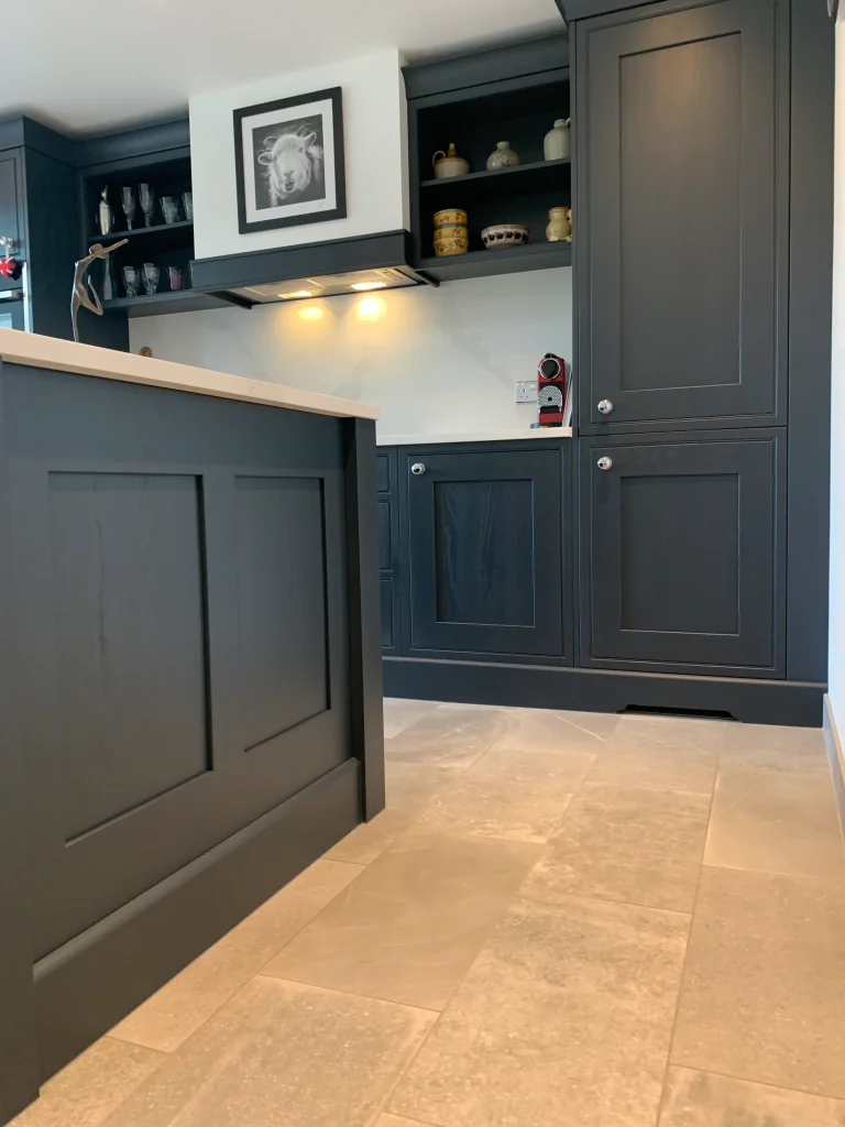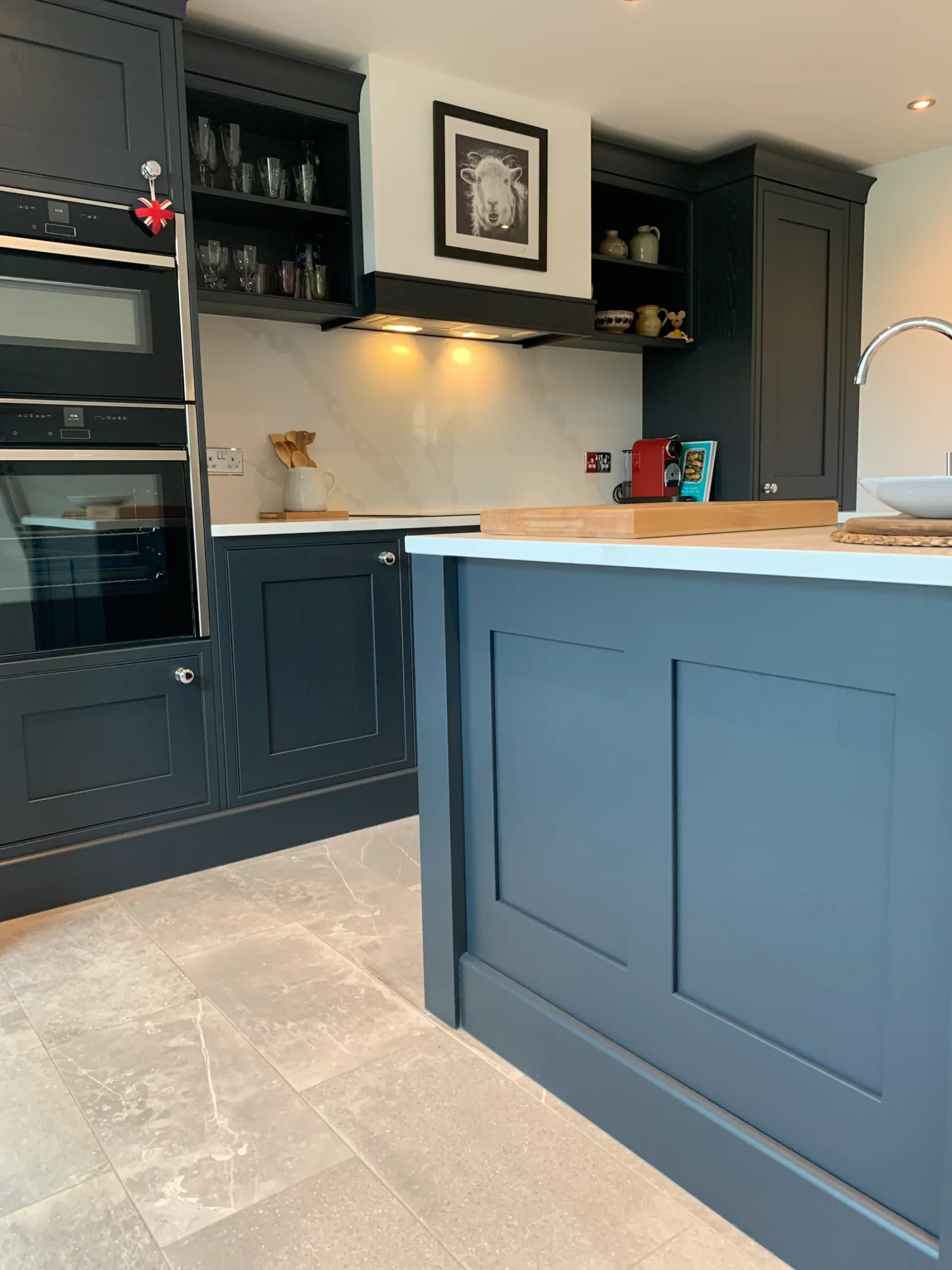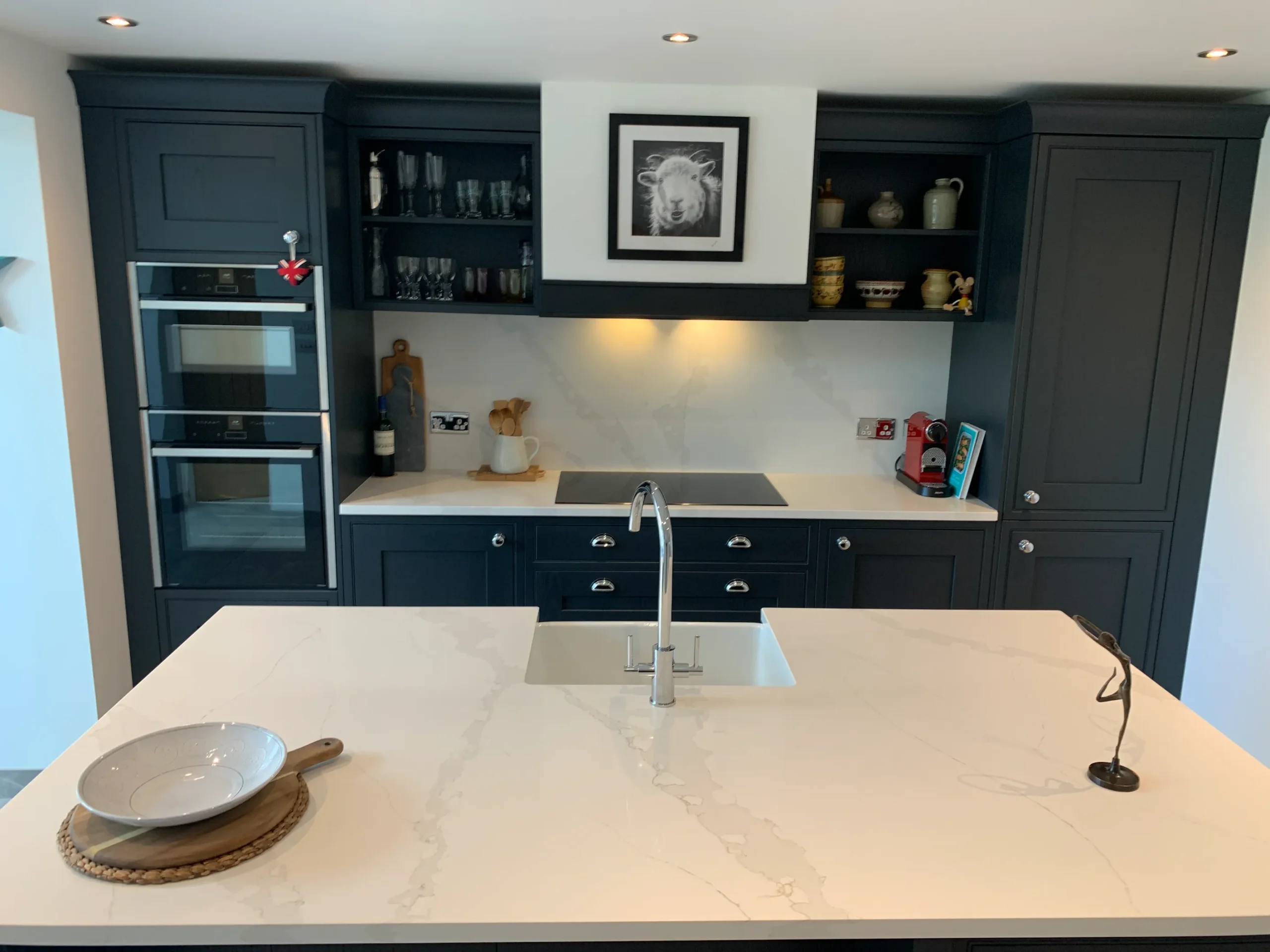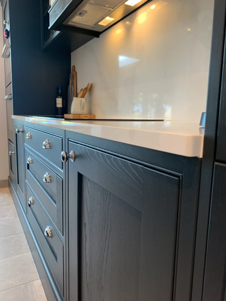 Deep, dramatic, and effortlessly stylish, this in-frame Shaker kitchen proves that traditional craftsmanship has a bold modern soul. Painted in a striking blue-black hue, the cabinetry provides a sophisticated anchor for the room, perfectly balanced by the luminous contrast of fine quartz work surfaces.
