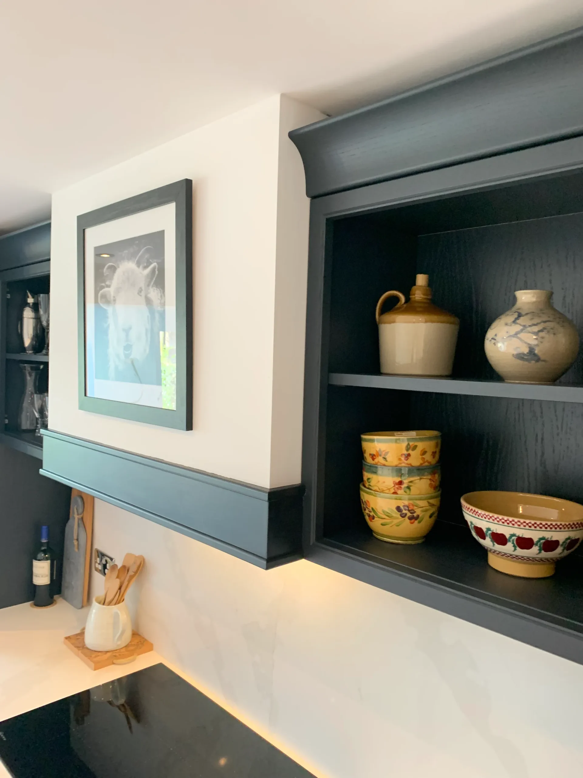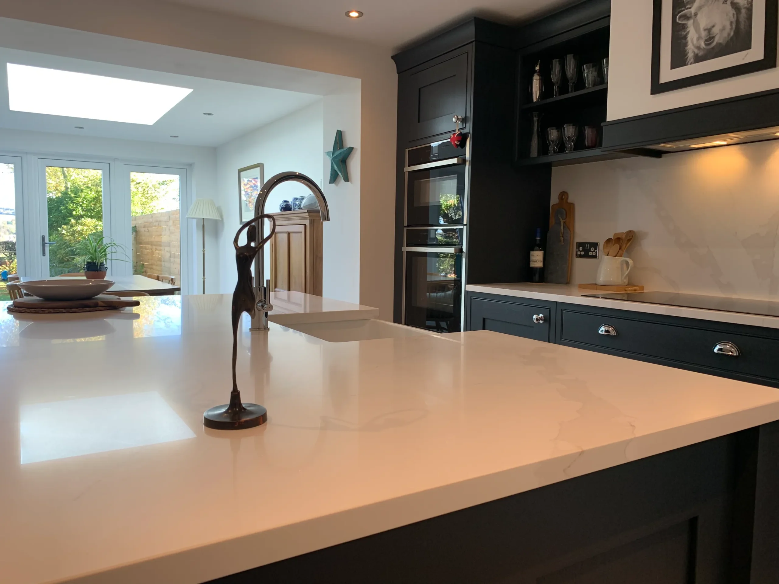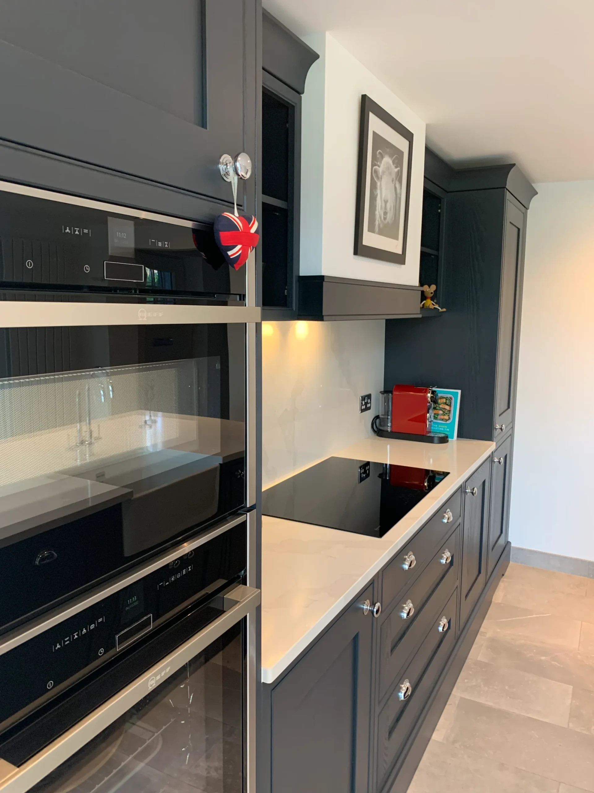Deep, dramatic, and effortlessly stylish, this in-frame Shaker kitchen proves that traditional craftsmanship has a bold modern soul. Painted in a striking blue-black hue, the cabinetry provides a sophisticated anchor for the room, perfectly balanced by the luminous contrast of fine quartz work surfaces.