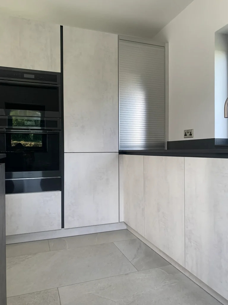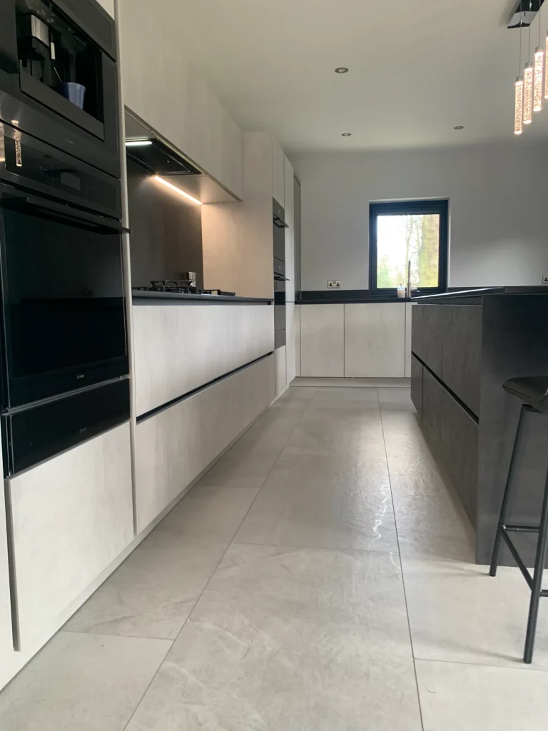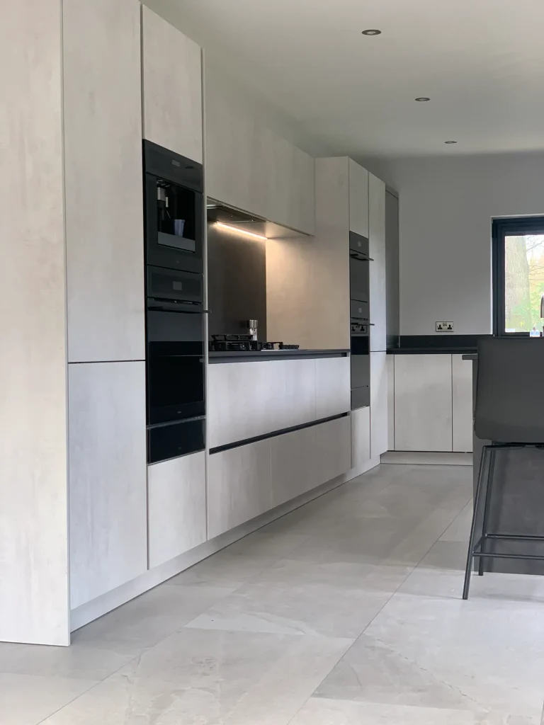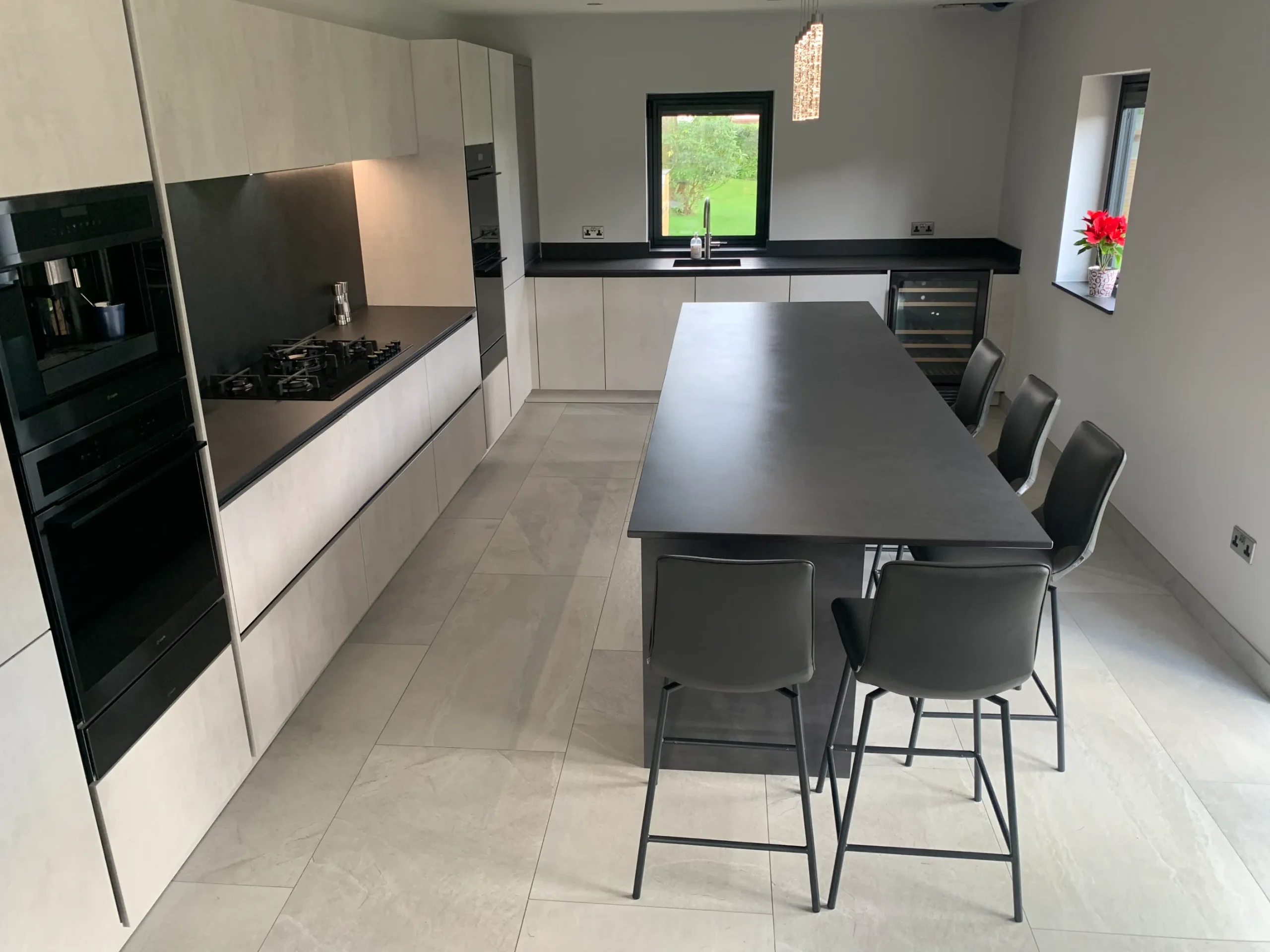 The design is packed with high-end features, including a suite of black glass appliances with integrated ovens and a built-in coffee machine for a seamless, flush finish. A clever roller-shutter station allows you to tuck away your toaster and countertop essentials, keeping the workspace clutter-free and maintaining the kitchen’s minimalist lines. At the heart of the home, the large island offers comfortable seating and a perfectly placed wine cooler, making it the ideal spot for both entertaining guests and enjoying everyday family life. With the added convenience of a Quooker instant boiling hot water tap, this kitchen represents the pinnacle of truly modern design.