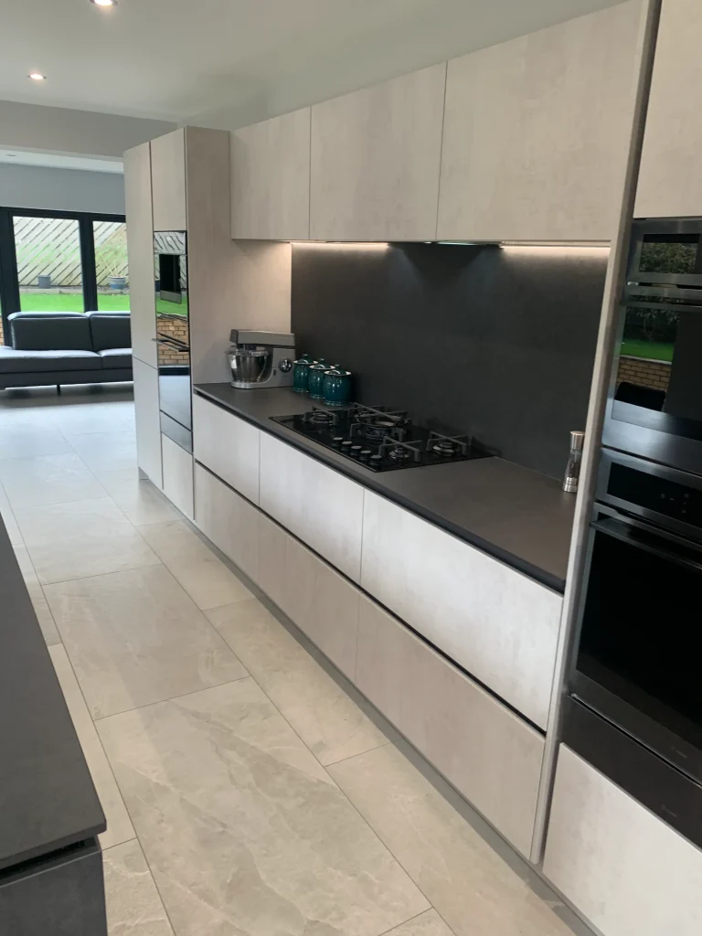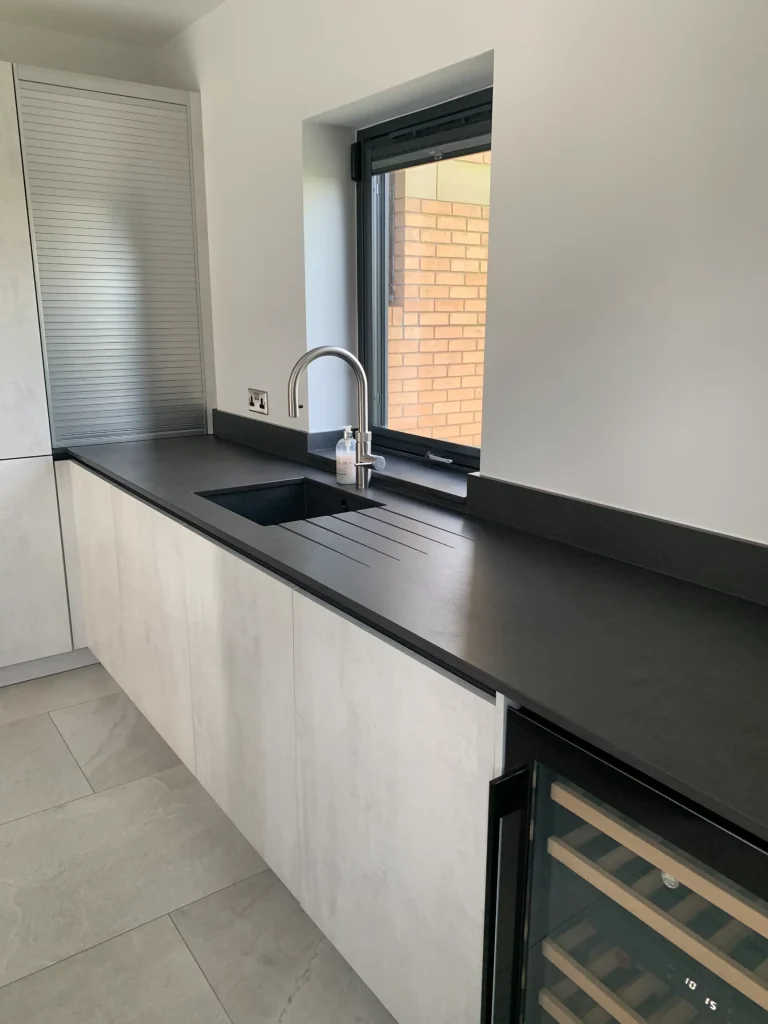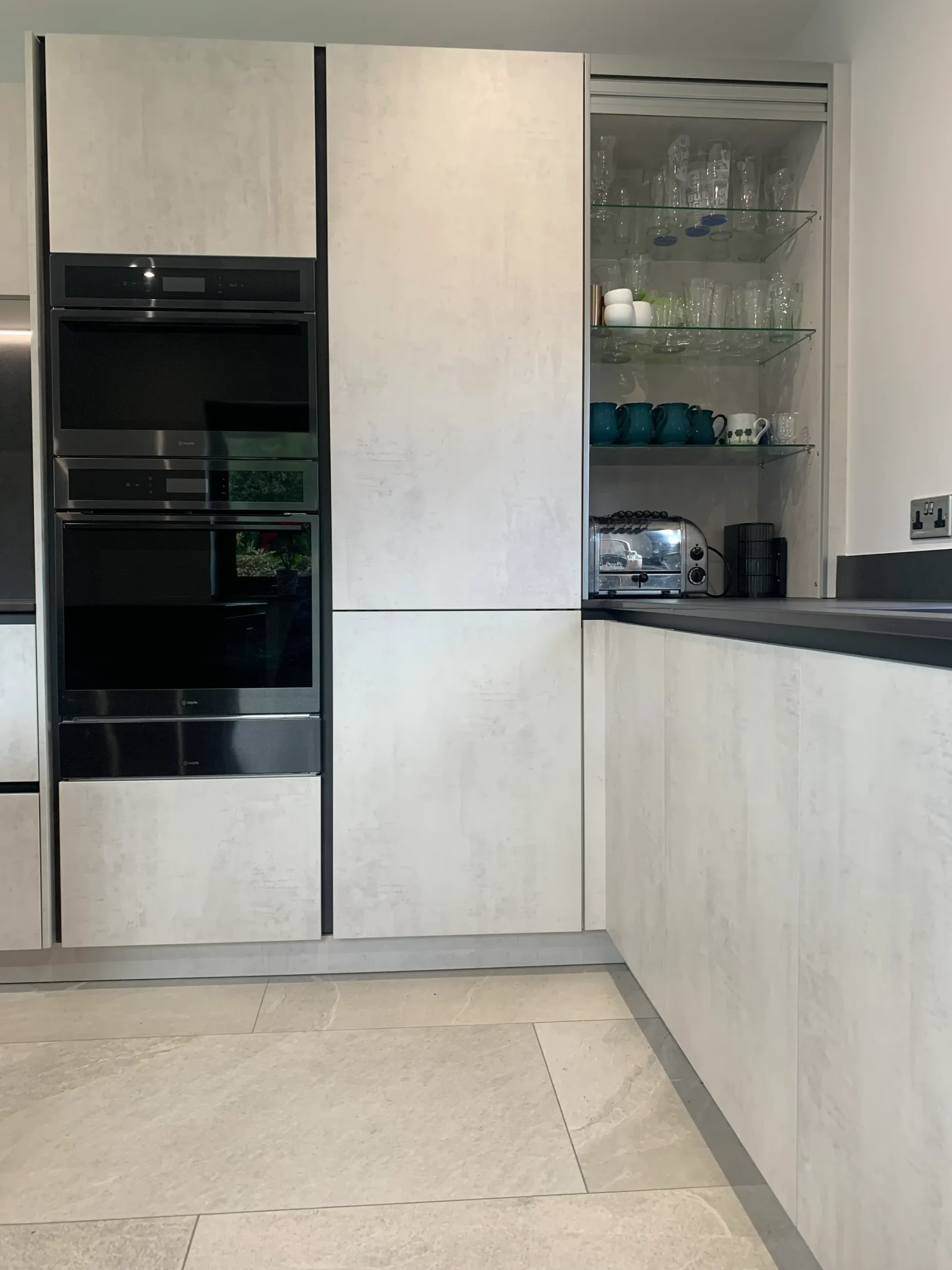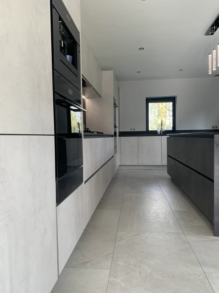 The design is packed with high-end features, including a suite of black glass appliances with integrated ovens and a built-in coffee machine for a seamless, flush finish. A clever roller-shutter station allows you to tuck away your toaster and countertop essentials, keeping the workspace clutter-free and maintaining the kitchen’s minimalist lines. At the heart of the home, the large island offers comfortable seating and a perfectly placed wine cooler, making it the ideal spot for both entertaining guests and enjoying everyday family life. With the added convenience of a Quooker instant boiling hot water tap, this kitchen represents the pinnacle of truly modern design.
