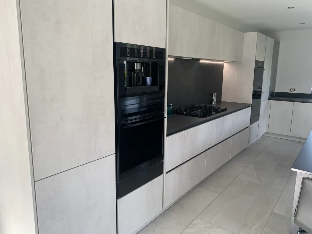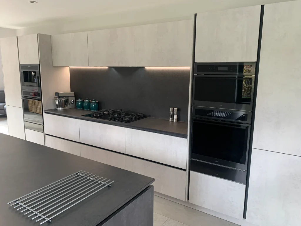 This Häcker German kitchen is a striking study in contrast, utilizing a concrete-style finish in graphite and pearl white to create a sophisticated, industrial-chic aesthetic. The look is anchored by dark Dekton work surfaces, providing a surface that is as durable as it is visually commanding.