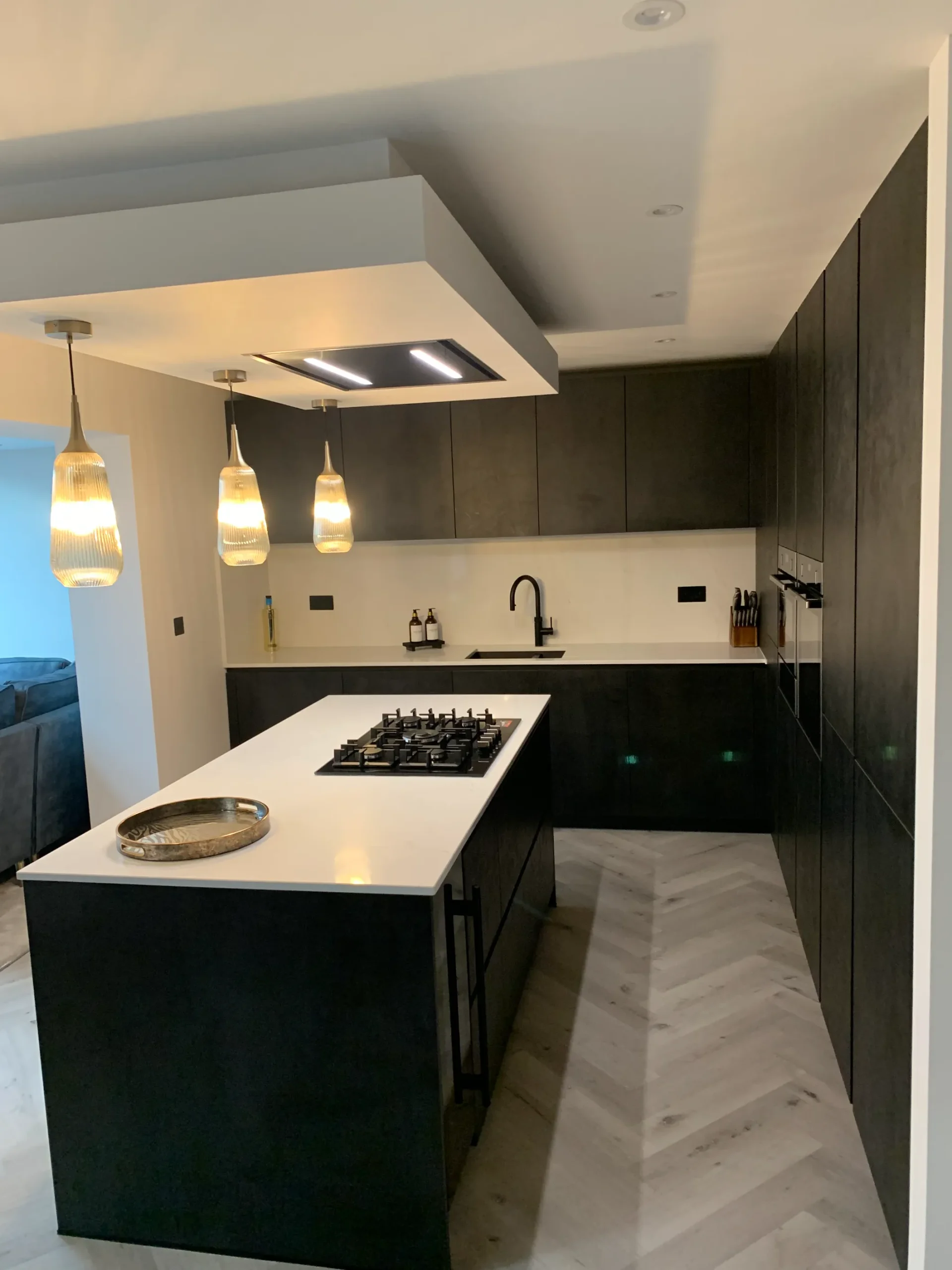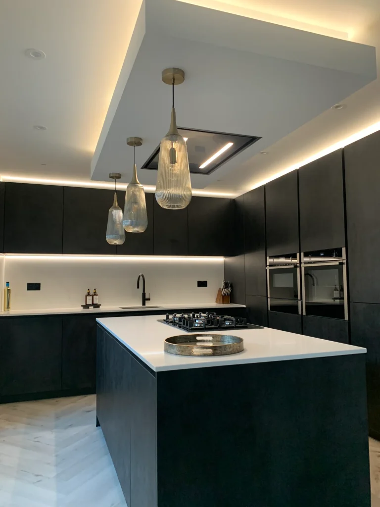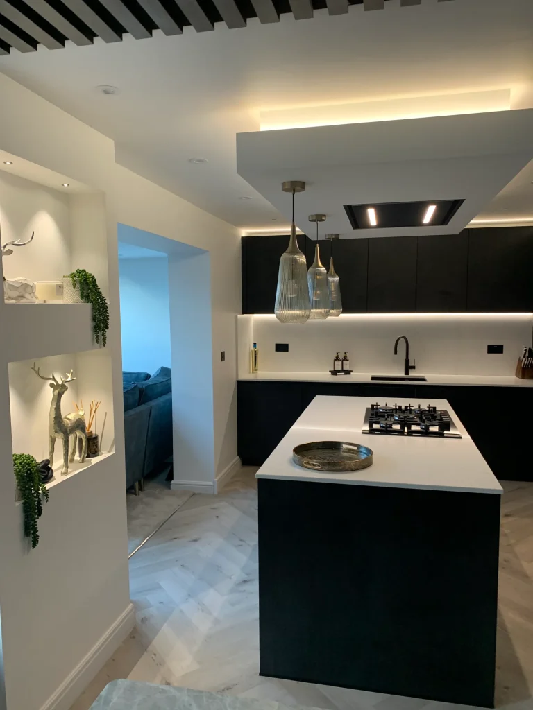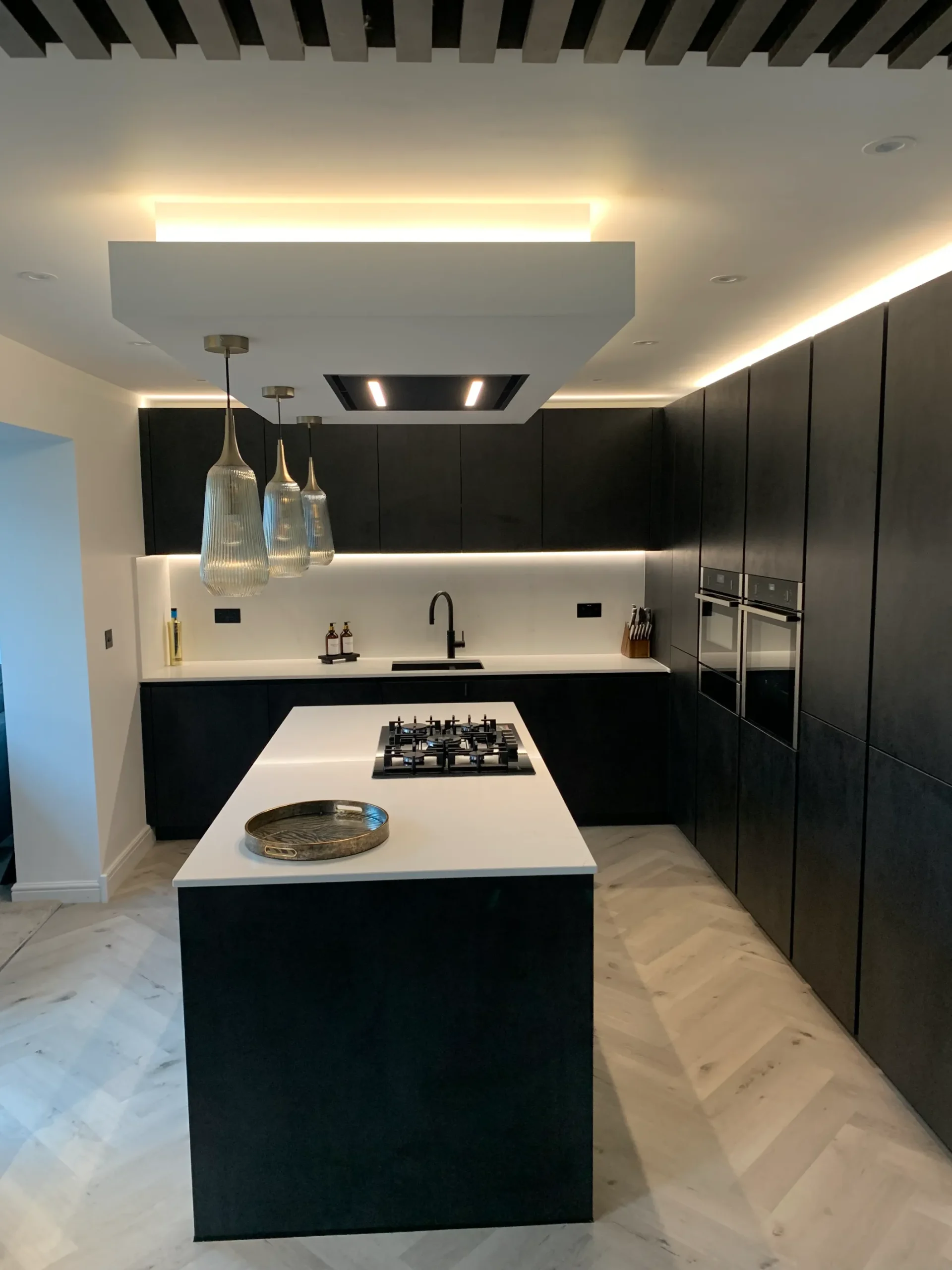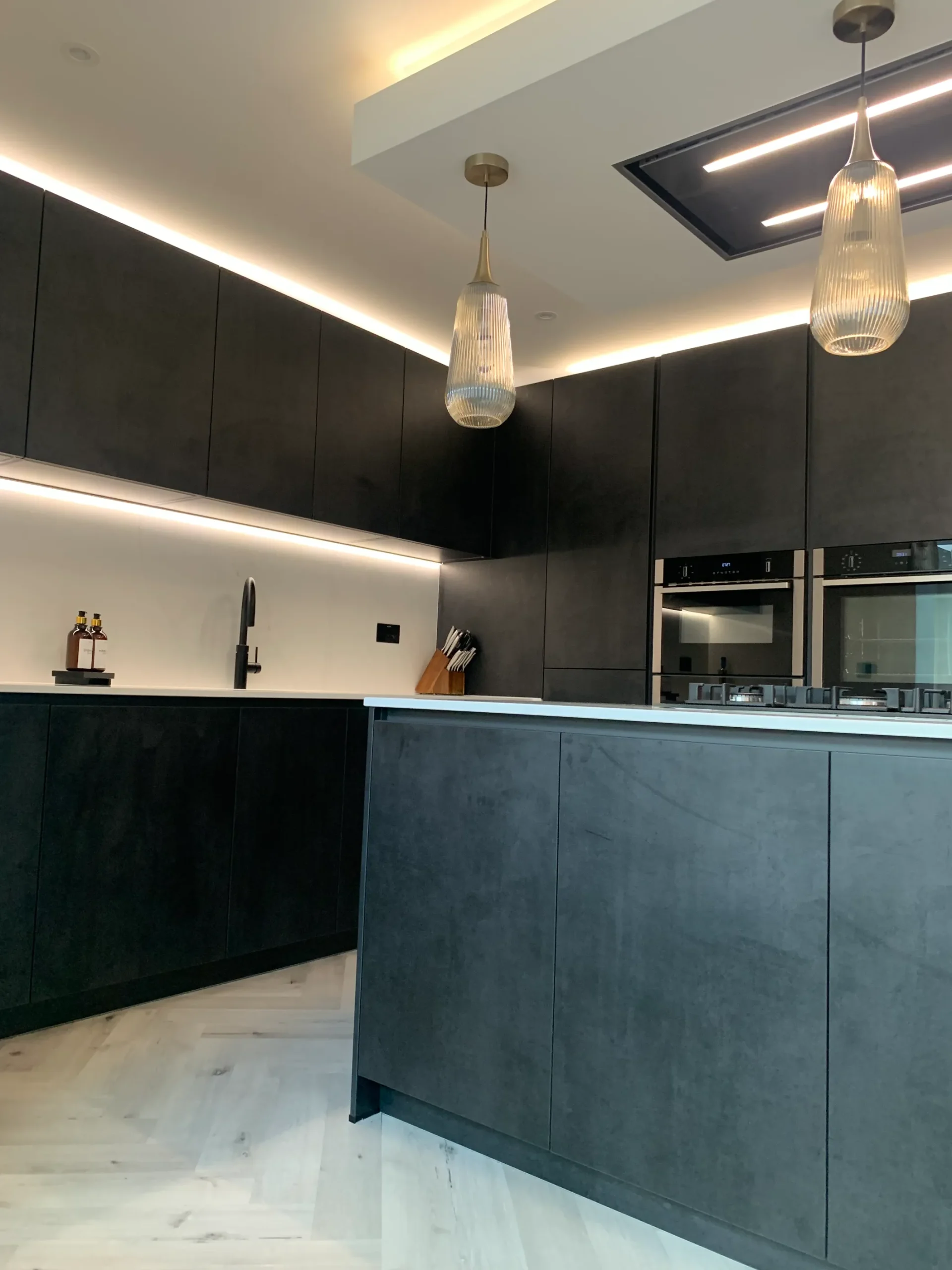 The layout is centred on an impressive island featuring a Neff gas-on-glass hob, offering a professional cooking experience within a refined aesthetic. Above, a purpose-built bulkhead houses a streamlined ceiling extractor and integrated feature lighting, casting warm metallic tones across the room to soften the industrial-inspired textures. Completed with high-end Neff appliances and the essential Quooker boiling hot water tap, this design is a true credit to the client’s vision—a simply beautiful space that feels both modern and timeless.