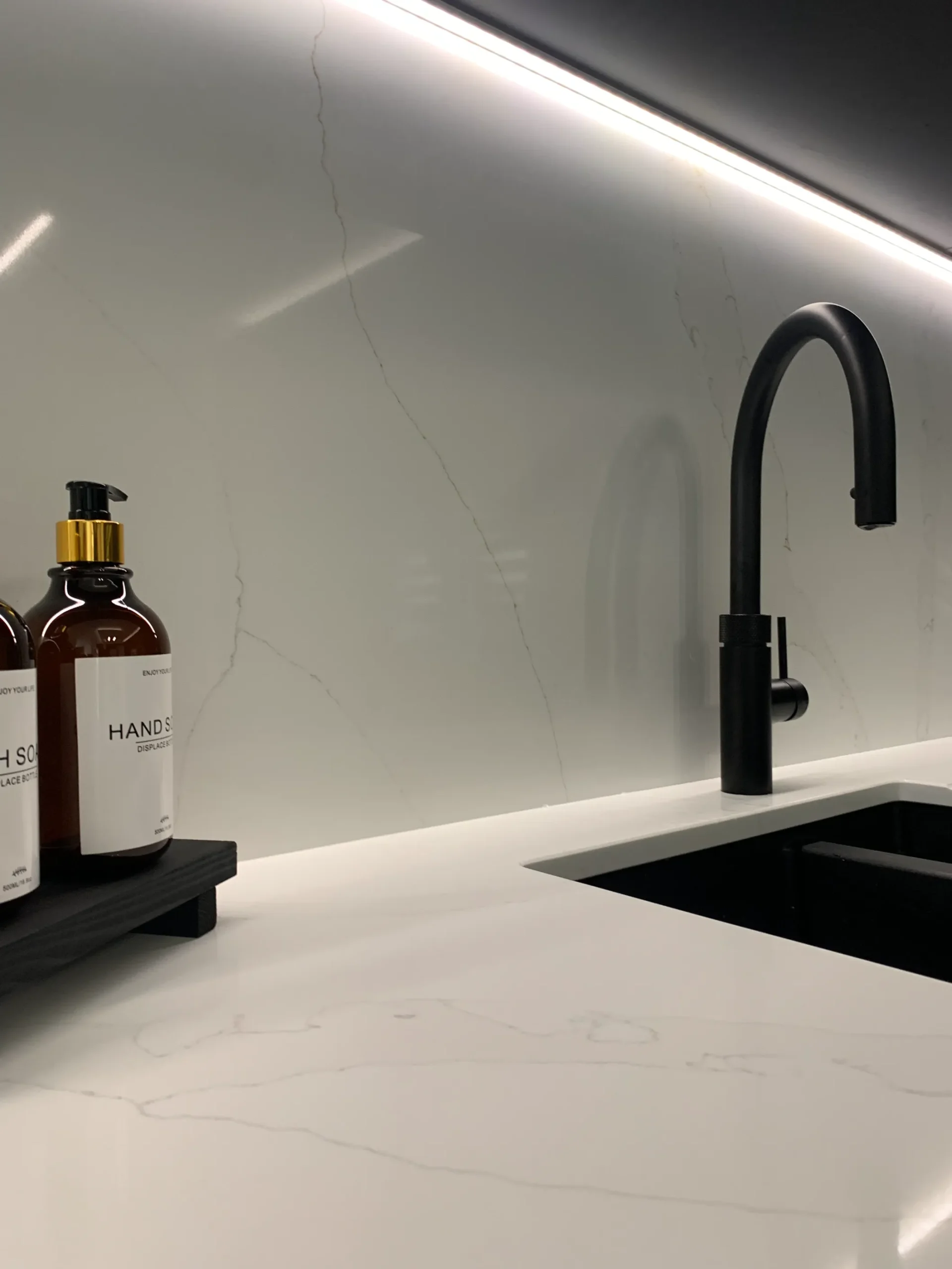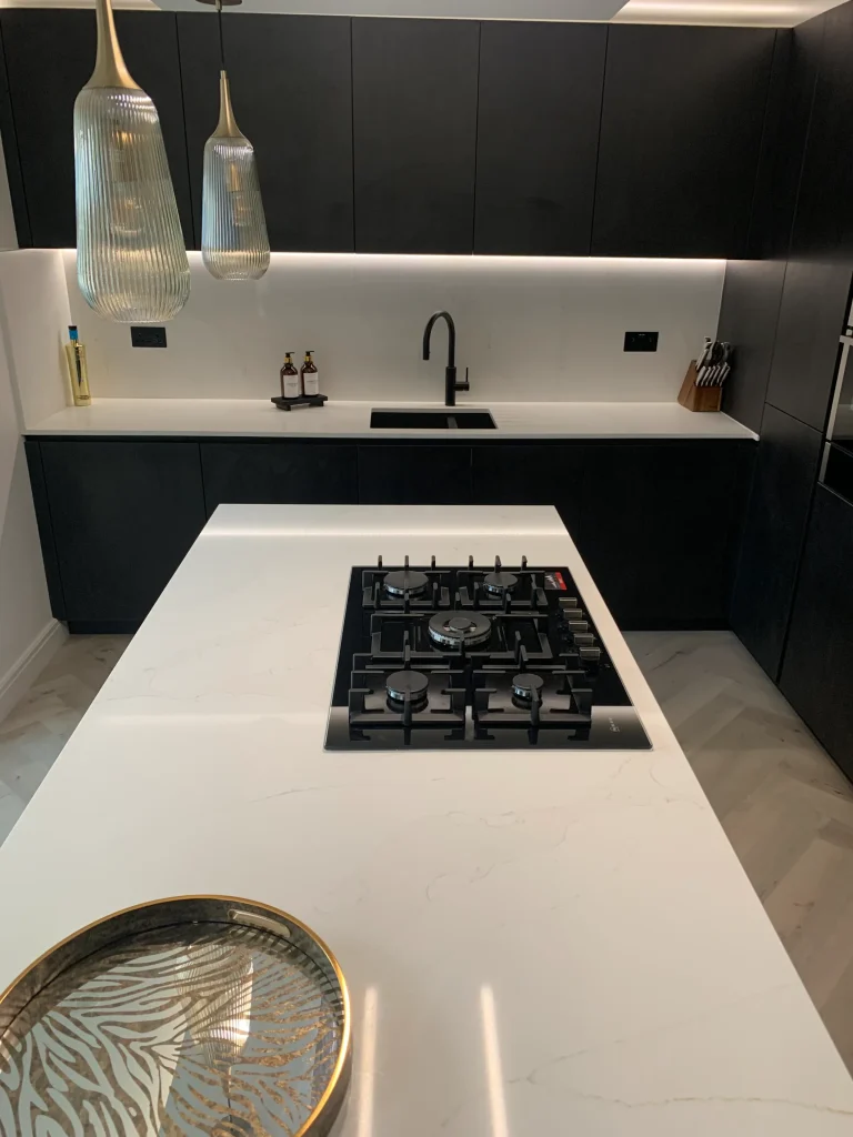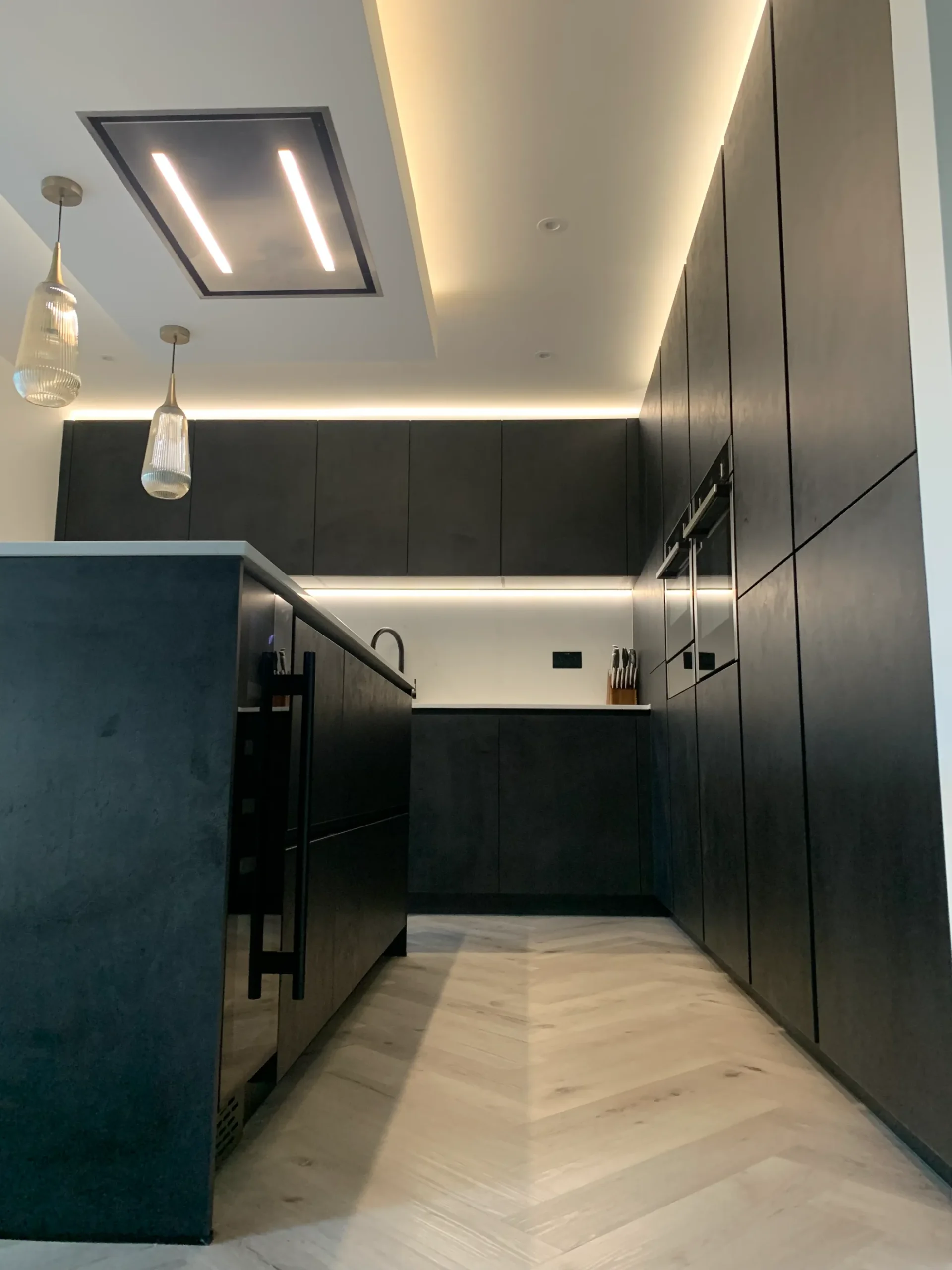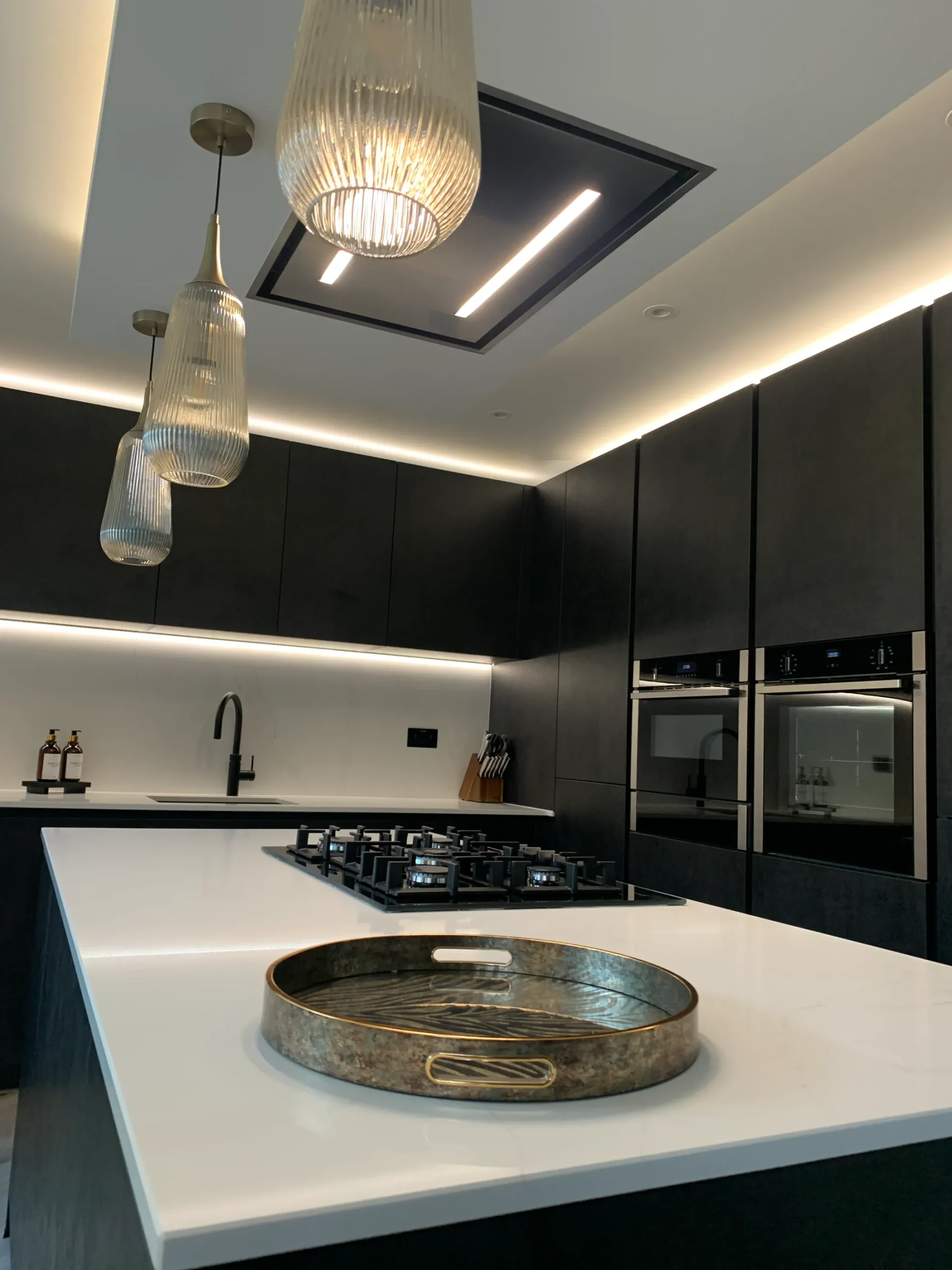 The layout is centred on an impressive island featuring a Neff gas-on-glass hob, offering a professional cooking experience within a refined aesthetic. Above, a purpose-built bulkhead houses a streamlined ceiling extractor and integrated feature lighting, casting warm metallic tones across the room to soften the industrial-inspired textures. Completed with high-end Neff appliances and the essential Quooker boiling hot water tap, this design is a true credit to the client’s vision—a simply beautiful space that feels both modern and timeless.