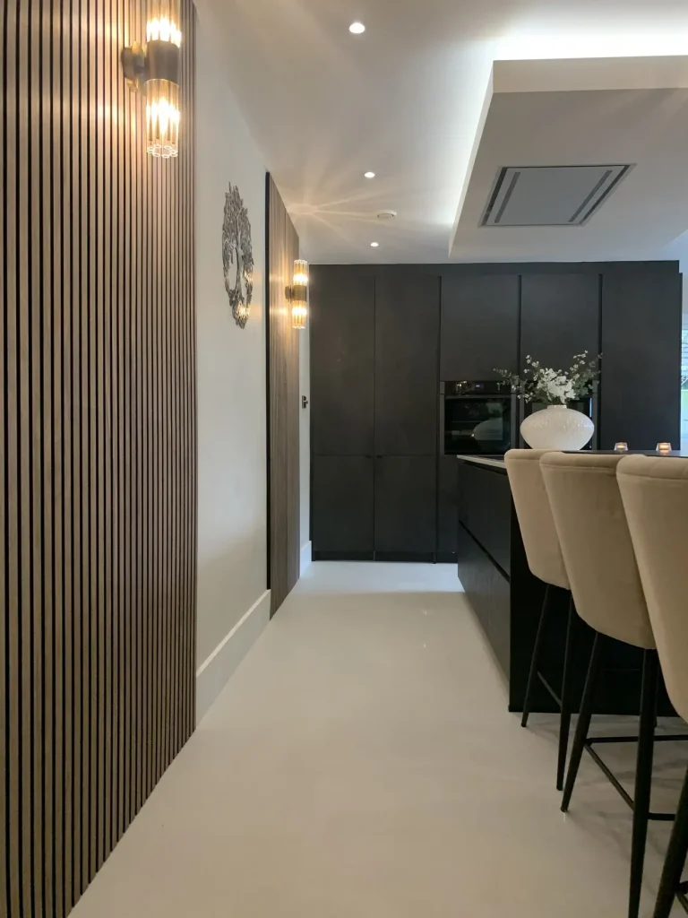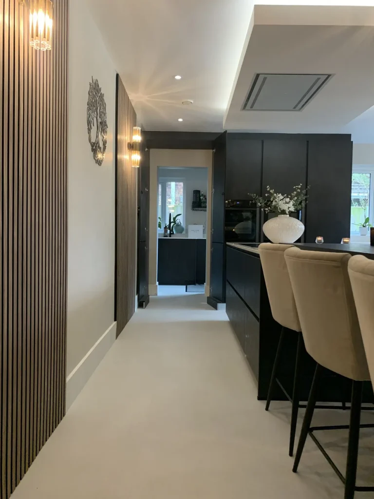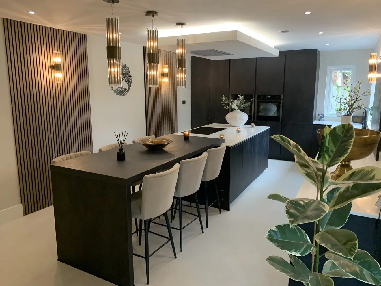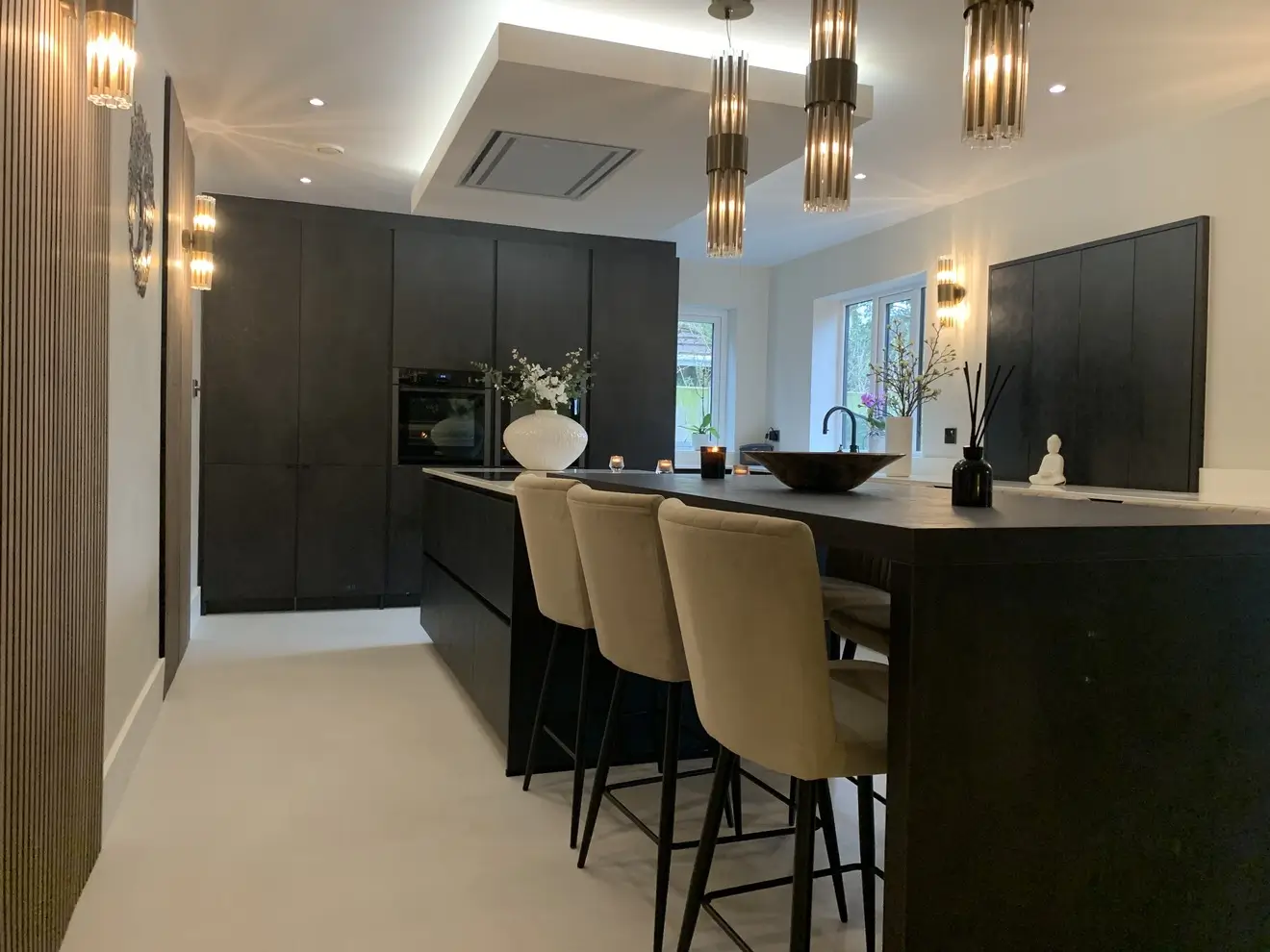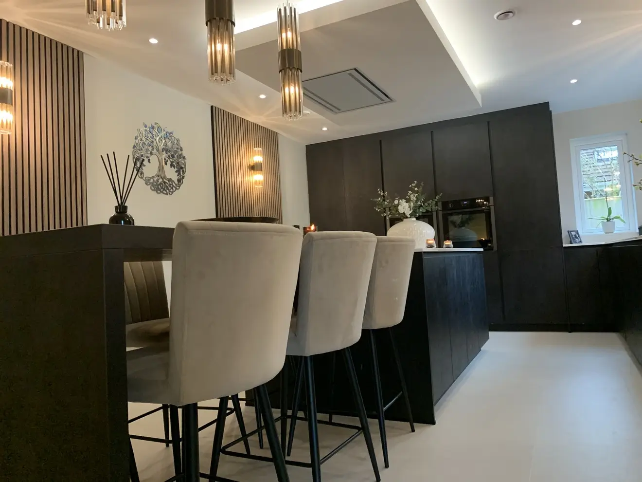 A large Neff induction hob sits seamlessly within the worktop, paired with a ceiling-mounted extractor set in a bespoke bulk head with soft, ambient lighting. A Quooker 3-in-1 tap offers instant hot, cold and filtered water, while a sleek bar table area makes this space perfect for entertaining.