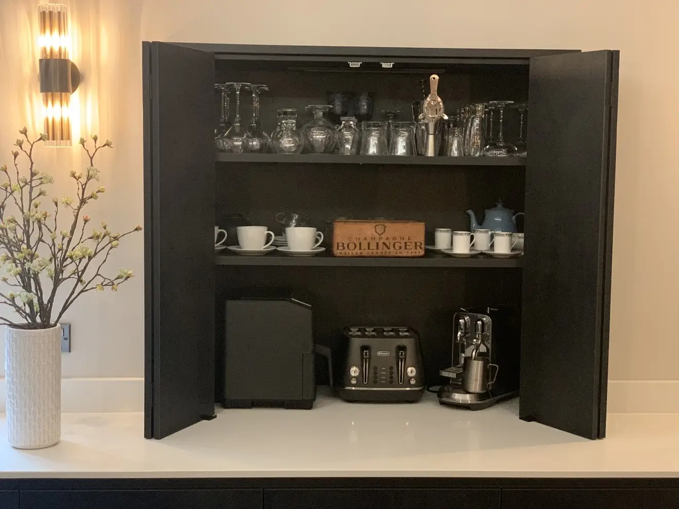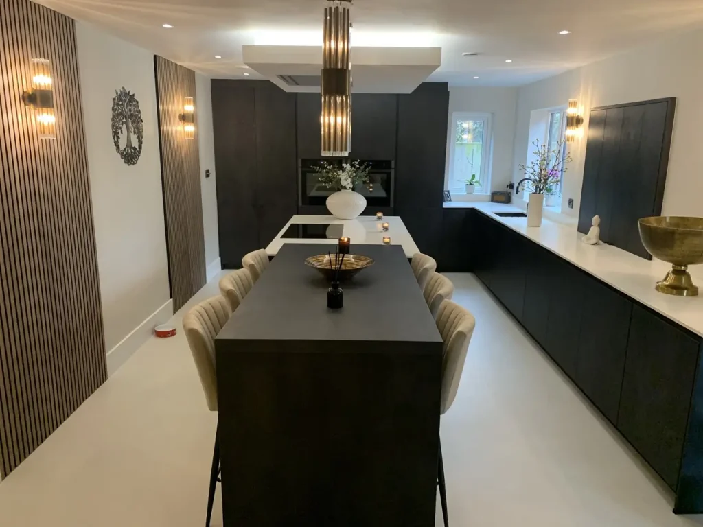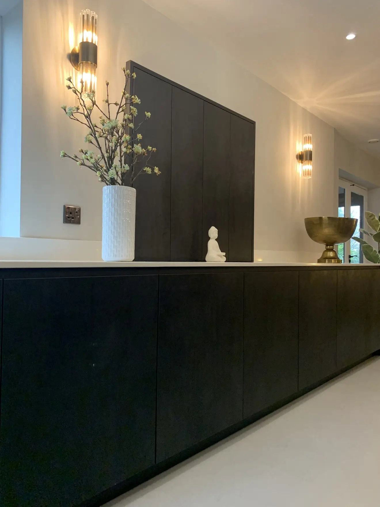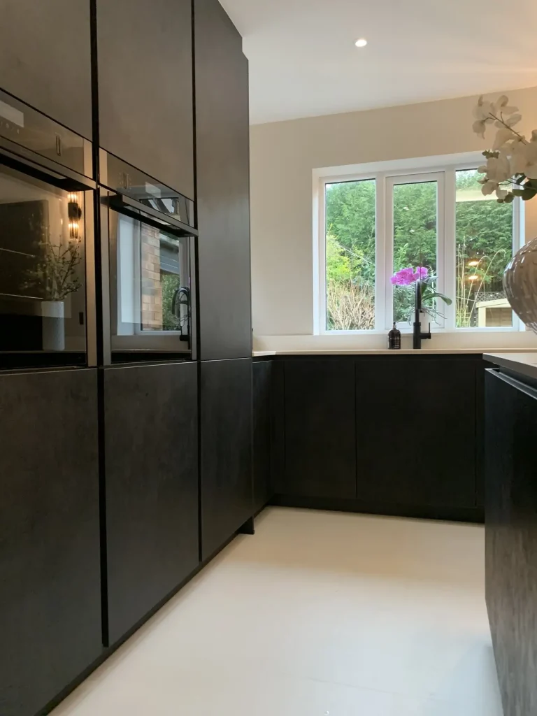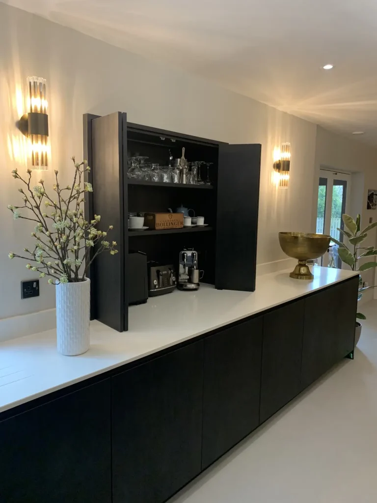 This German Häcker kitchen is the epitome of modern luxury, designed for bold aesthetics and effortless functionality. The rich cabinetry creates a dramatic statement, perfectly complemented by sleek quartz worktops – both elegant and durable.