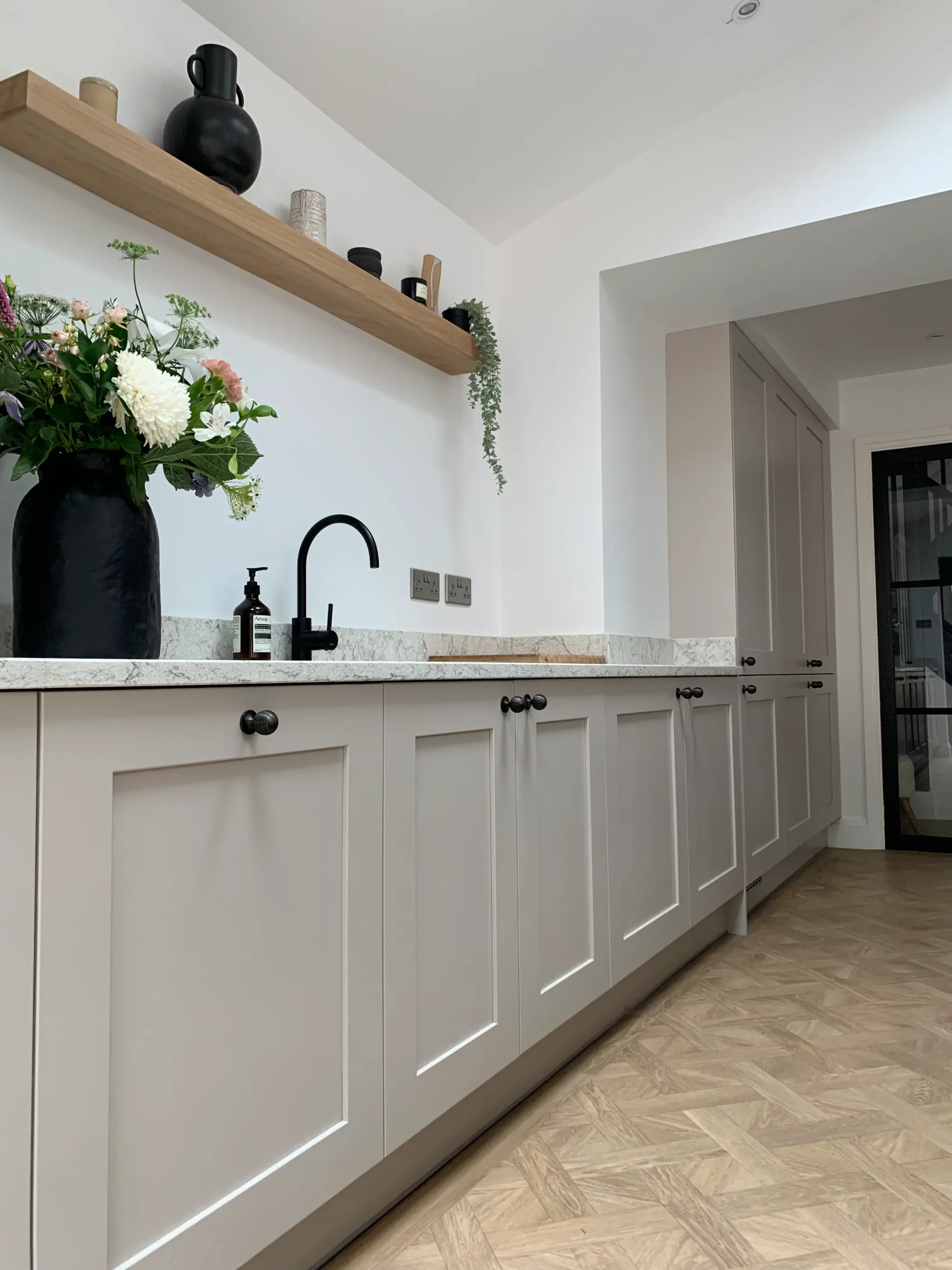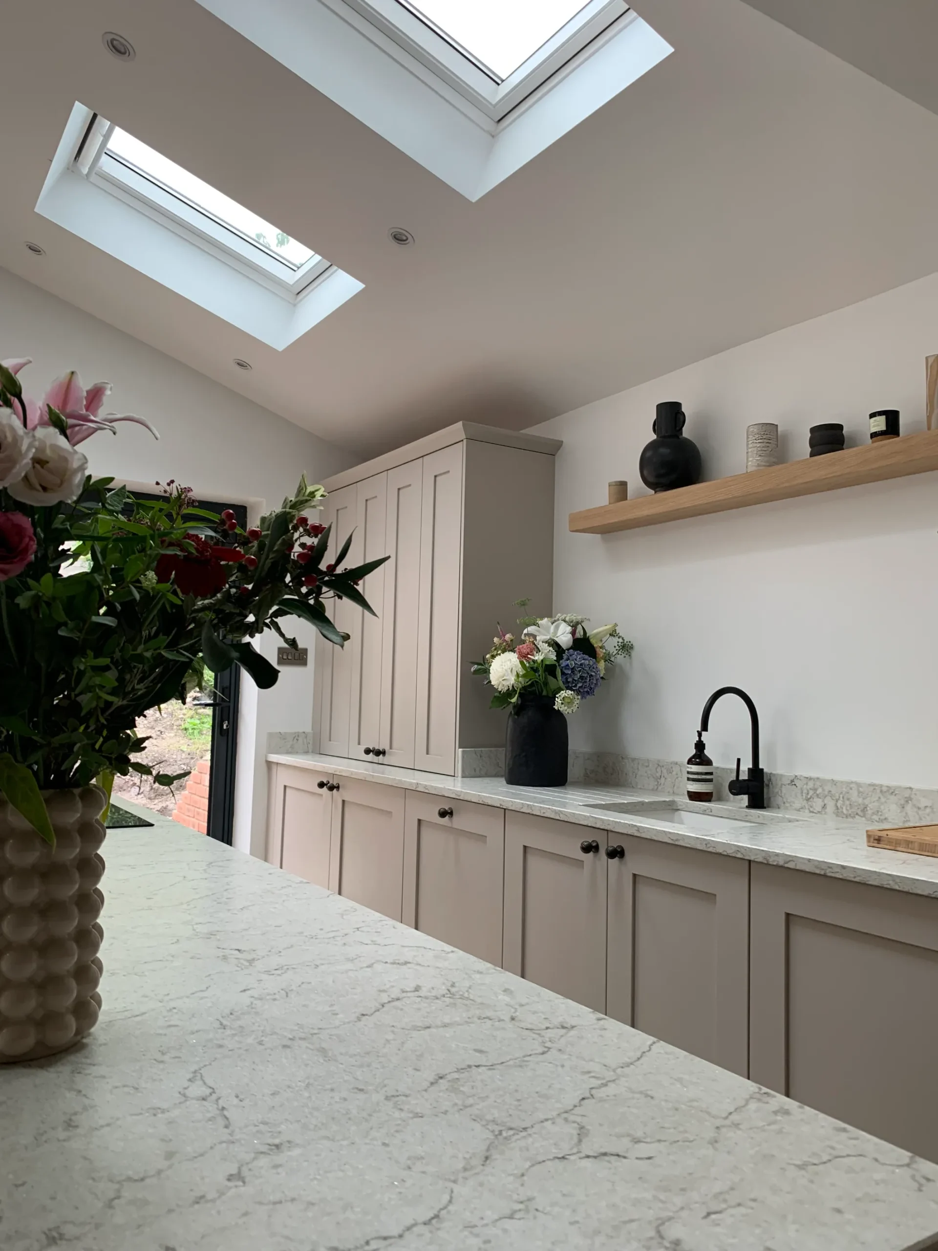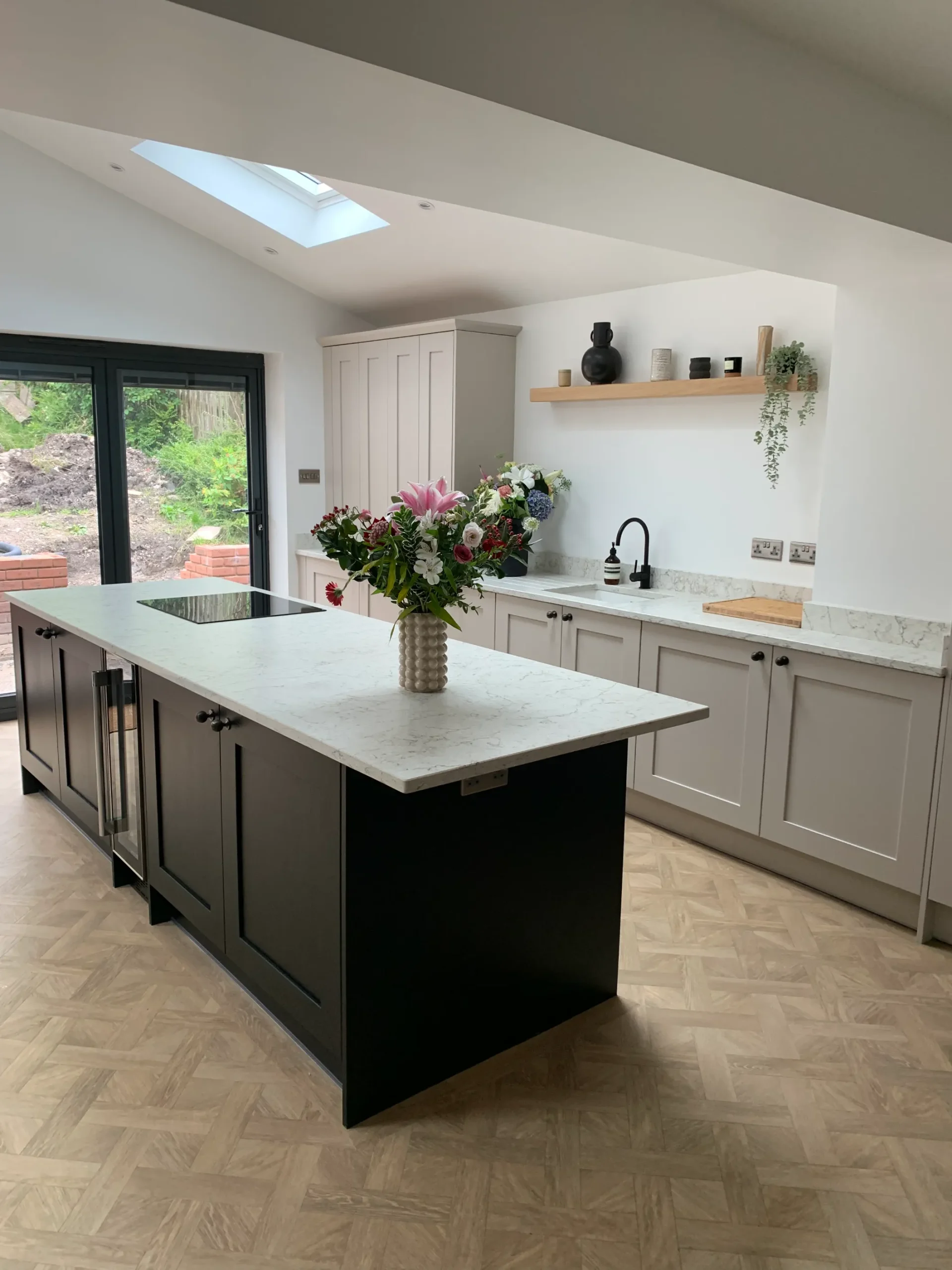 This kitchen is all about understated luxury and smart design. The bold black shaker-style island creates a striking focal point, softened by elegant quartz worktops that bring a fresh, modern feel.