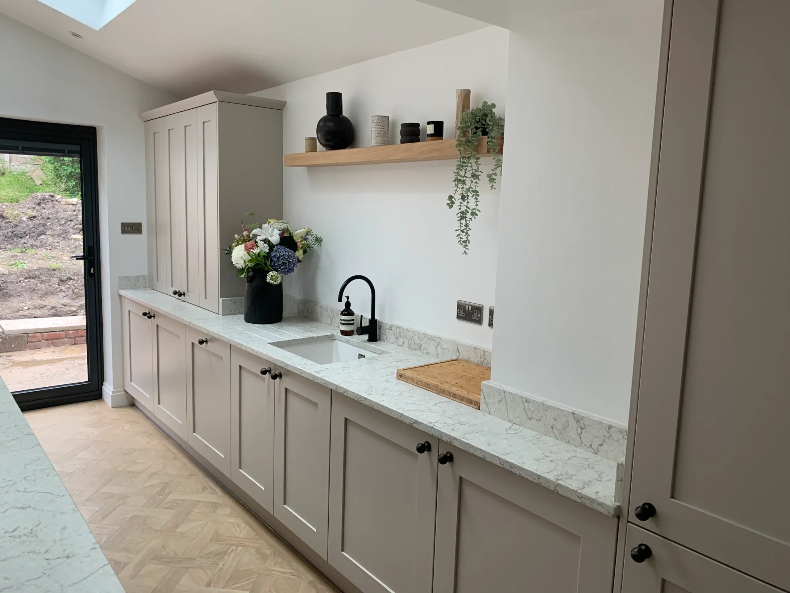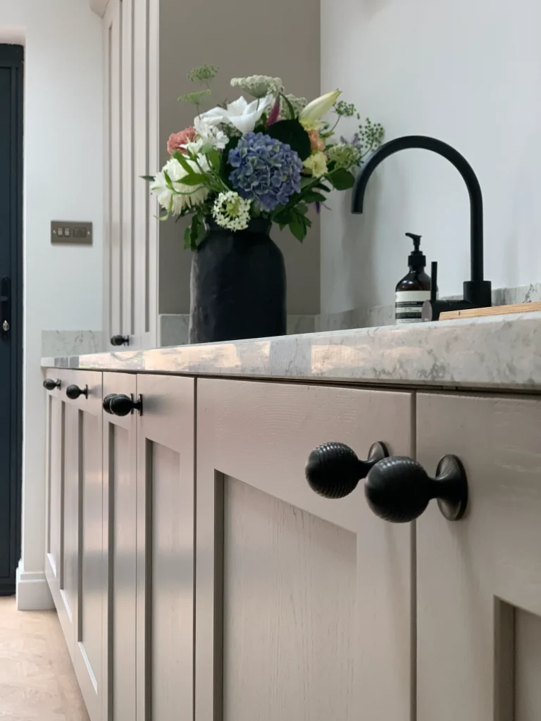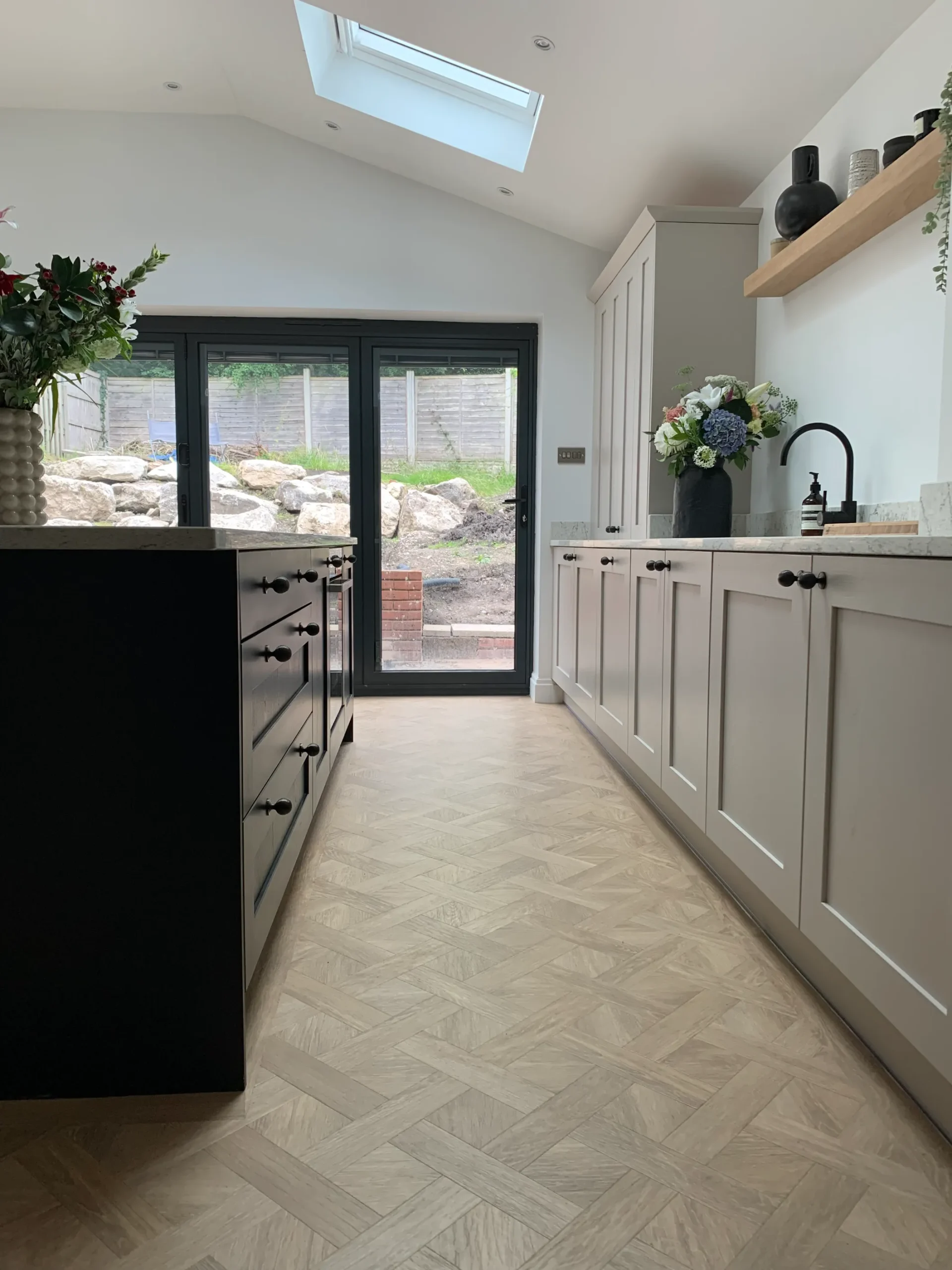 This kitchen is all about understated luxury and smart design. The bold black shaker-style island creates a striking focal point, softened by elegant quartz worktops that bring a fresh, modern feel.