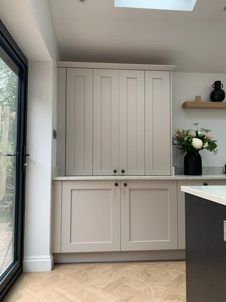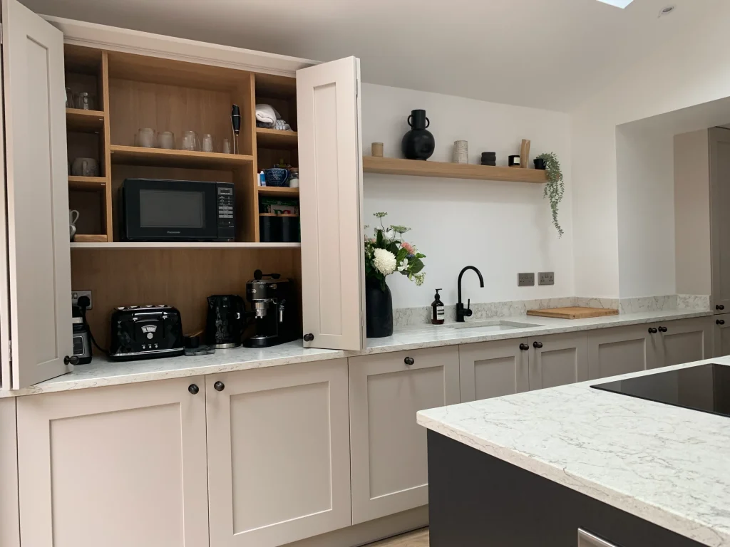 Practicality was just as important as style in this project. A sleek bi-fold pantry area keeps essentials neatly tucked away, while clever storage solutions ensure everything has its place. The result? A beautifully crafted space that feels as good as it looks – effortless, stylish, and built for real life.