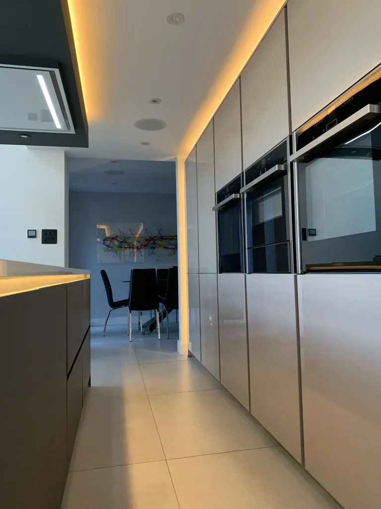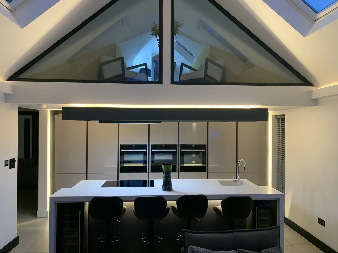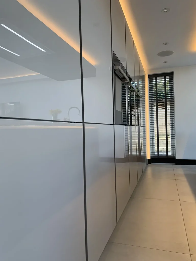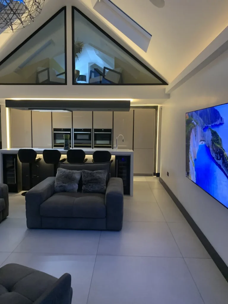 A sleek and sophisticated German Häcker designer kitchen, seamlessly blending gloss and matte finishes for a striking contrast. The large island, with its matte doors and quartz work surfaces offers both style and practicality, complete with premium Neff appliances and a Quooker instant boiling hot water tap for ultimate convenience. Designed with meticulous attention to detail, this space is perfect for both family life and entertaining. Set within a breath-taking glass vaulted ceiling room, natural light enhances the kitchen’s clean lines and modern elegance, creating an absolutely stunning space that is functional as it is visually impressive – a true testament to the clients.