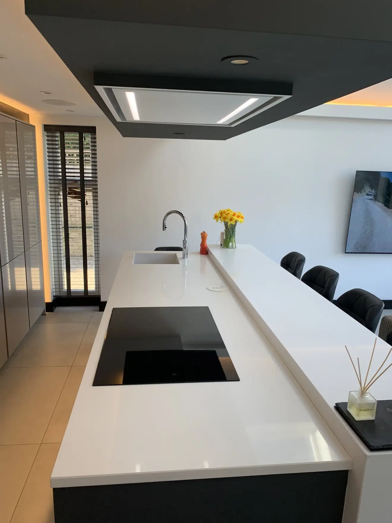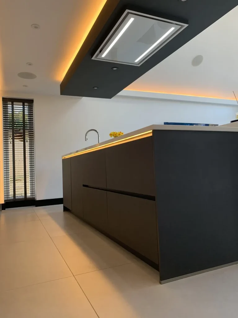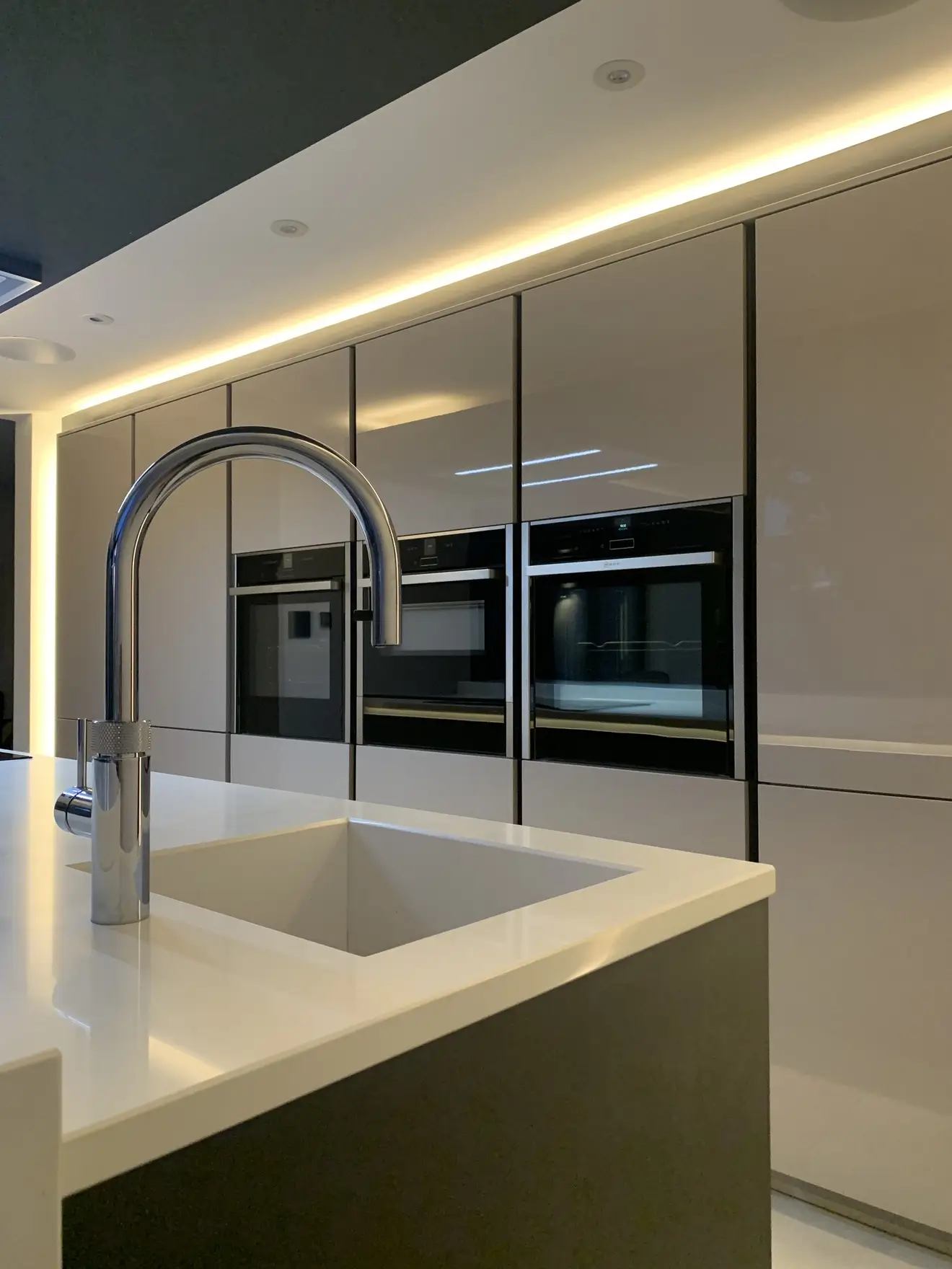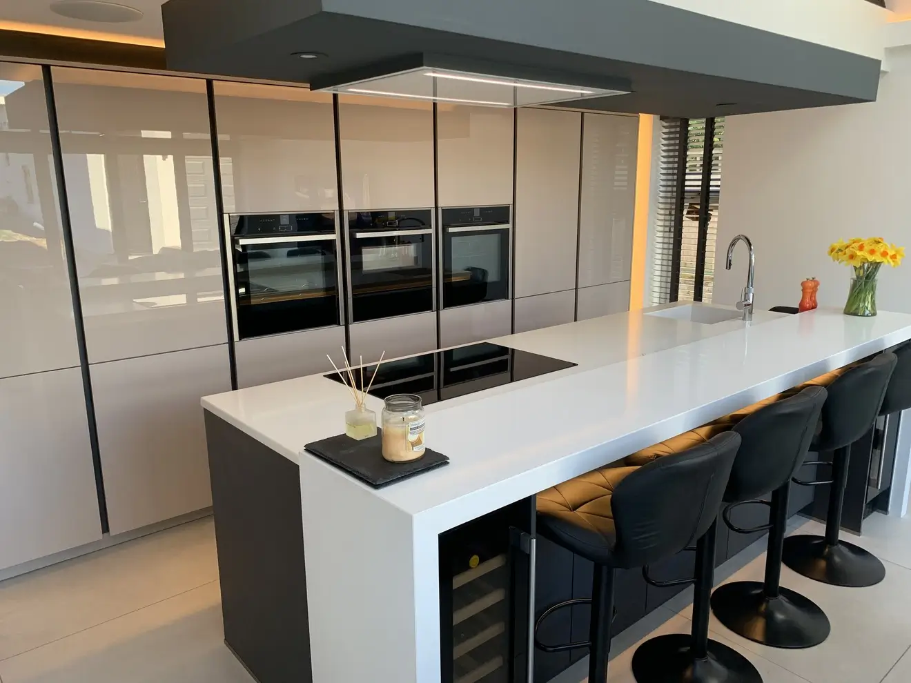 A sleek and sophisticated German Häcker designer kitchen, seamlessly blending gloss and matte finishes for a striking contrast. The large island, with its matte doors and quartz work surfaces offers both style and practicality, complete with premium Neff appliances and a Quooker instant boiling hot water tap for ultimate convenience. Designed with meticulous attention to detail, this space is perfect for both family life and entertaining. Set within a breath-taking glass vaulted ceiling room, natural light enhances the kitchen’s clean lines and modern elegance, creating an absolutely stunning space that is functional as it is visually impressive – a true testament to the clients.