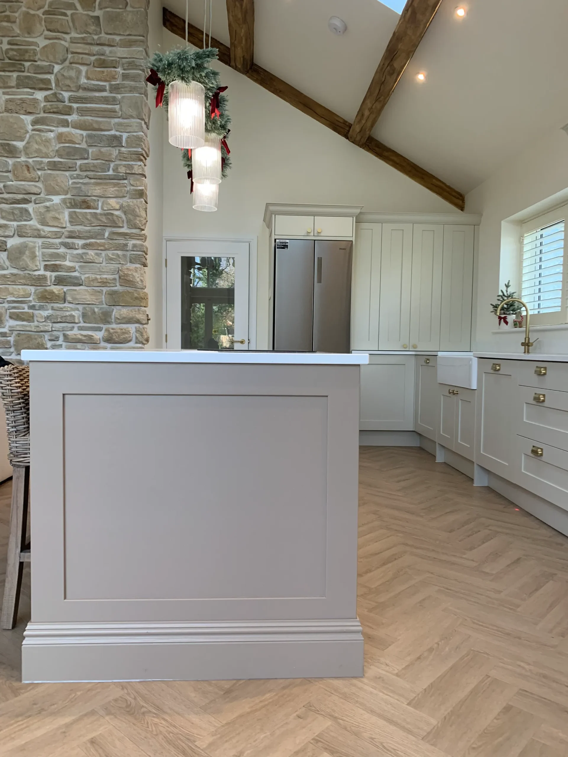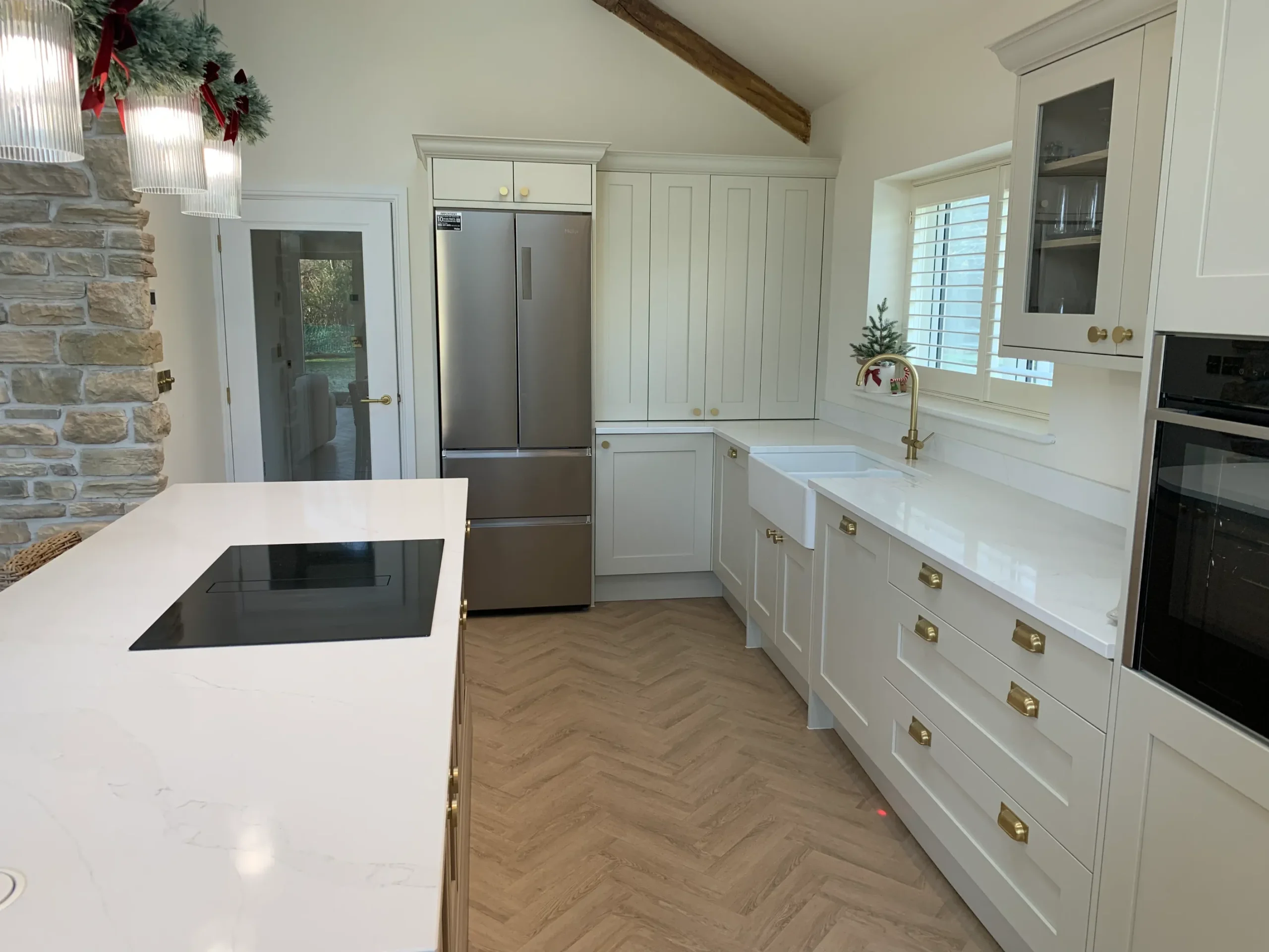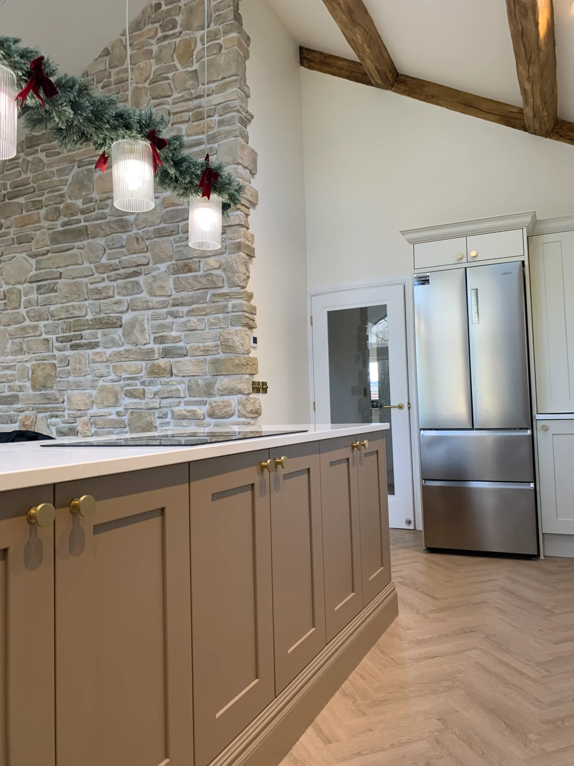 The heart of the room is the feature island, designed with a sleek skirting board plinth for a furniture-like feel. It houses a Neff induction hob with integrated downdraft ventilation, maintaining an open feel while providing a social seating area for guests. Topped with elegant quartz work surfaces that complement the natural texture of a feature stone wall, this kitchen is a truly timeless design that balances modern convenience with classic soul.