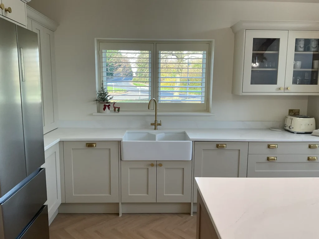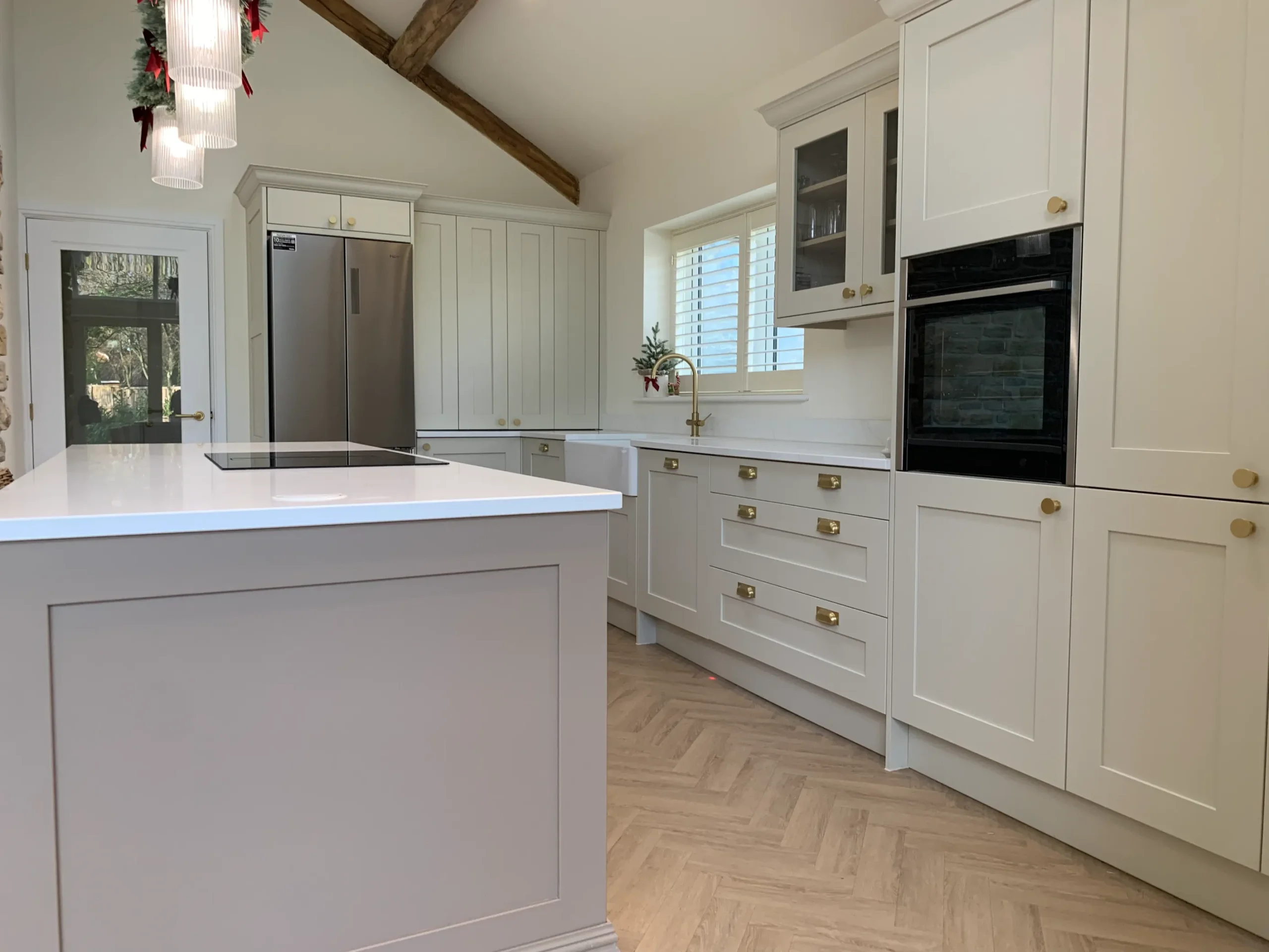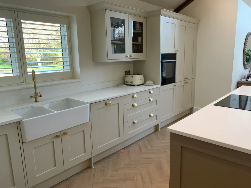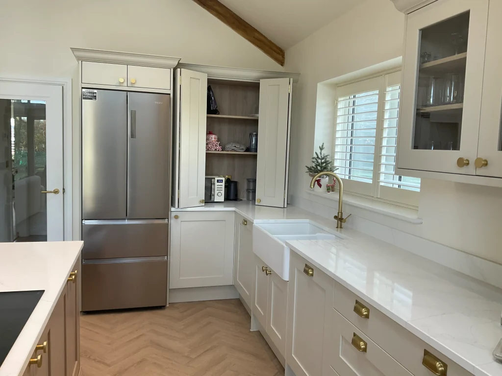 This shaker kitchen is a true blend of harmony, where warm painted tones and brushed brass fittings create a soft, inviting glow. Every element is designed for both beauty and ritual, from the classic butler’s sink to the elegant glass display cabinets that add a touch of light and depth. Clever storage is tucked away in a dedicated pantry with internal drawers, while a bespoke bi-fold door coffee station keeps morning essentials organized and out of sight.