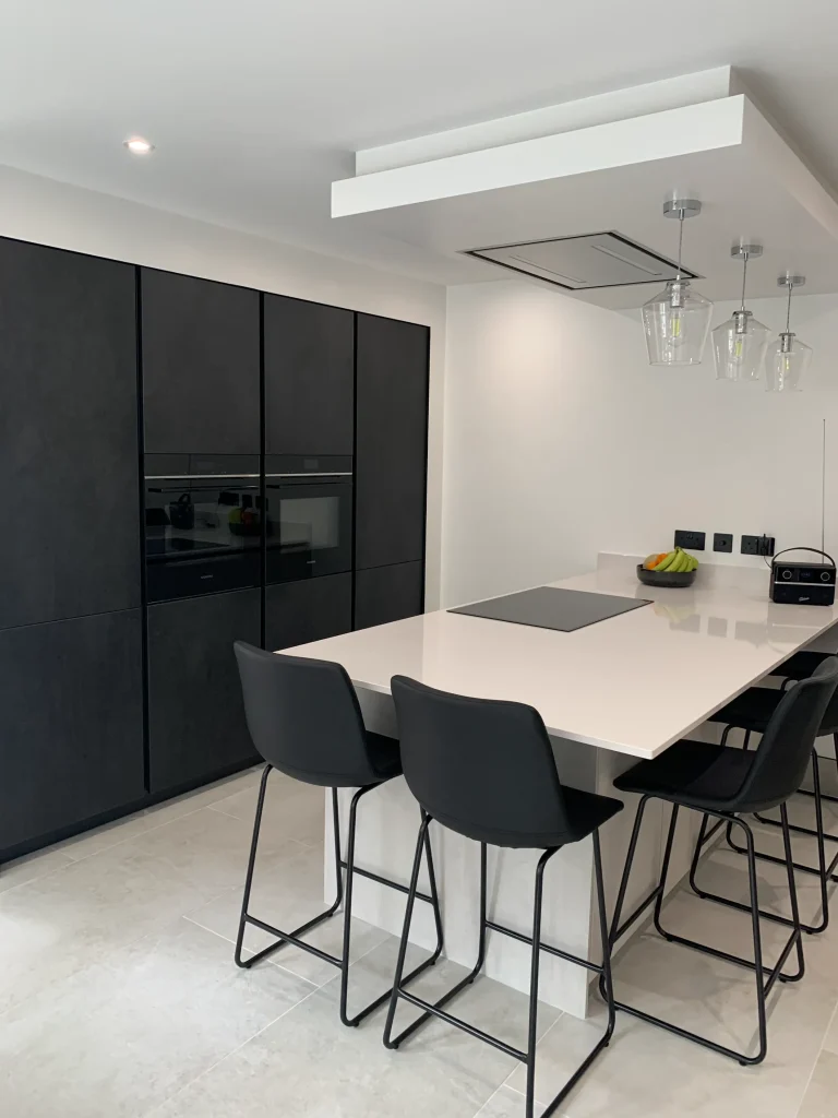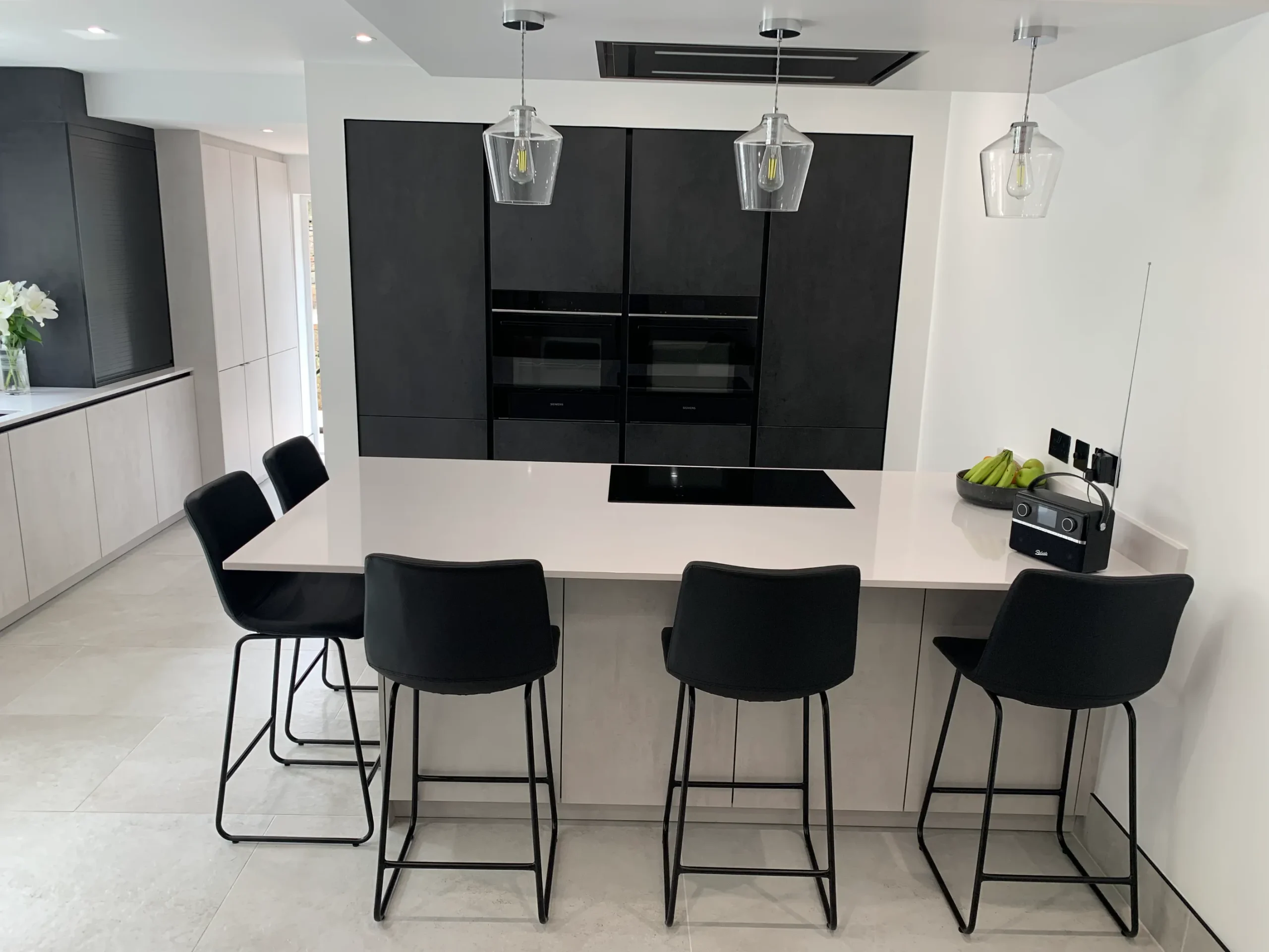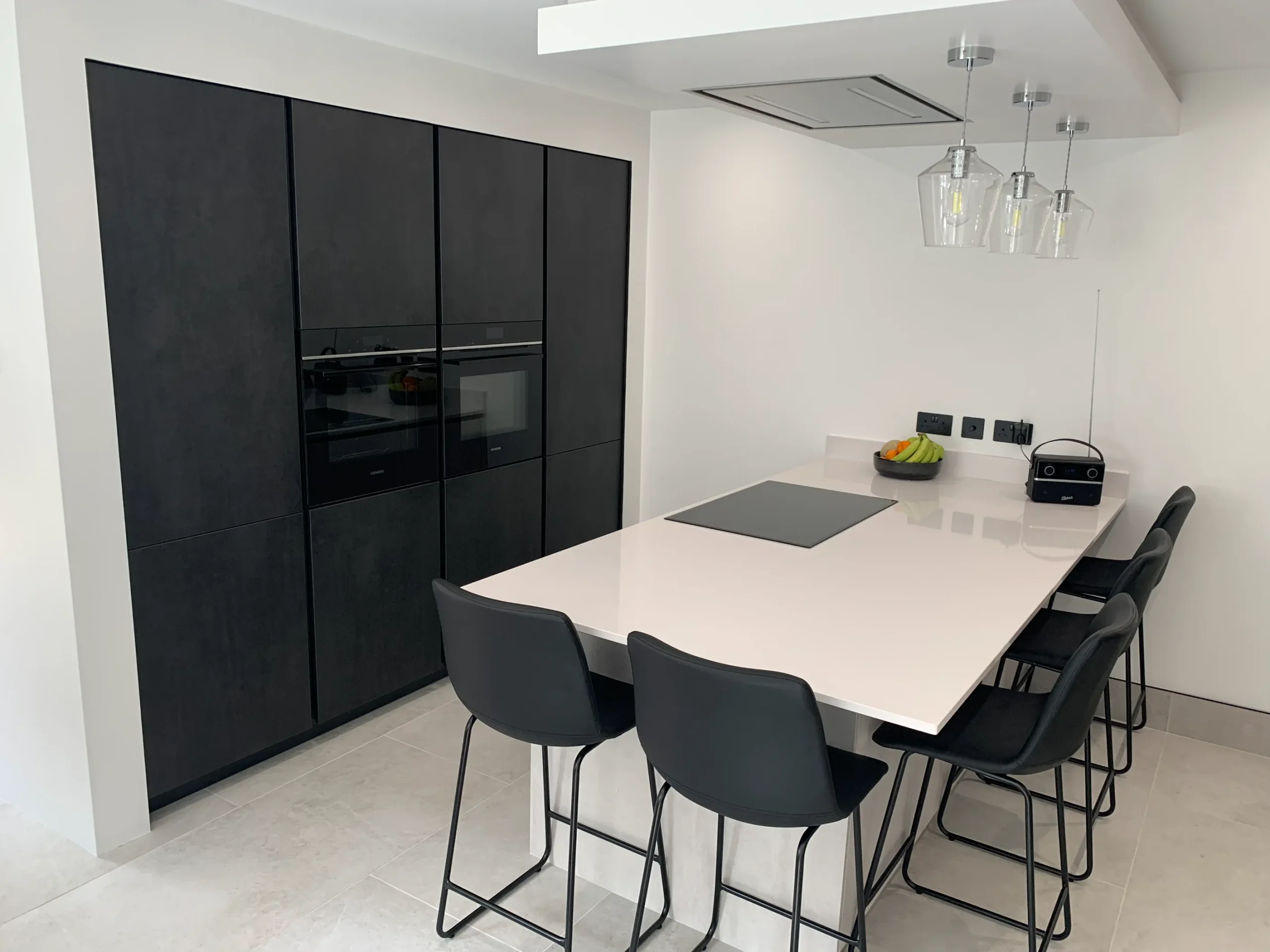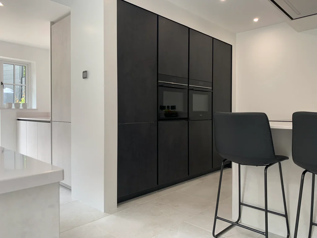 The layout features a sleek peninsula that serves as both a culinary zone and a social hub, housing a Siemens induction hob and comfortable bar seating. Above, a custom-built bulkhead integrates a streamlined ceiling extractor and feature lighting to perfectly frame the space. The tall cabinetry, finished with a bespoke surround, neatly houses integrated appliances and high-end Siemens ovens. Functionality is hidden in plain sight, with a black roller-shutter coffee station and a Quooker instant boiling hot water tap leading the way to a cleverly concealed utility area for the washer, dryer, and extra storage. Wrapped in premium quartz work surfaces, this design is a stunning example of how a minimalist aesthetic can cater perfectly to the needs of a busy family home.