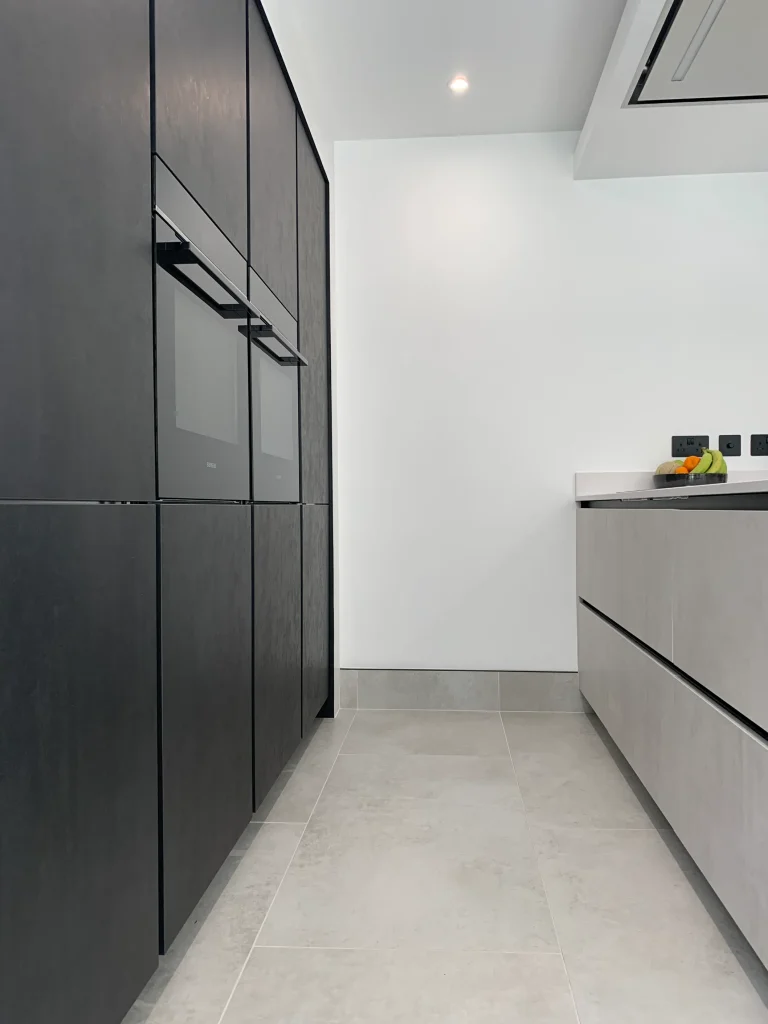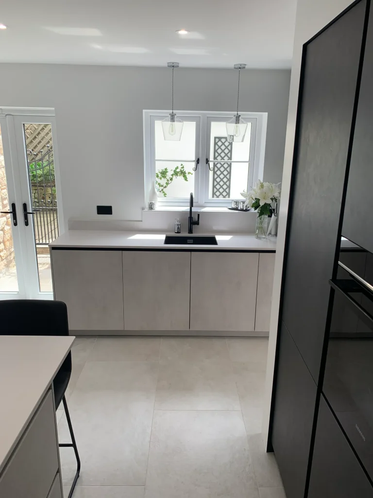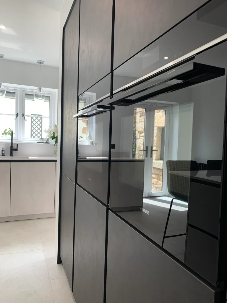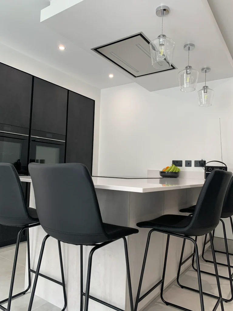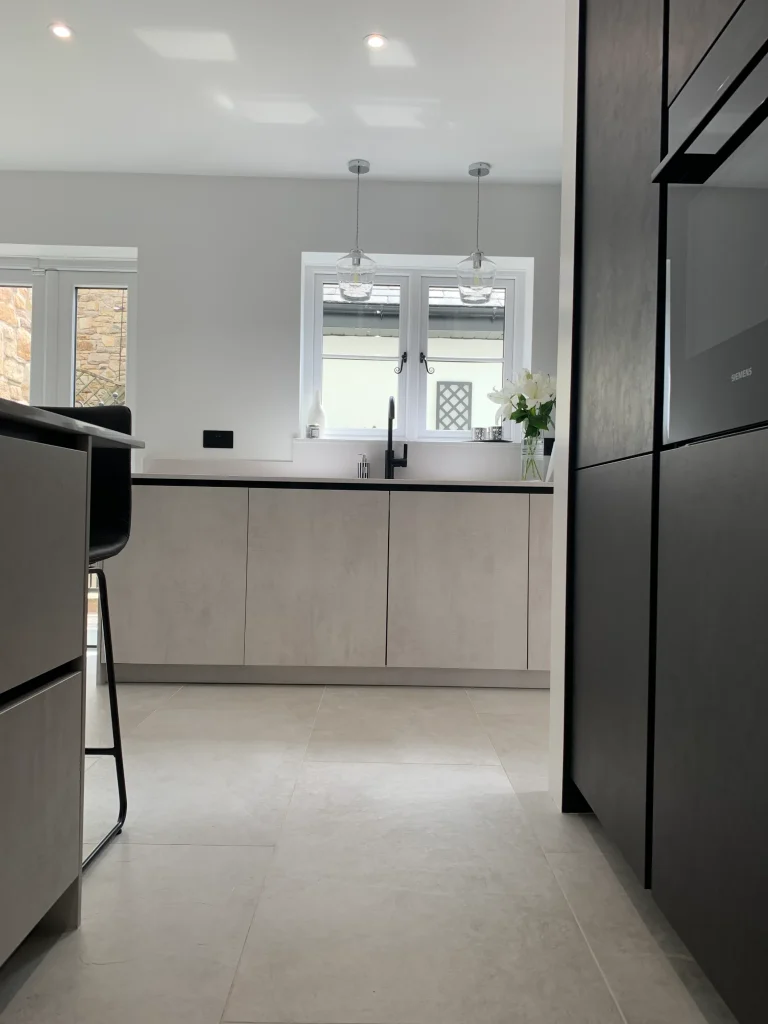 The layout features a sleek peninsula that serves as both a culinary zone and a social hub, housing a Siemens induction hob and comfortable bar seating. Above, a custom-built bulkhead integrates a streamlined ceiling extractor and feature lighting to perfectly frame the space. The tall cabinetry, finished with a bespoke surround, neatly houses integrated appliances and high-end Siemens ovens. Functionality is hidden in plain sight, with a black roller-shutter coffee station and a Quooker instant boiling hot water tap leading the way to a cleverly concealed utility area for the washer, dryer, and extra storage. Wrapped in premium quartz work surfaces, this design is a stunning example of how a minimalist aesthetic can cater perfectly to the needs of a busy family home.