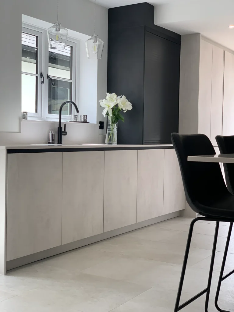 This Häcker German kitchen oozes sophistication in this monochrome design, expertly pairing contrasting black and pearl white concrete-finish doors for a sharp, ultra-modern look.