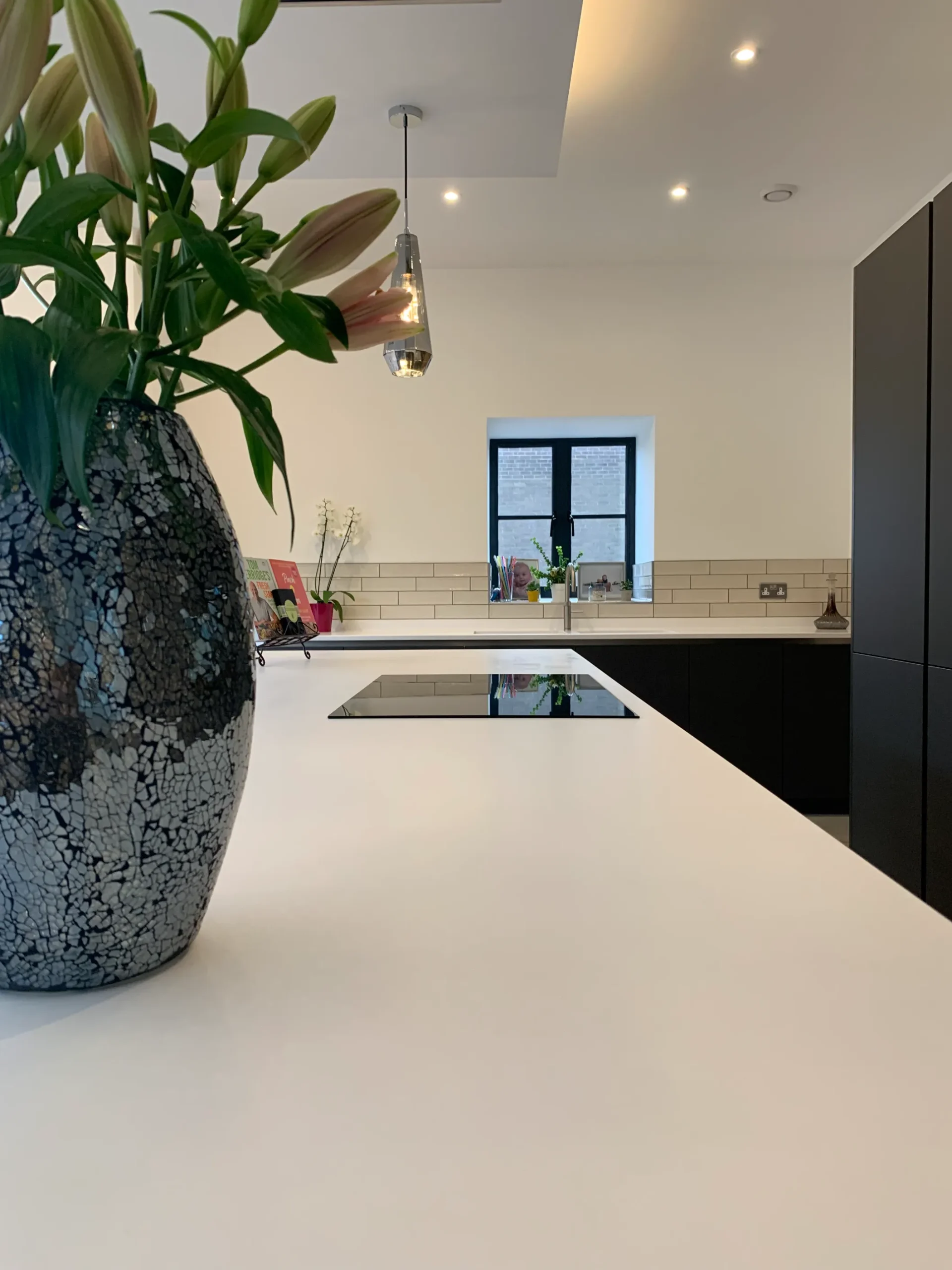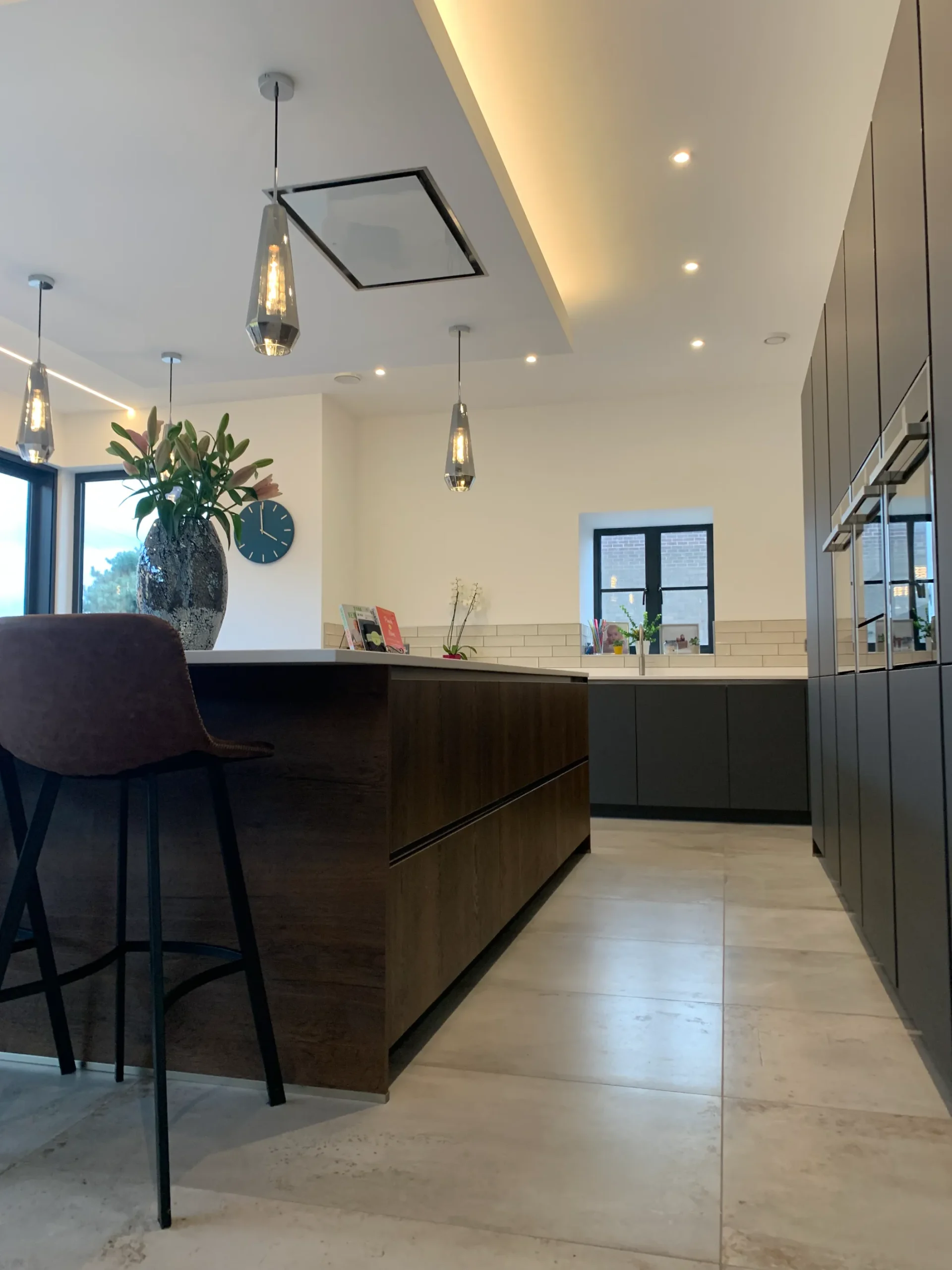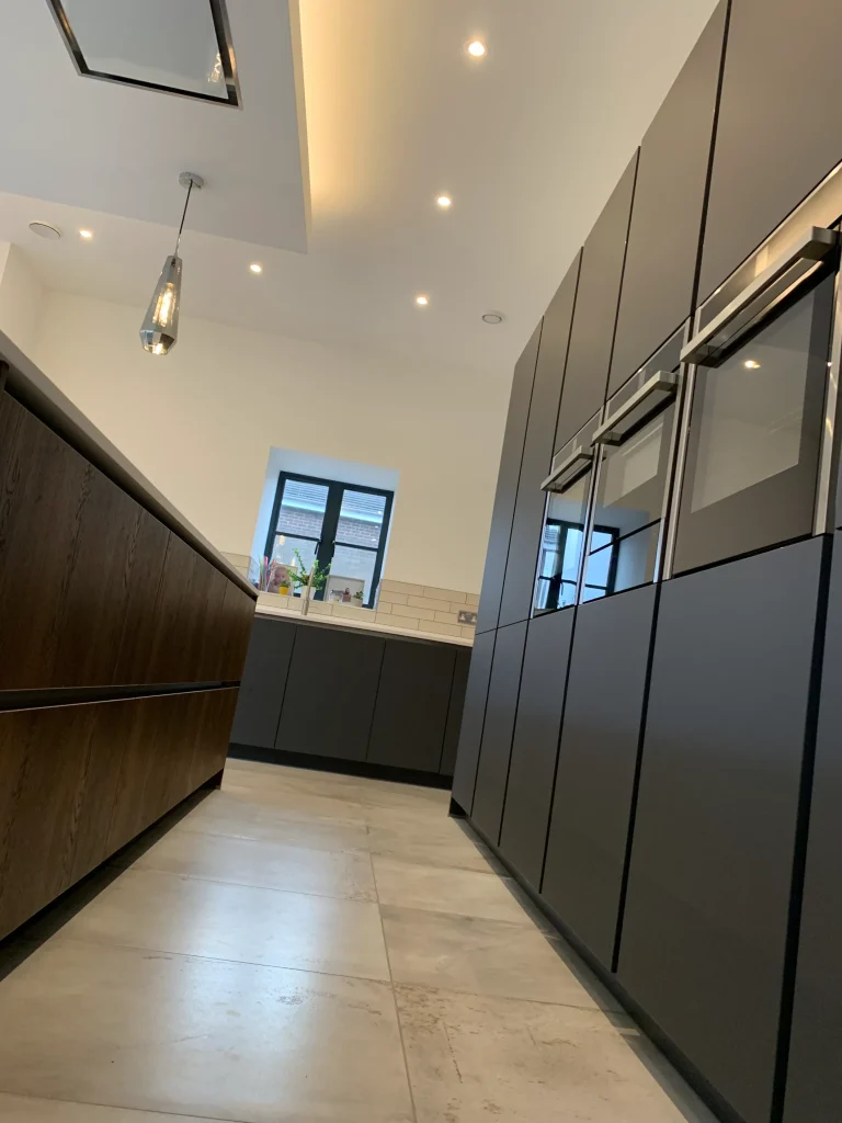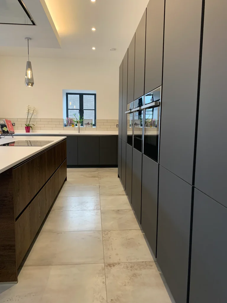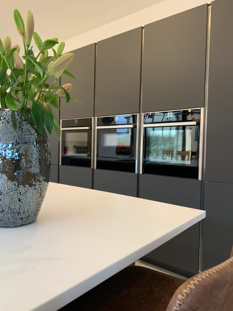 This Häcker German kitchen is a masterstroke of design, expertly blending sleek modernism with the rustic charm of a traditional stone barn. Standing proud against the original architecture are the tall storage units in a matt graphite finish, housing a full suite of integrated Neff ovens and appliances.