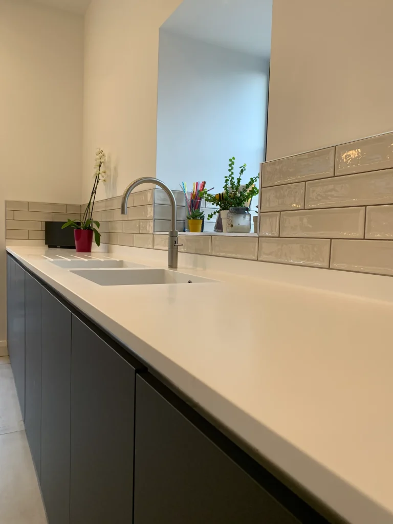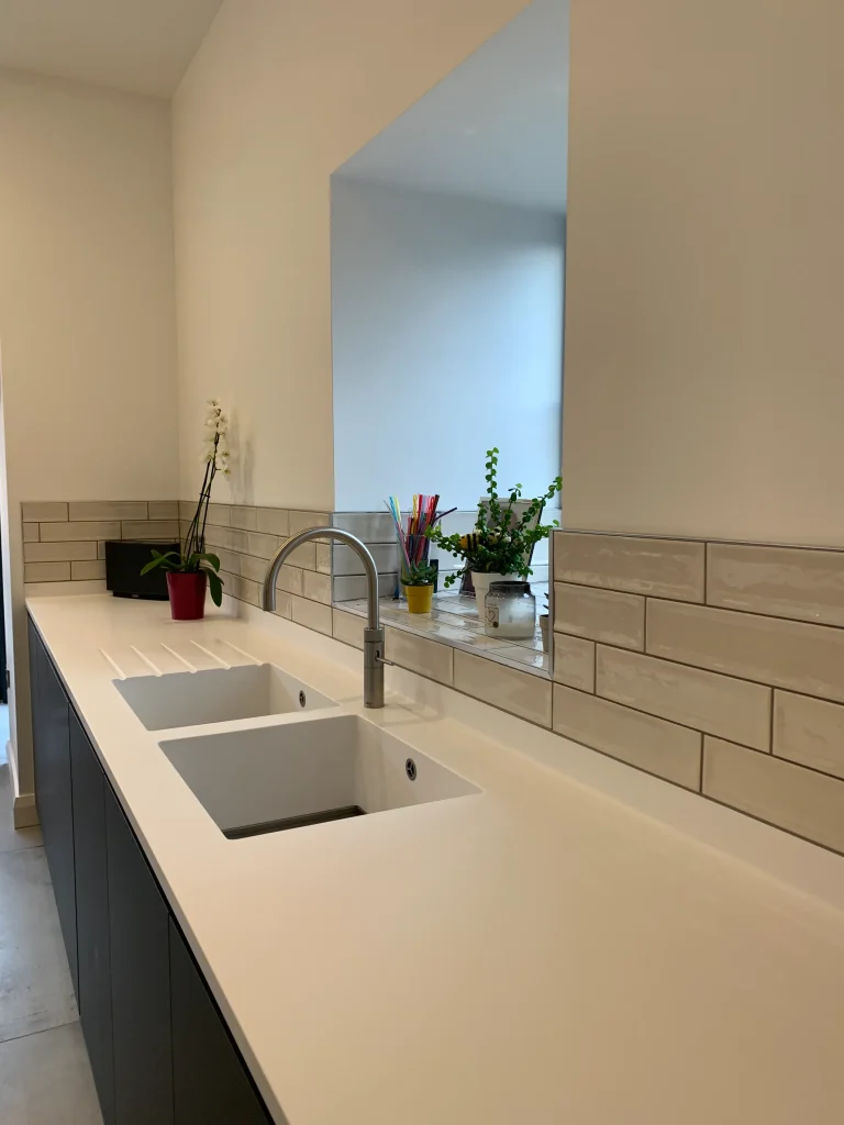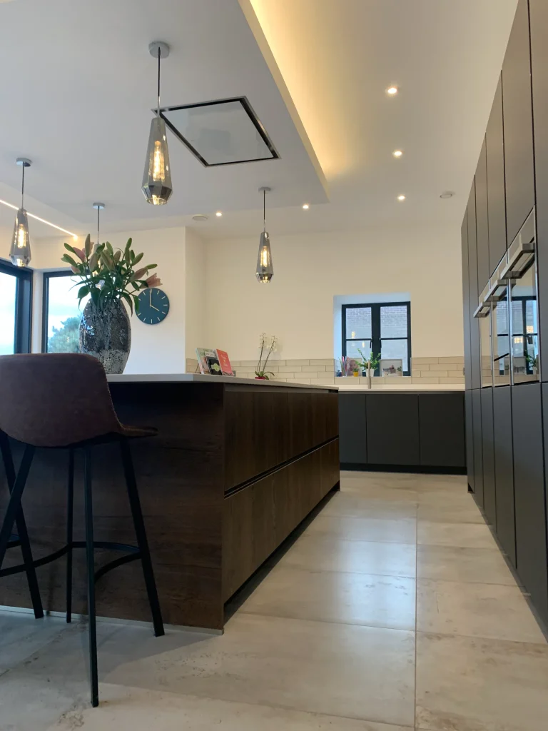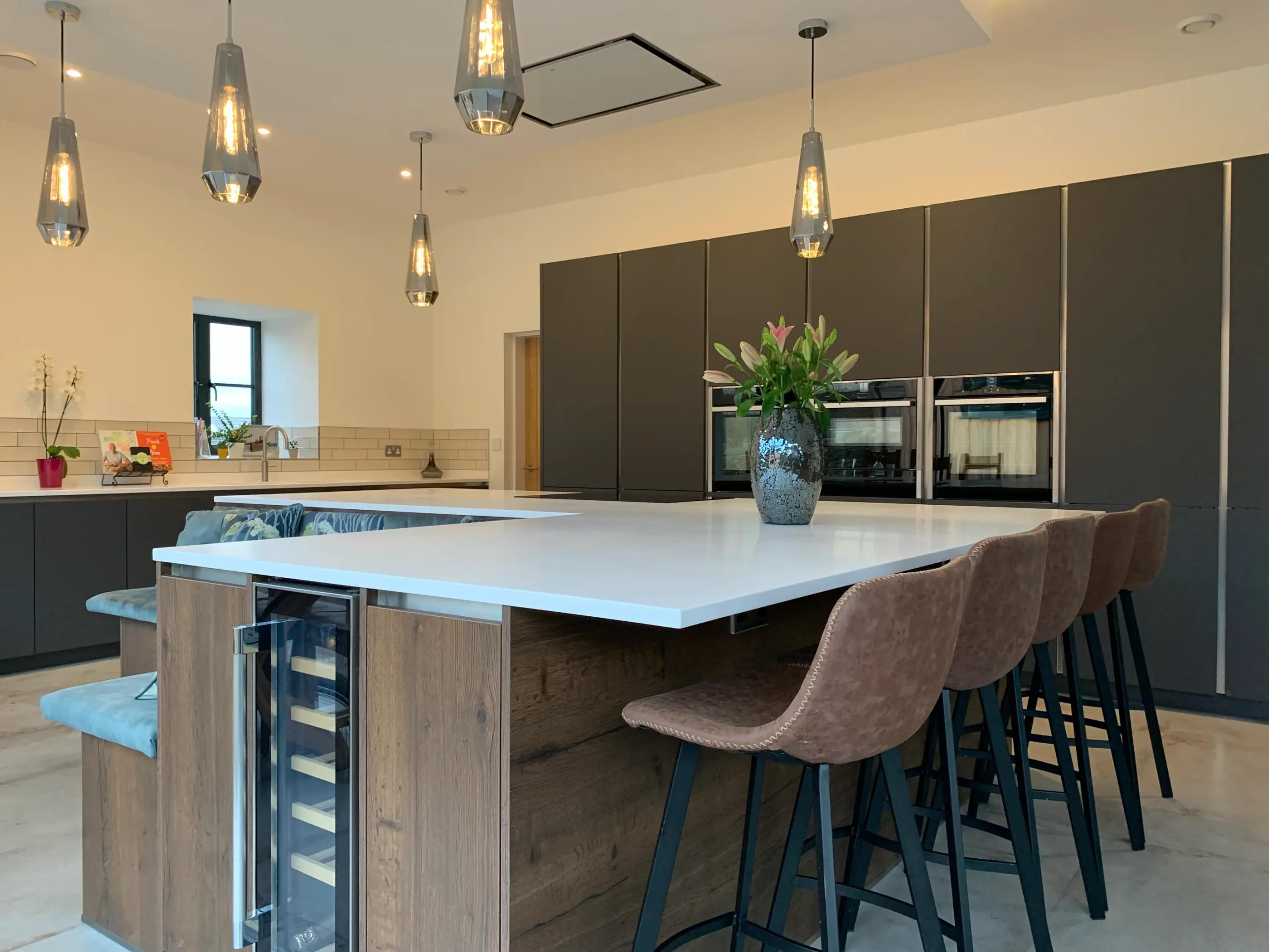 The focal point is the striking “L” shaped kitchen island finished in warm antique oak, which brilliantly incorporates built-in bench seating for a seamless dining experience. Positioned for both cooking and socializing, the island features a Neff induction hob set beneath a custom bulkhead with a ceiling-mounted extractor and atmospheric feature lighting. For ultimate practicality, the sink area is equipped with a Quooker instant boiling hot water tap and a sleek moulded double sink, all perfectly unified by high-end Corian work surfaces. It is a truly amazing transformation that respects its heritage while embracing modern luxury.