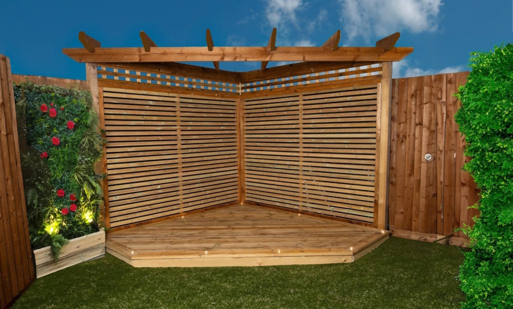 Revamp your outdoor living with our Triangular Base Wooden Decking Construction Kit! Designed to maximize space and style, this unique deck configuration adds a modern flair to your garden while optimizing functionality. The wooden back panels offer both privacy and aesthetic appeal, creating a cozy retreat for relaxation or socializing. Crowned with a pergola, it provides shelter and charm, making your garden more inviting throughout the seasons. Assembling effortlessly in kit form, this deck is a breeze to install, instantly enhancing your outdoor space and making it more enjoyable for everyday use.
